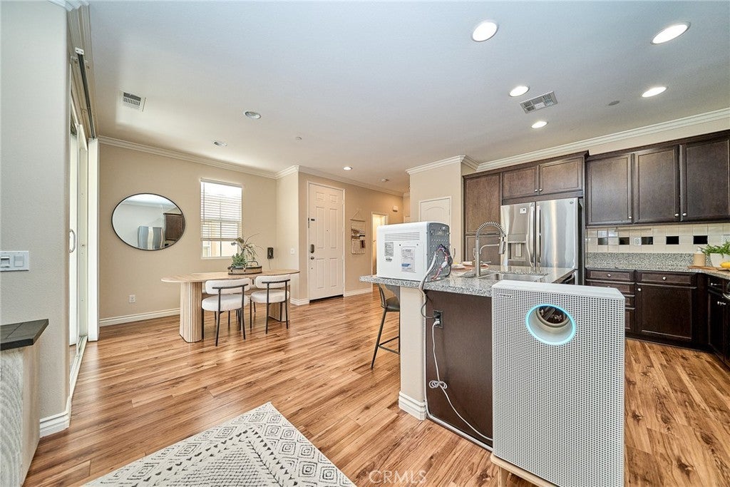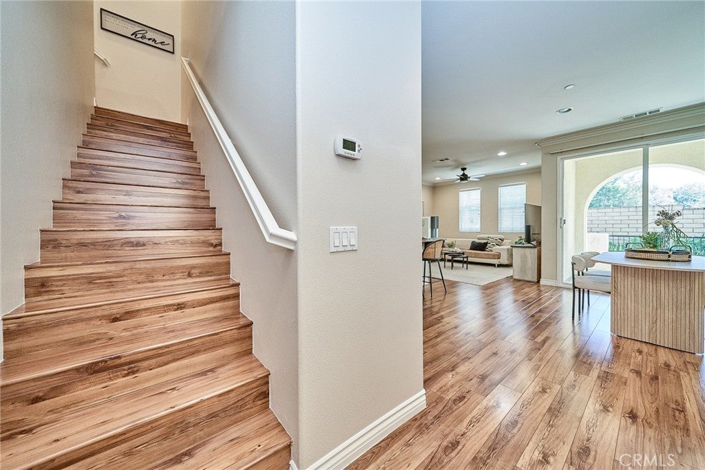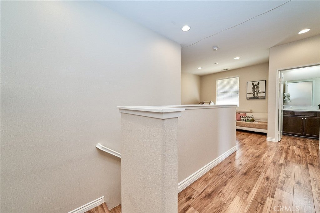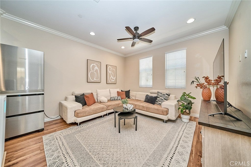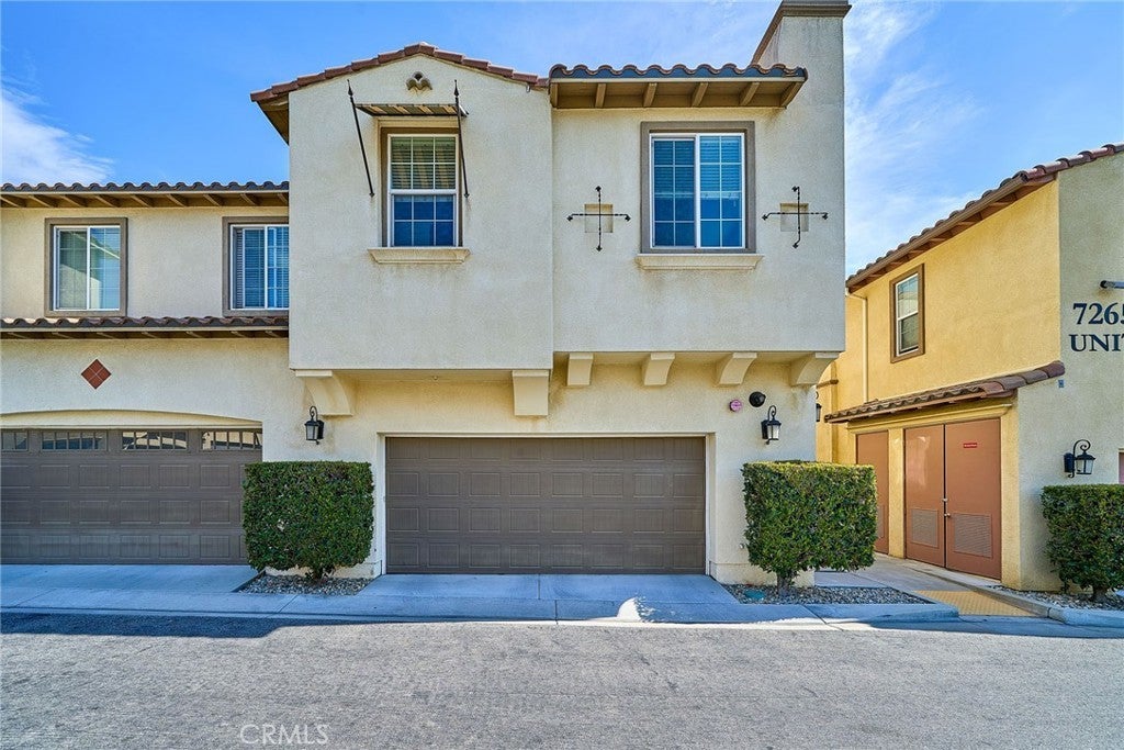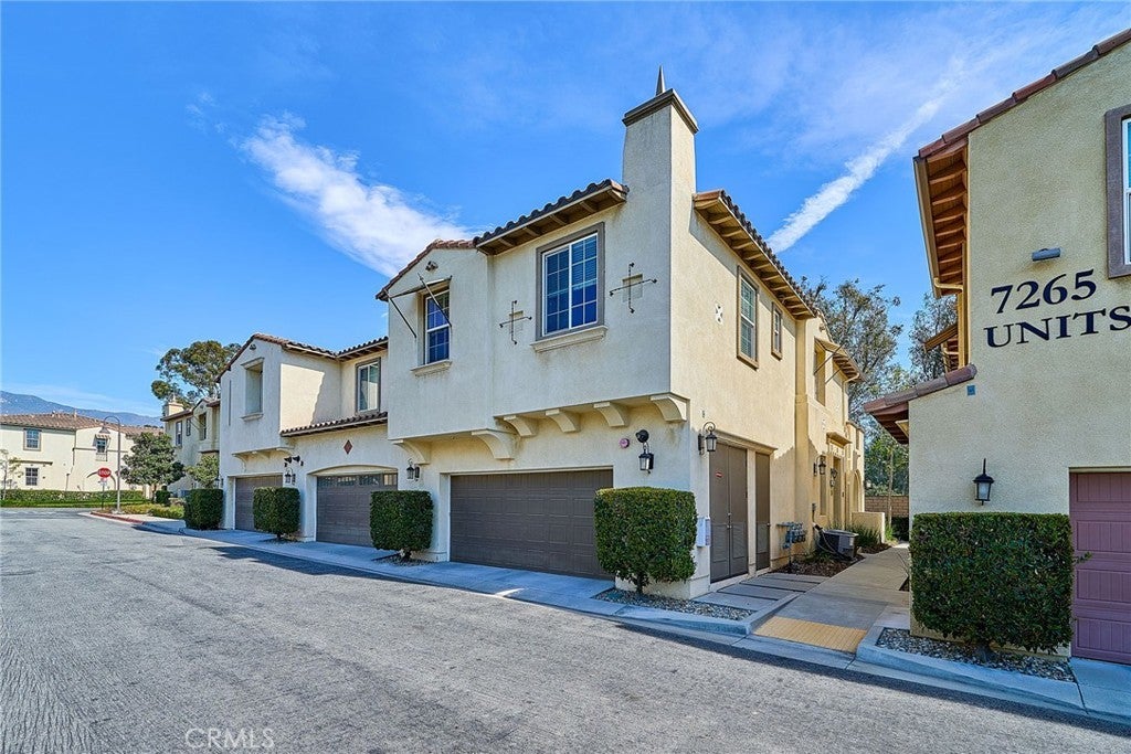 Welcome to this beautiful End Unit townhome, ideally situated on a premium corner lot in Elevage, one of the most desirable gated communities in Rancho Cucamonga. This beautifully appointed residence offers the perfect blend of style, comfort, and convenience. Residents of Elevage enjoy resort style amenities, including a sparkling pool and spa framed by swaying palm trees, as well as built-in BBQ areas that create a true everyday vacation atmosphere. Step inside to a stunning great room showcasing an open concept design, high ceilings, abundant natural light, and elegant laminate flooring throughout. The gourmet kitchen is thoughtfully appointed with granite countertops, an expansive center island, stainless steel sink, rich dark wood cabinetry, stainless steel appliances, and recessed lighting that enhances both form and function. The kitchen flows seamlessly into the dining area and spacious family room, where a large sliding glass door opens to your private patio, perfect for entertaining guests or enjoying peaceful evenings outdoors. Upstairs, you’ll find a versatile loft ideal for a home office or media space, a convenient laundry room with ample storage, a beautifully upgraded full bathroom, and two generously sized secondary bedrooms. The luxurious primary suite is privately tucked down the hall and features its own balcony retreat. Bathrooms throughout the home showcase tasteful upgrades and modern finishes. Additional highlights include direct access to a two-car attached garage and an energy-efficient tankless water heater. Ideally located just minutes from major freeways, premier shopping and dining at Victoria Gardens, outdoor recreation at Windrows Park, and within the highly acclaimed Etiwanda School District, this exceptional home offers the lifestyle you’ve been waiting for.