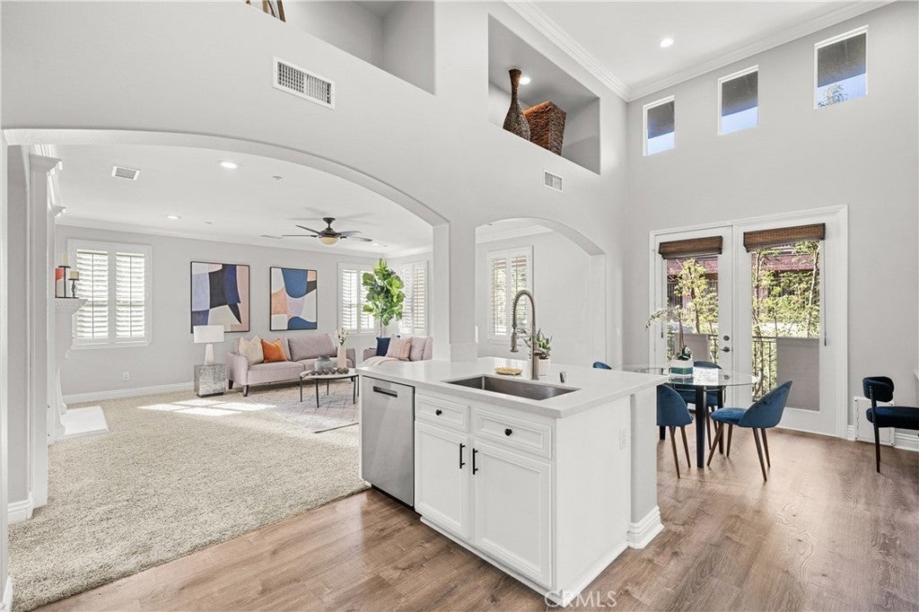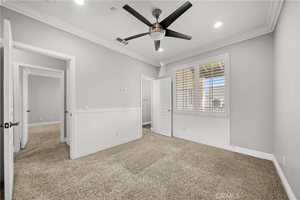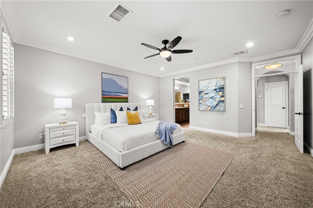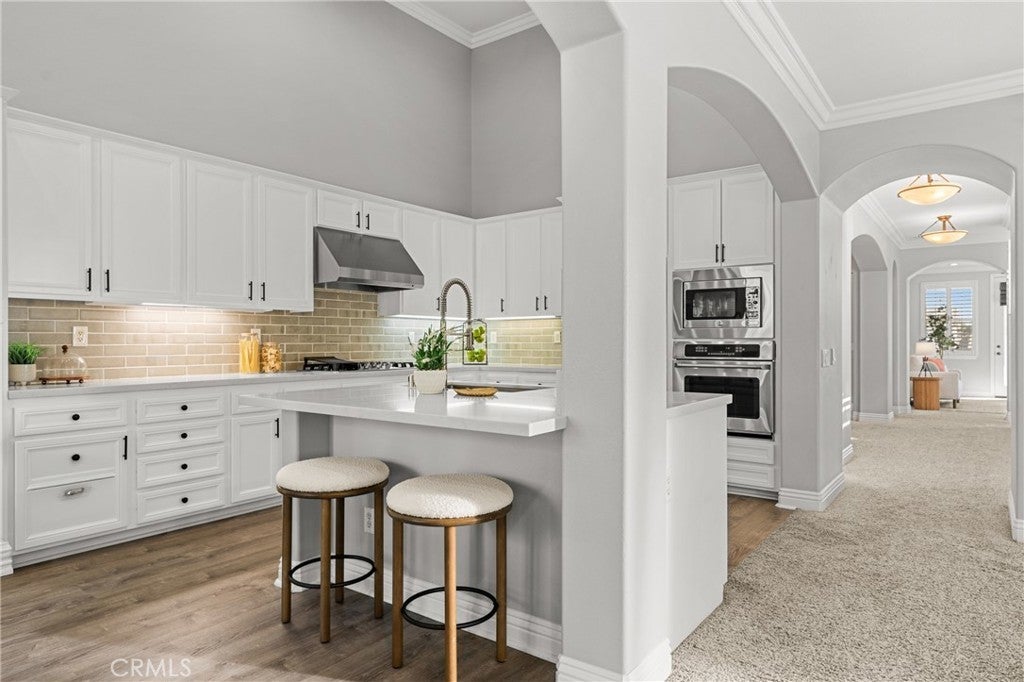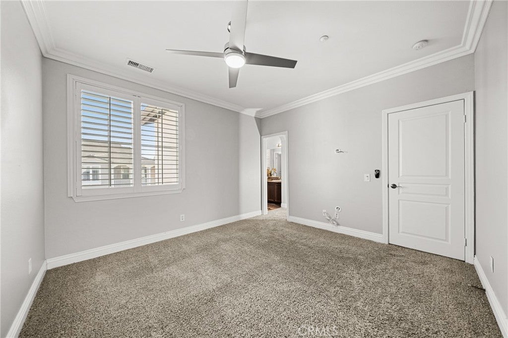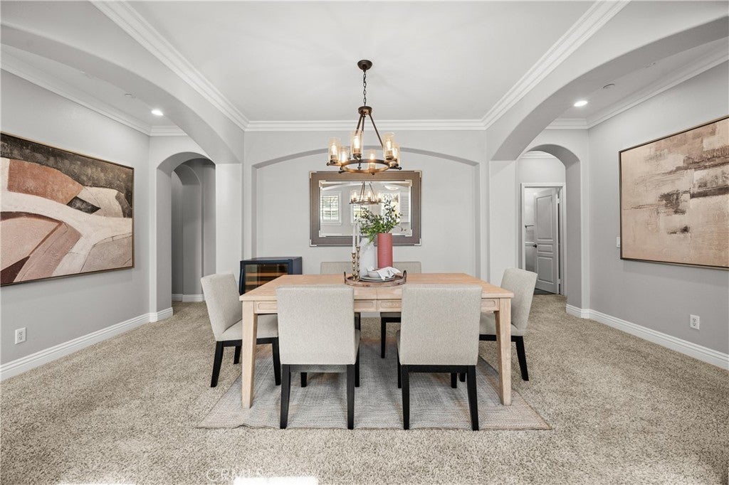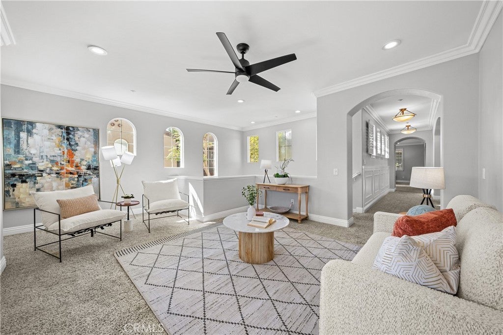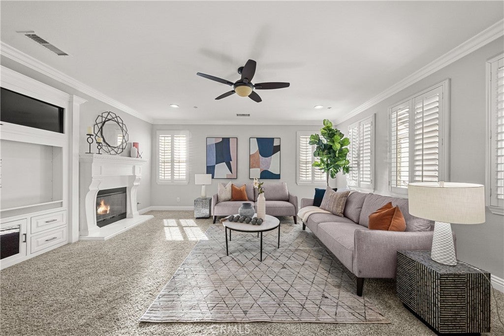 Pristine luxury retreat located in the highly sought-after golf course community of San Lorenzo. This bright and airy home offers 3 bedrooms plus a versatile bonus room, 2.5 bathrooms, and approximately 2,615 sq. ft. of thoughtfully designed living space with an open-concept layout. The inviting living room serves as the heart of the home, highlighted by a beautiful fireplace with a custom-built mantel and entertainment center. The stunning gourmet kitchen features tile backsplash, granite countertops and stainless steel appliances. A convenient breakfast bar is perfect for busy mornings, while a built-in desk provides an ideal workspace. The kitchen seamlessly connects to a covered balcony deck, making outdoor BBQ and entertaining effortless. The formal dining room is enhanced with elegant custom wainscoting and comfortably accommodates gatherings of up to 12 guests. The spacious primary suite features soaring ceilings and an overhead ceiling fan, creating a relaxing private retreat. The luxurious primary bathroom includes a dual vanity, soaking tub, walk-in glass shower, and an oversized walk-in closet. Residents of this community enjoy access to resort-style amenities including a pool, spa, BBQ area, and clubhouse for private gatherings. Ideally located just minutes from Yorba Linda High School, Yorba Linda Town Center, and nearby horse, hiking, and walking trails. This exceptional move-in ready home offers comfort, style, and convenience—an opportunity you won’t want to miss.