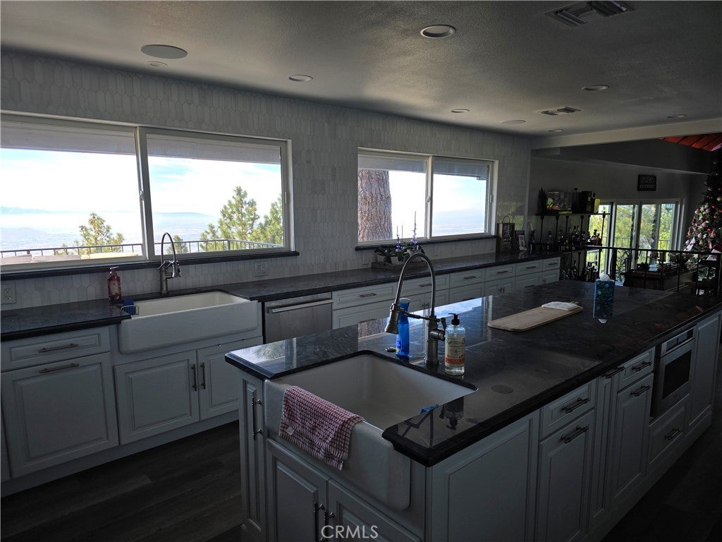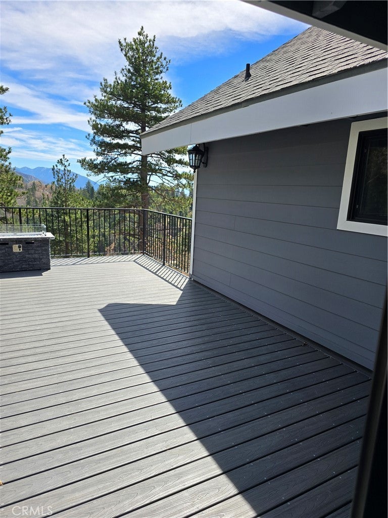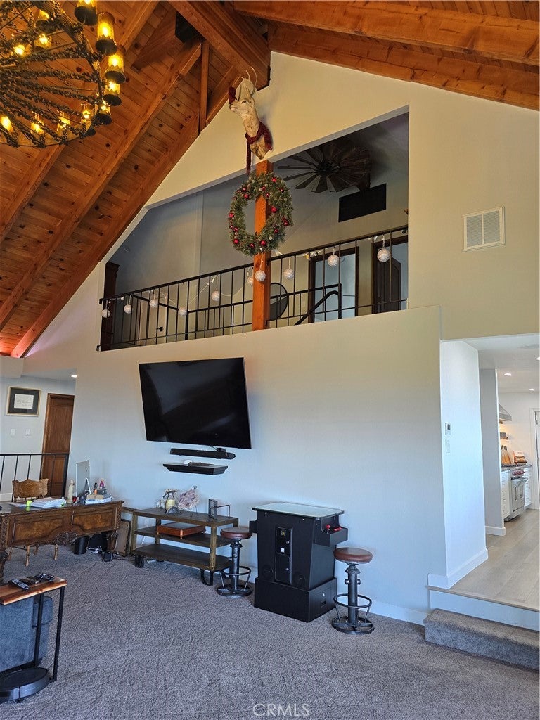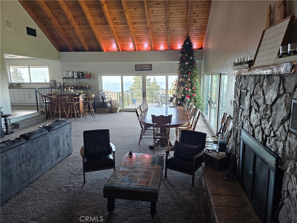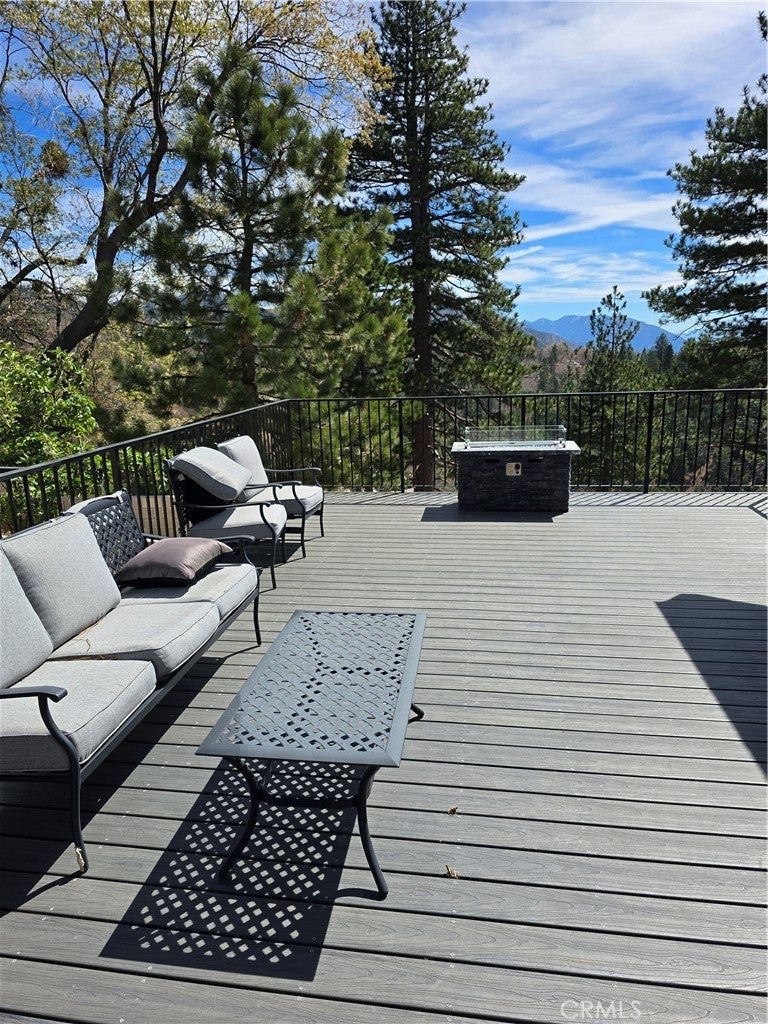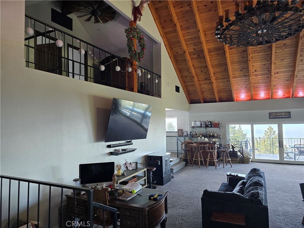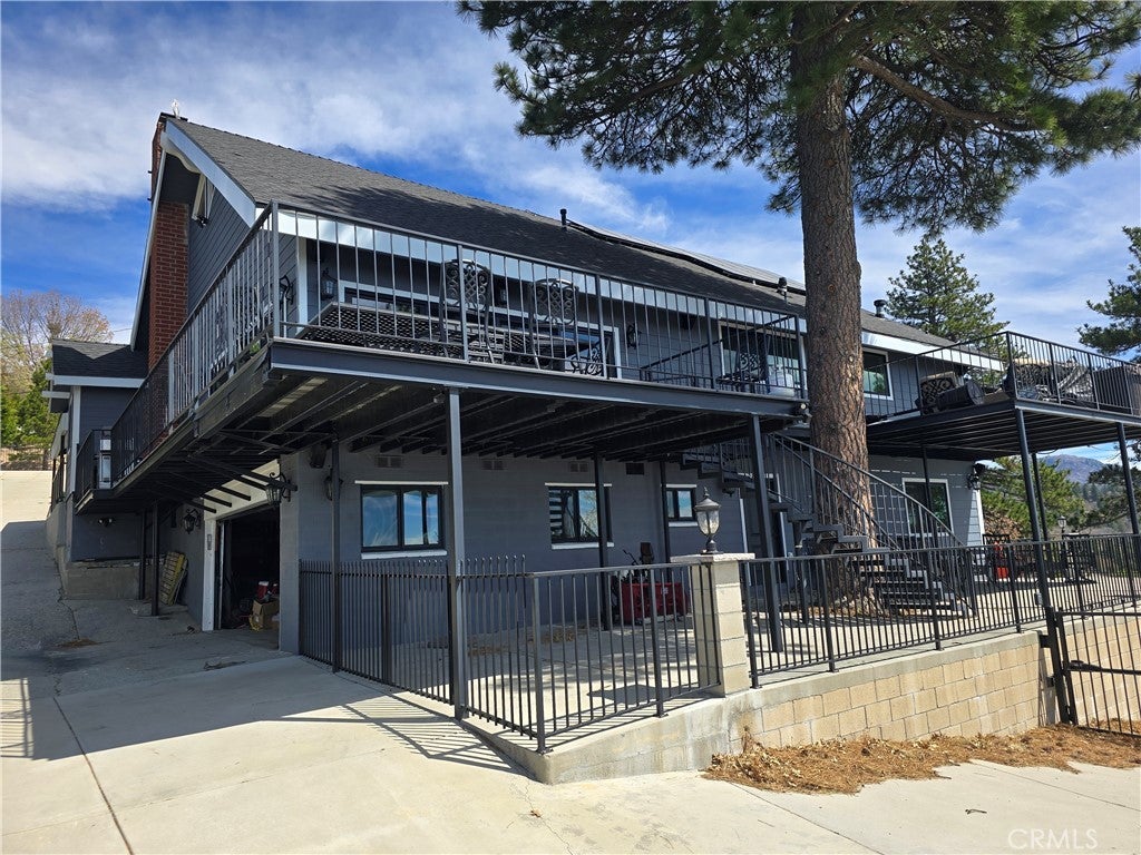 Mountain chalet estate situated on approximately 6.80 acres with expansive valley and mountain views, city lights, and the Pacific Ocean. near Running Springs and Snow Valley Ski Resort. Offering approximately 4,300+ sq ft of living space, this lodge-style home features a spacious open-concept great room with vaulted tongue-and-groove wood ceilings, exposed beams, and large windows that capture natural light and the priceless scenic vistas. The residence includes 6 bedrooms, 5 bathrooms, along with multiple living and entertaining areas. The updated kitchen features a large center island, farmhouse sink, stainless steel appliances, ample cabinetry, and extended counter space with unique quartz countertops with views. Additional interior highlights include a game room with a billiards area, bar space, and a remodeled bathroom with a soaking tub and a walk-in shower, and a rustic rock fireplace. Also, electrical updates, including a full solar system. newer heating/cooling high-efficiency system. Outdoor features include expansive decking and patio areas designed to take advantage of the surrounding priceless views, as well as an oversized two-car garage and extended driveway providing plenty of parking. The property consists of separate parcels, offering the potential for expansion, additional structures, or other uses (buyer to verify). Recent improvements include updated interior finishes, flooring, paint, plumbing (PEX), and roof. The grounds offer a natural setting with mature pine, oak, and cedar trees across gently sloping terrain. The current owners lovingly reimagined this home as a forever retirement sanctuary and poured their hearts into this Mountain retreat. refurbishing with the intention of retiring here amidst the stunning views. The seller's change of plans offers a unique opportunity for a new owner to step into a finished high-end property.