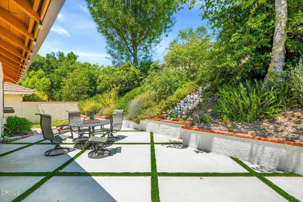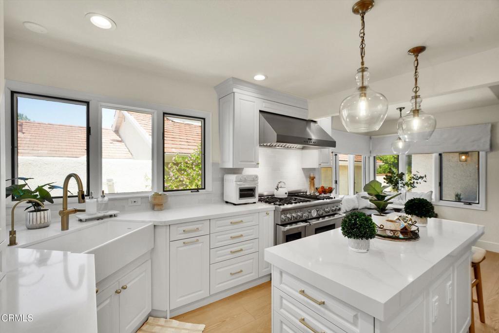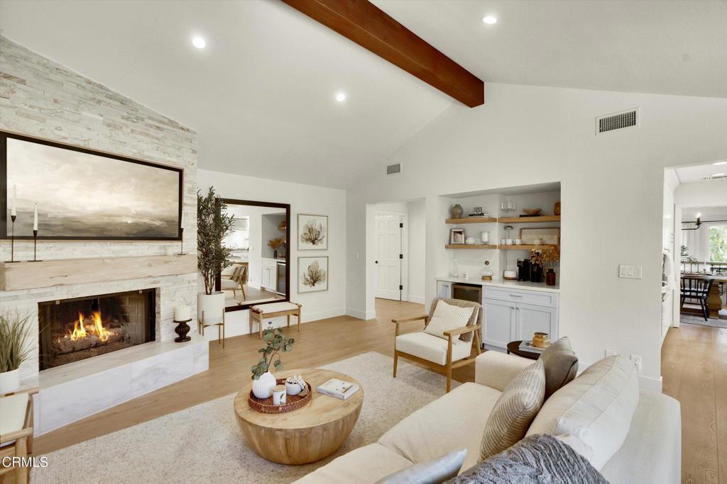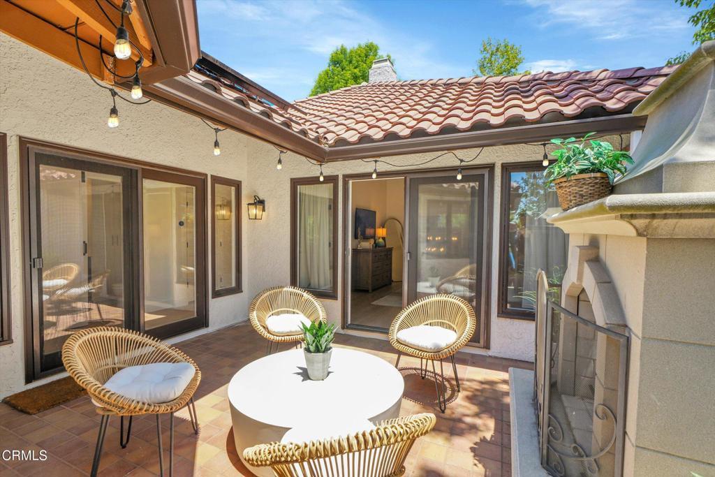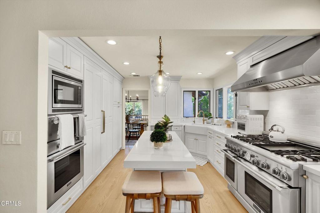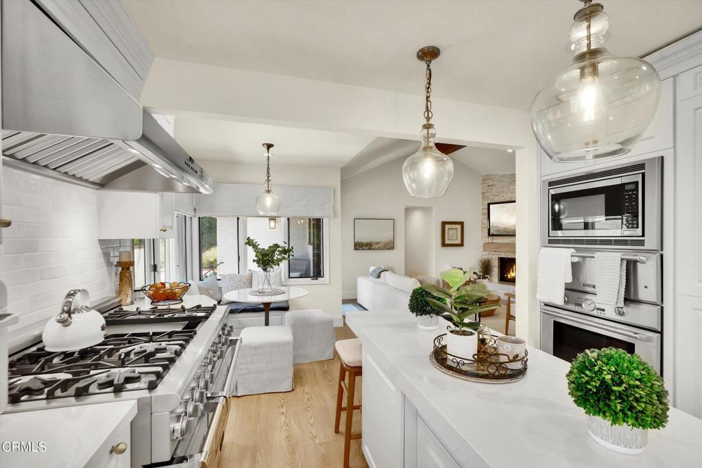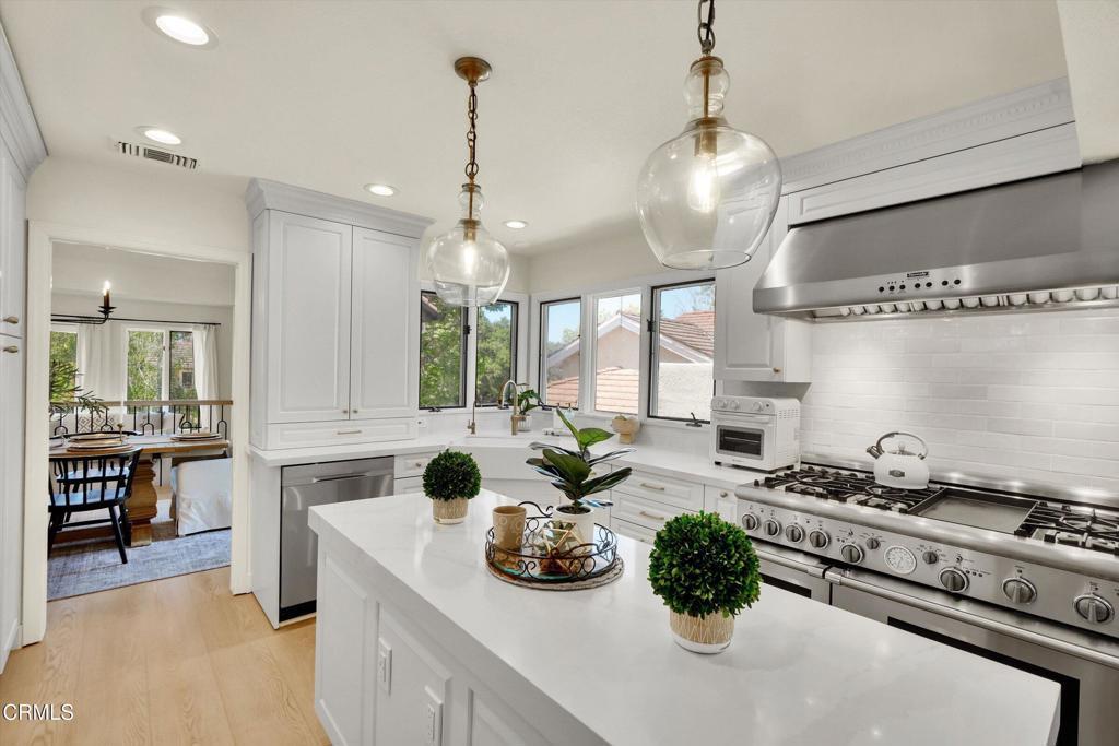 Rare opportunity to own a fully renovated Master Series home in the prestigious North Ranch Country Club. One of only a handful of detached Westlake Village homes under $2M offering over 2,500 sq ft and move-in ready designer finishes. Across from golf course, perfect for those who want North Ranch prestige with a lock-and-leave, low-maintenance lifestyle. A home of exceptional character, thoughtfully designed with unique architectural details that set it apart from the norm. Fully detached home. Main living area is all on one level, with room for an elevator, 3 bedroom + office. Wide-plank luxury vinyl flooring flows throughout, paired with a custom white oak stair rail. Formal living and family rooms feature stacked stone fireplaces and soaring vaulted ceilings. The gourmet kitchen features custom off-white cabinetry with Champagne Bronze fixtures, Silestone quartz countertops with gold veining, and soft-close pullouts. Top-tier Thermador appliances include a 6-burner range with griddle, 3 ovens, warming drawer, paneled refrigerator, and built-in breakfast nook. The spacious primary suite is a serene retreat with walk-in closet and spa-style bath. The bath features floor-to-ceiling quartz slabs, freestanding soaking tub, oversized shower, and dual-sink vanity. The bedroom opens to an entertainer's courtyard with fireplace. A new coffee bar with wine refrigerator and quartz counters adds a sophisticated touch off the family room. Additional upgrades include designer light fixtures, custom window treatments, fresh neutral paint inside and out, en-suite baths and powder room, lush landscaping, newer tile roof, FULLY PAID SOLAR, new soft water and reverse osmosis systems, oversized 2-car garage with golf cart space, and single-level living convenience. Low HOA of $350/quarter and Blue-Ribbon schools. Elegant living with designer-curated finishes throughout, plus finished office/workshop off the garage. This turnkey North Ranch home won't last at this price point.