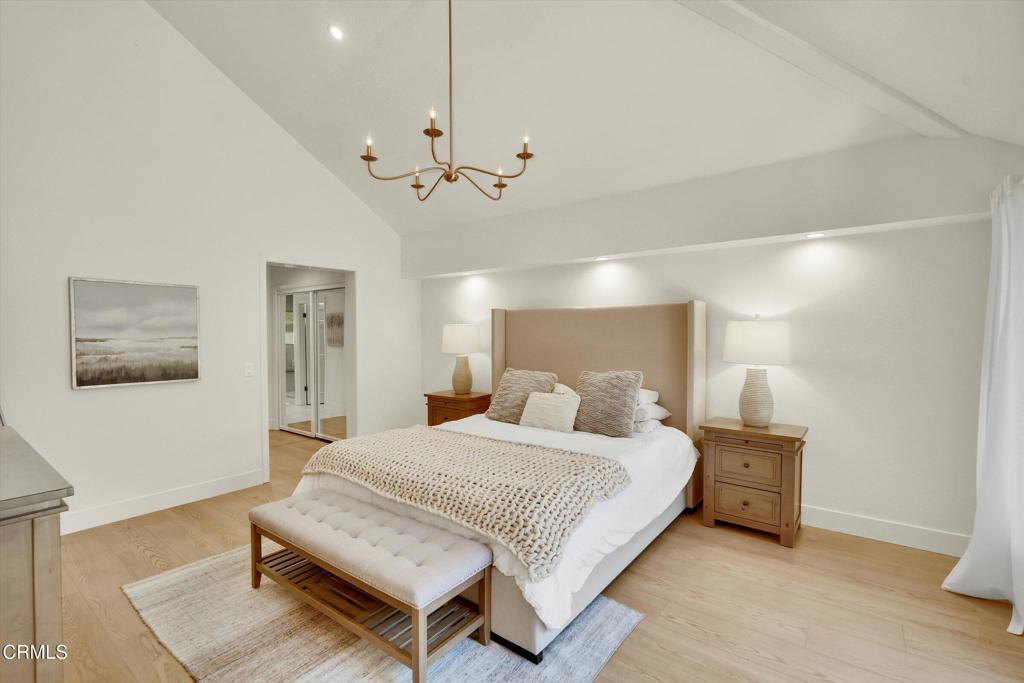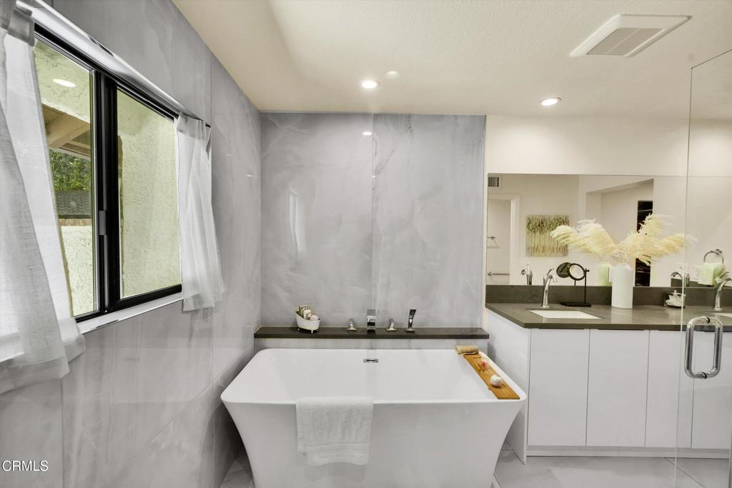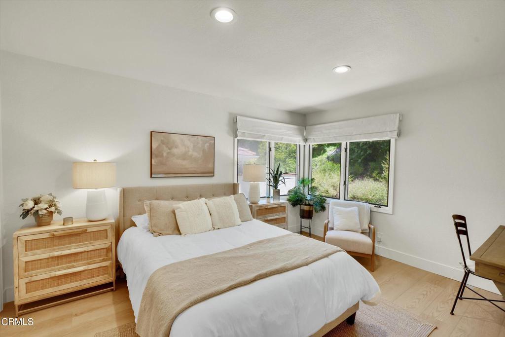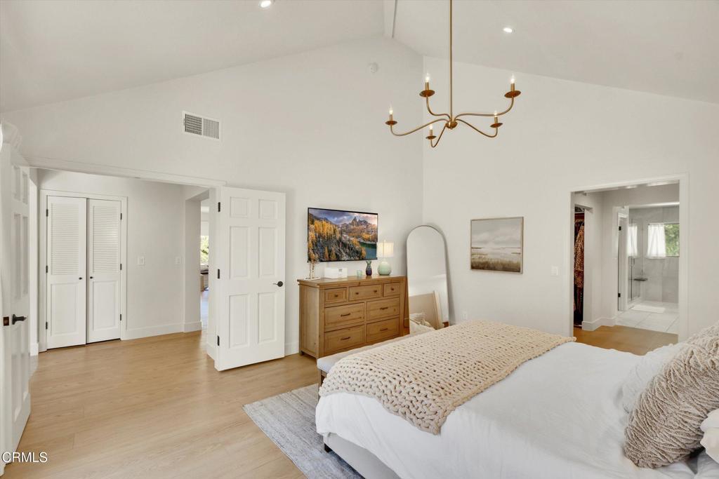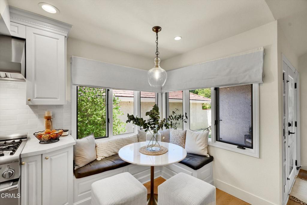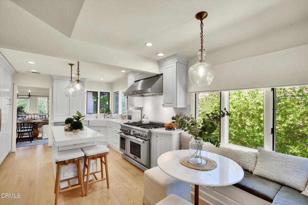 Rare opportunity to own a fully renovated Master Series home in the prestigious North Ranch Country Club. One of only a handful of detached Westlake Village homes under $2M offering over 2,500 sq ft and move-in ready designer finishes. Across from golf course, perfect for those who want North Ranch prestige with a lock-and-leave, low-maintenance lifestyle. A home of exceptional character, thoughtfully designed with unique architectural details that set it apart from the norm. Fully detached home. Main living area is all on one level, with room for an elevator, 3 bedroom + office. Wide-plank luxury vinyl flooring flows throughout, paired with a custom white oak stair rail. Formal living and family rooms feature stacked stone fireplaces and soaring vaulted ceilings. The gourmet kitchen features custom off-white cabinetry with Champagne Bronze fixtures, Silestone quartz countertops with gold veining, and soft-close pullouts. Top-tier Thermador appliances include a 6-burner range with griddle, 3 ovens, warming drawer, paneled refrigerator, and built-in breakfast nook. The spacious primary suite is a serene retreat with walk-in closet and spa-style bath. The bath features floor-to-ceiling quartz slabs, freestanding soaking tub, oversized shower, and dual-sink vanity. The bedroom opens to an entertainer's courtyard with fireplace. A new coffee bar with wine refrigerator and quartz counters adds a sophisticated touch off the family room. Additional upgrades include designer light fixtures, custom window treatments, fresh neutral paint inside and out, en-suite baths and powder room, lush landscaping, newer tile roof, FULLY PAID SOLAR, new soft water and reverse osmosis systems, oversized 2-car garage with golf cart space, and single-level living convenience. Low HOA of $350/quarter and Blue-Ribbon schools. Elegant living with designer-curated finishes throughout, plus finished office/workshop off the garage. This turnkey North Ranch home won't last at this price point.