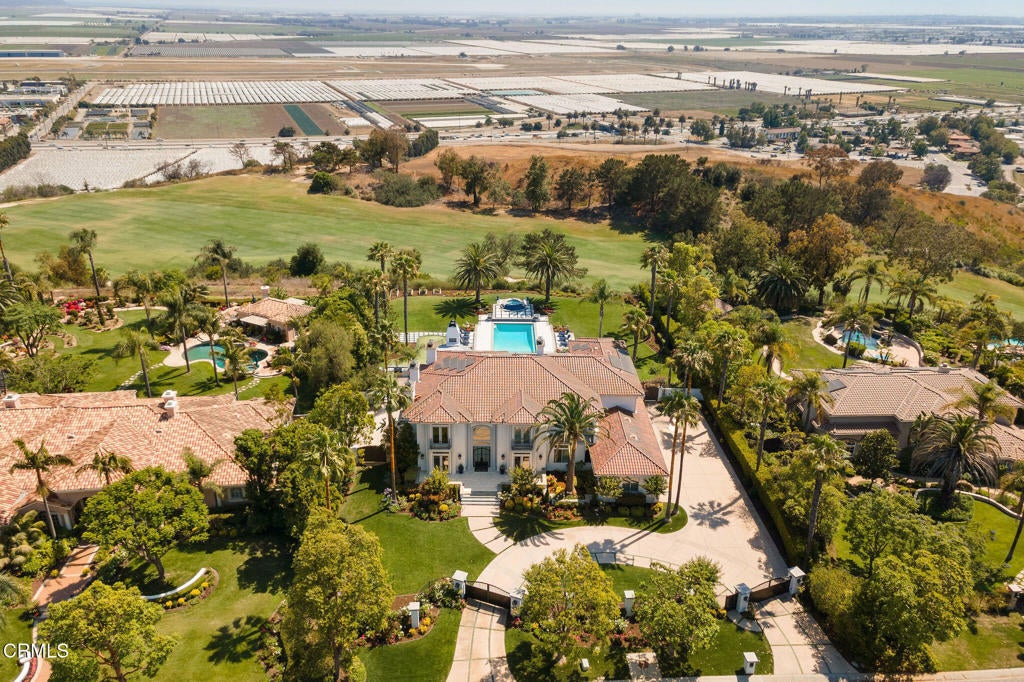 Tucked away in Camarillo's coveted Spanish Hills community and perched on the 15th fairway of the Spanish Hills Club, 1069 Corte Barroso sits on one of the best lots in the neighborhood. This grand 7,121 SF contemporary estate on a flat, lush 1-acre lot features 6 bedrooms, 6.5 bathrooms, and a fully gated entrance offering premier privacy and exclusivity. Panoramic golf course and ocean views elevate everyday living in this beautifully designed residence that blends rich textures, clean lines, and luxurious scale. A dramatic formal entry welcomes you into voluminous interiors, where a soaring great room with a stone fireplace and oversized windows creates an elegant yet inviting space for gathering. The fully renovated and expanded kitchen is a chef's dream, outfitted with paneled Sub-Zero and Asko appliances, Wolf double ovens, induction + gas cooktop, microwave, two warming drawers, a large island with breakfast bar, dining area, built-in desk, and separate scullery. Oversized windows and a wall of French doors frame the serene outdoor space, enhancing the seamless indoor-outdoor flow. Flanking the entry are formal living and dining rooms, while the true showpiece downstairs is a moody, speakeasy-style bar with mini fridges, ice machine, oversized wine fridge, and custom woodwork. The main level also includes a spacious primary suite, laundry room, and an additional bedroom converted into a stunning office with custom cabinetry. Upstairs, a second expansive primary suite offers a large sleeping area, sitting room, modern electric fireplace, and French doors that open to a private terrace with jaw-dropping 180-degree views of Camarillo, the golf course, airport, and the Channel Islands--where sunsets are a daily highlight. Three additional guest bedrooms upstairs each feature ensuite baths for optimal comfort. The entertainer's backyard features lush, meticulously landscaped grounds, a renovated pool and spa, covered patio with built-in speakers, TV lounge with fireplace, full outdoor kitchen, putting green, and separate fire pit area. With an oversized 3-car garage, Tesla wall, owned solar and water purification systems, RV parking, and a truly unbeatable location, this estate is a rare offering and an exceptional place to call home.