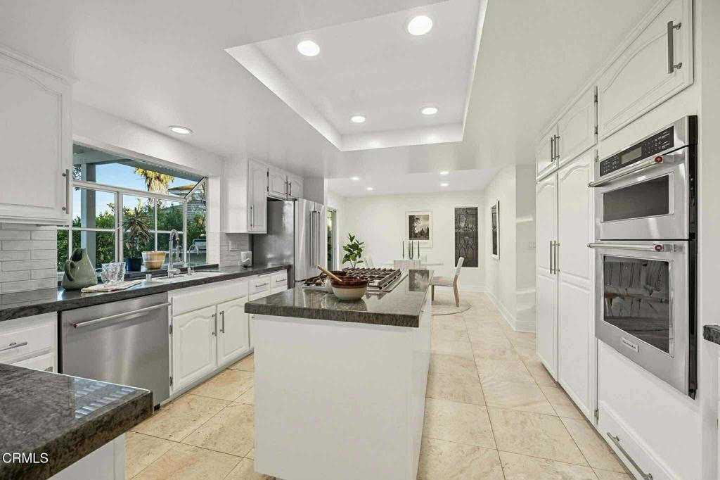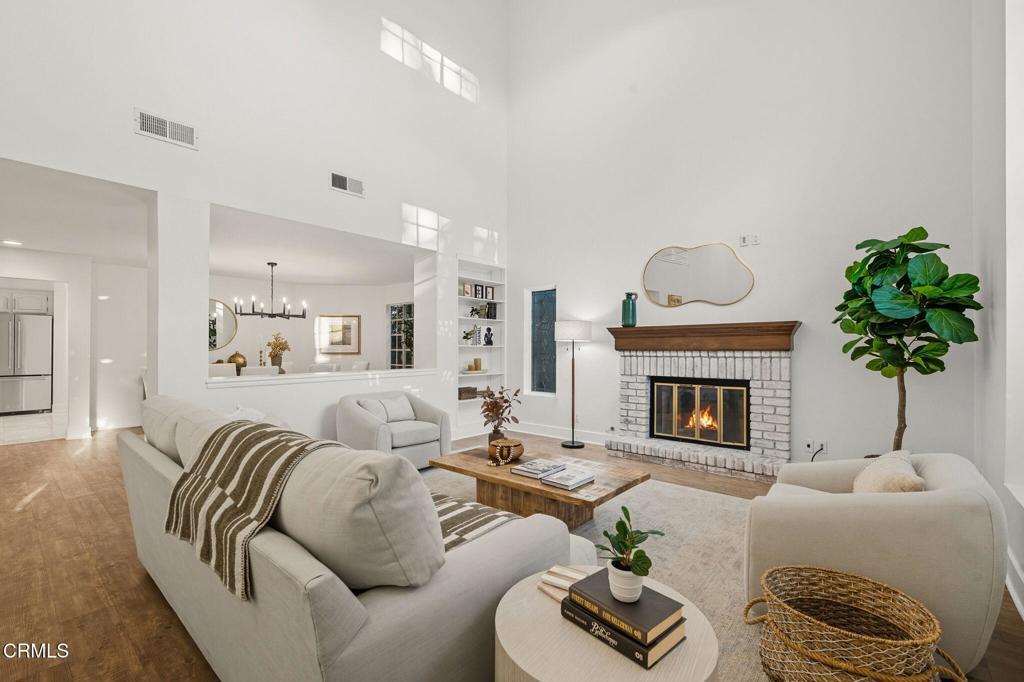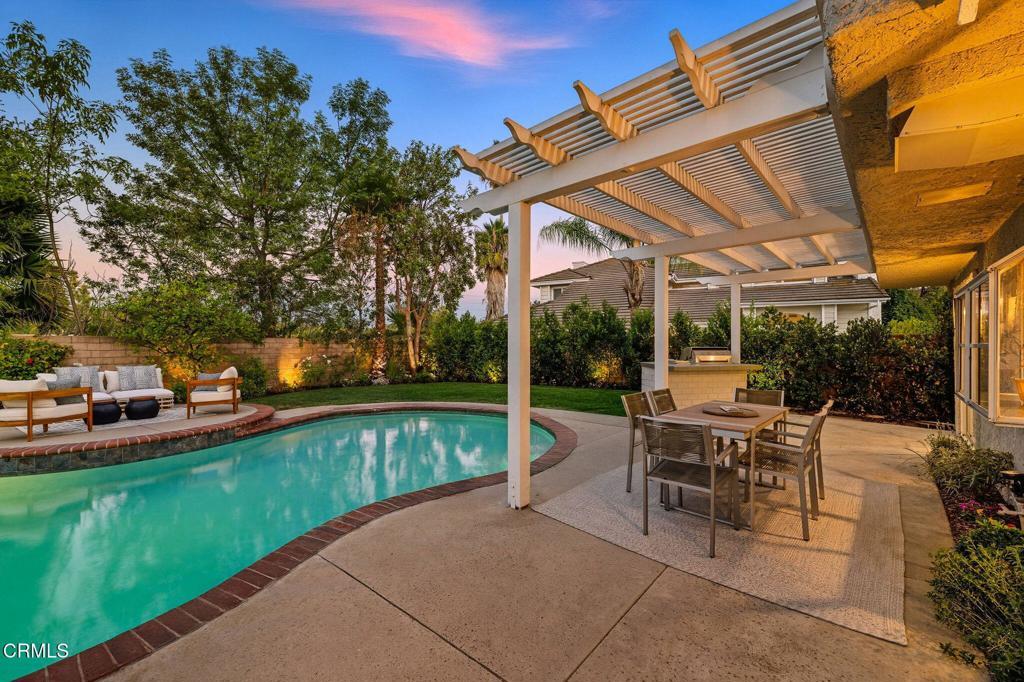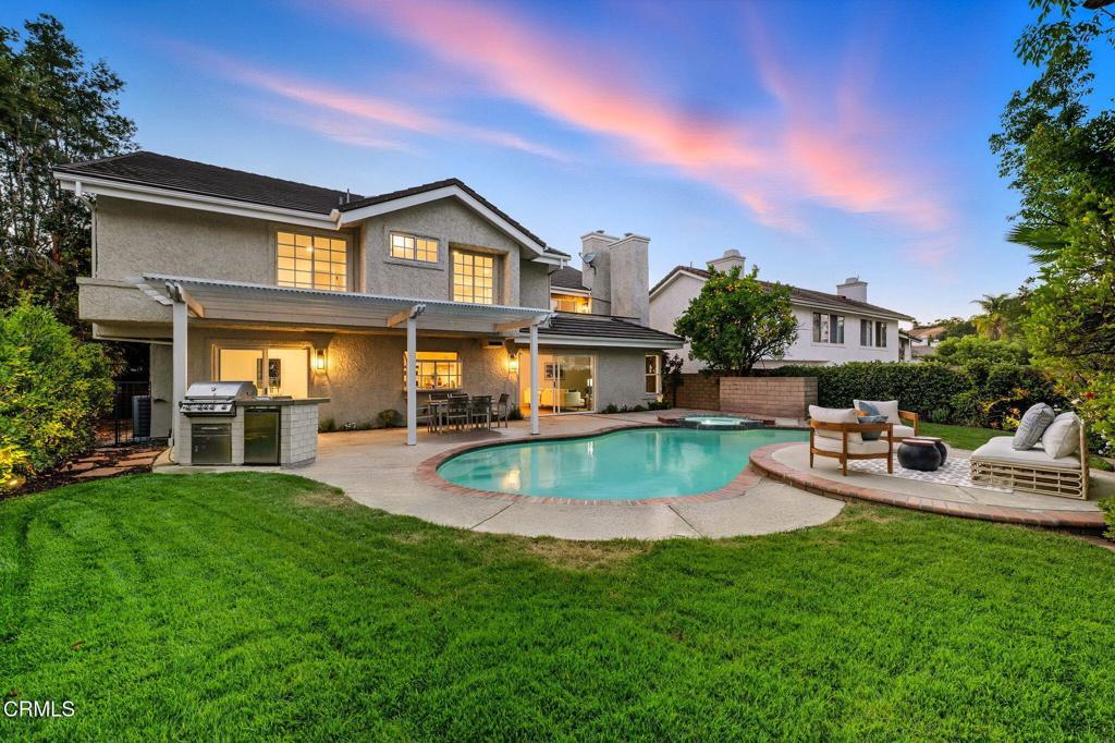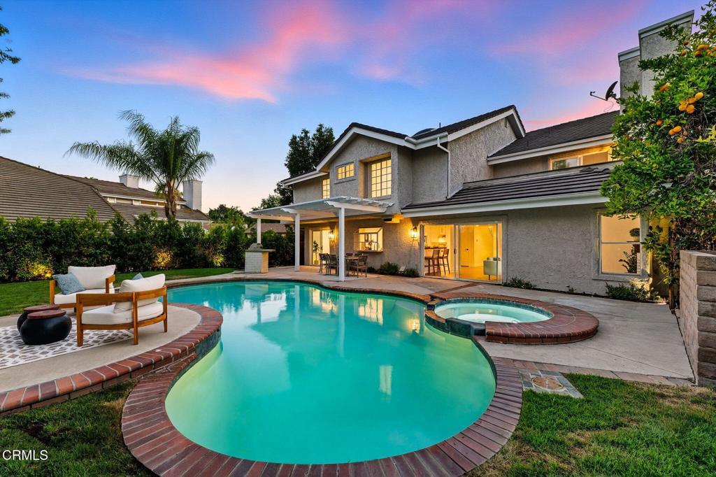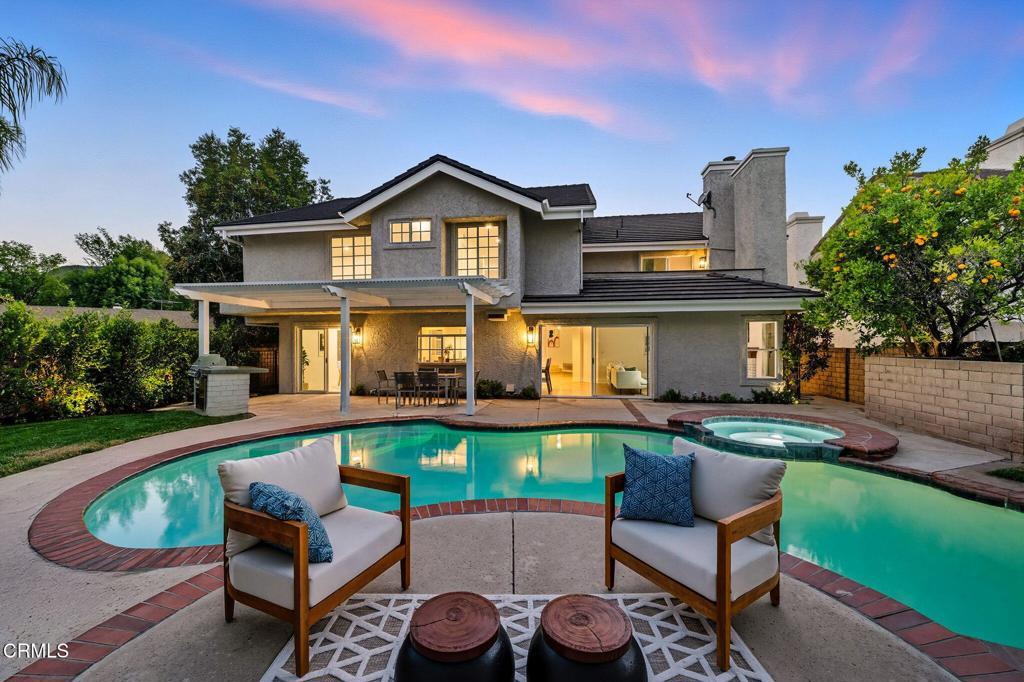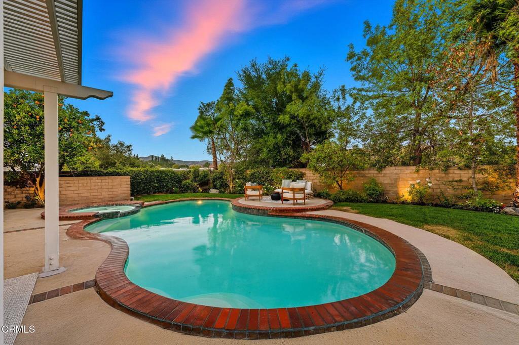 Tucked at the end of a quiet cul-de-sac in the heart of Agoura Hills, this beautifully refreshed Cape Cod home combines the charm and character of an established property with the feel of a brand-new space. Generously sized and thoughtfully updated, it's a rare opportunity to step into a home that is both move-in ready and full of potential to customize for years to come. Fresh paint, new carpet, updated lighting, and modern hardware bring brightness and style throughout. An expansive entryway welcomes you into the living room with high-ceilings and a fireplace, leading to the formal dining room and adjacent built-in bar. The refreshed kitchen shines with brand-new stainless-steel appliances, ample cabinet and counter space, a center island, and a bay window open to the backyard. An oversized dining area offers space for casual meals and gathering. The kitchen flows into a cozy family room, with a fireplace. Practical spaces round out the downstairs, including a powder room, two big closets, a laundry room, and direct access to the three-car garage with newly epoxy coated floors. A full downstairs bedroom suite with private backyard access adds flexibility -- ideal for guests, play space or a home office. Upstairs, there are three additional large bedrooms. Two share a Jack-and-Jill bath, and the third enjoys easy access from the hallway. A loft-style nook provides another space to customize as a study, play area, or reading corner. The primary bedroom is a true suite! This unique space is luxuriously oversized and offers the opportunity to create a completely personalized retreat with a sitting area with fireplace and balcony overlooking the backyard and mountain views. The spacious en-suite bathroom features dual sink vanity, high ceilings, a soaking tub, and both a walk-in and additional reach-in closets. Outdoors, refreshed landscaping highlights mature growth with a clean, colorful, updated feel. The backyard is designed for year-round enjoyment, featuring a pool and spa, grassy play space, a raised patio for lounging, a covered dining area, and a built-in BBQ for entertaining. Bright, spacious, and thoughtfully renewed, this gorgeous home offers the best of both worlds: the welcoming charm of an established home in a great location with the appeal of fresh and modern updates. Nestled in a sought-after neighborhood near award-winning Las Virgenes schools, parks, beaches and conveniences.