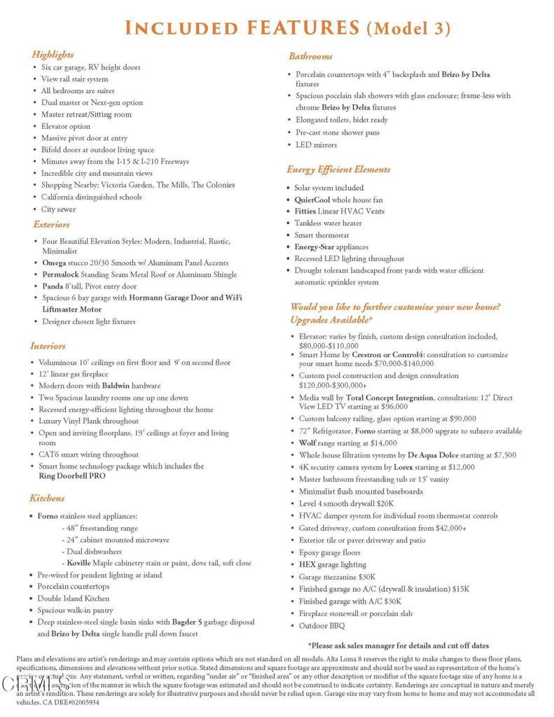 Located in beautiful Alta Loma, CA with panoramic city and mountain views, this brand new subdivision of eight luxury estates on half acres lots will be situated on a newly developed cul de sac. With four models to choose from, these big garage homes include features such as 20' x 50' RV garages with an option for a finished mezzanine, indoor/outdoor living with beautiful 500 SF covered California rooms, multi-generational living accommodation with NextGen/Guest suites, high ceilings, beautiful staircases, ensuite bathrooms for all bedrooms, and options for a swimming pool and private gated driveway. Curbs and sidewalks with city sewer are included even though the site has access to an equestrian trail and miles of walkable nature trails directly from each property. This is in a coveted quiet Alta Loma neighborhood which boasts California distinguished elementary and middle schools as well as a nationally recognized high school. Imagine snowboarding and surfing the same day as you're only 45 min from both the beach and mountain resorts. Los Angeles night life and restaurants are under an hour away! See attached Site Plan, Renderings & Elevations, Floor Plans, and Key Features available for the model being placed on this specific lot (subject to adjustments as required via final approval process). Presales are under way! First homes will be available for move-in starting Q3 2026. Contact Listing Agent for details on how to reserve your home!