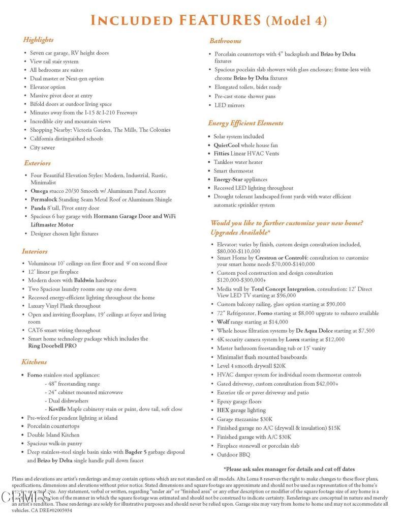Located in beautiful Alta Loma, CA with panoramic city and mountain views, this brand new subdivision of eight luxury estates on half acres lots will be situated on a newly developed cul de sac. With four models to choose from, these big garage homes include features such as 20' x 50' RV garages with an option for a finished mezzanine, indoor/outdoor living with beautiful 500 SF covered California rooms, multi-generational living accommodation with NextGen/Guest suites, high ceilings, beautiful staircases, ensuite bathrooms for all bedrooms, and options for a swimming pool and private gated driveway. Curbs and sidewalks with city sewer are included even though the site has access to an equestrian trail and miles of walkable nature trails directly from each property. This is in a coveted quiet Alta Loma neighborhood which boasts California distinguished elementary and middle schools as well as a nationally recognized high school. Imagine snowboarding and surfing the same day as you're only 45 min from both the beach and mountain resorts. Los Angeles night life and restaurants are under an hour away! See attached Site Plan, Renderings & Elevations, Floor Plans, and Key Features available for the model being placed on this specific lot (subject to adjustments as required via final approval process). Presales are under way! First homes will be available for move-in starting Q3 2026. Contact Listing Agent for details on how to reserve your home!