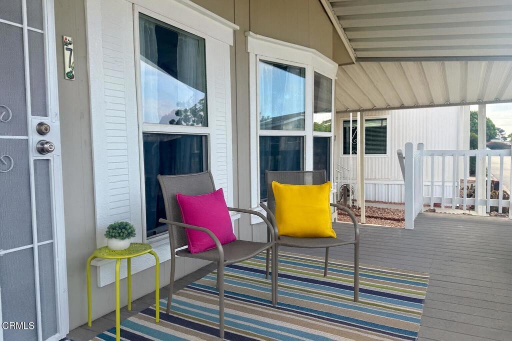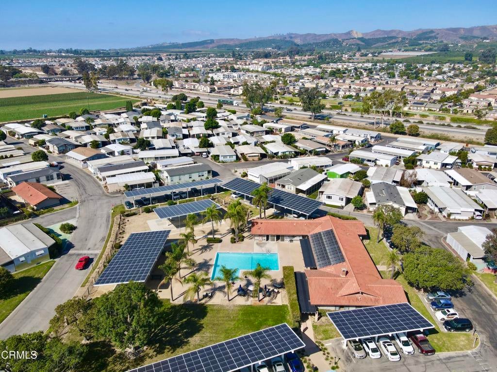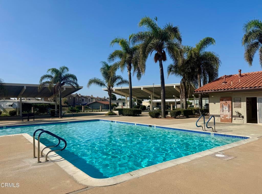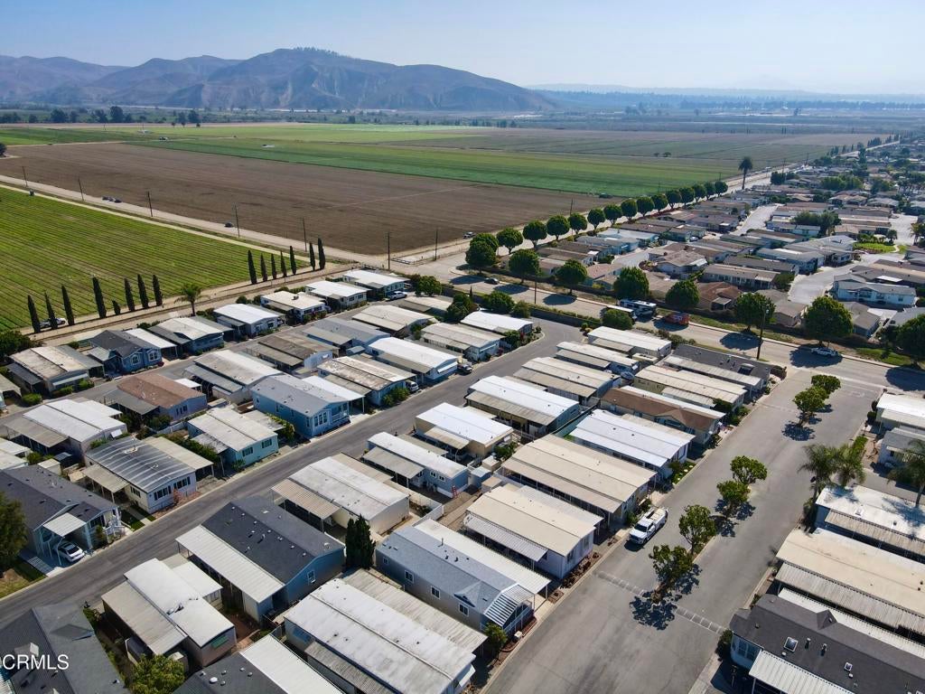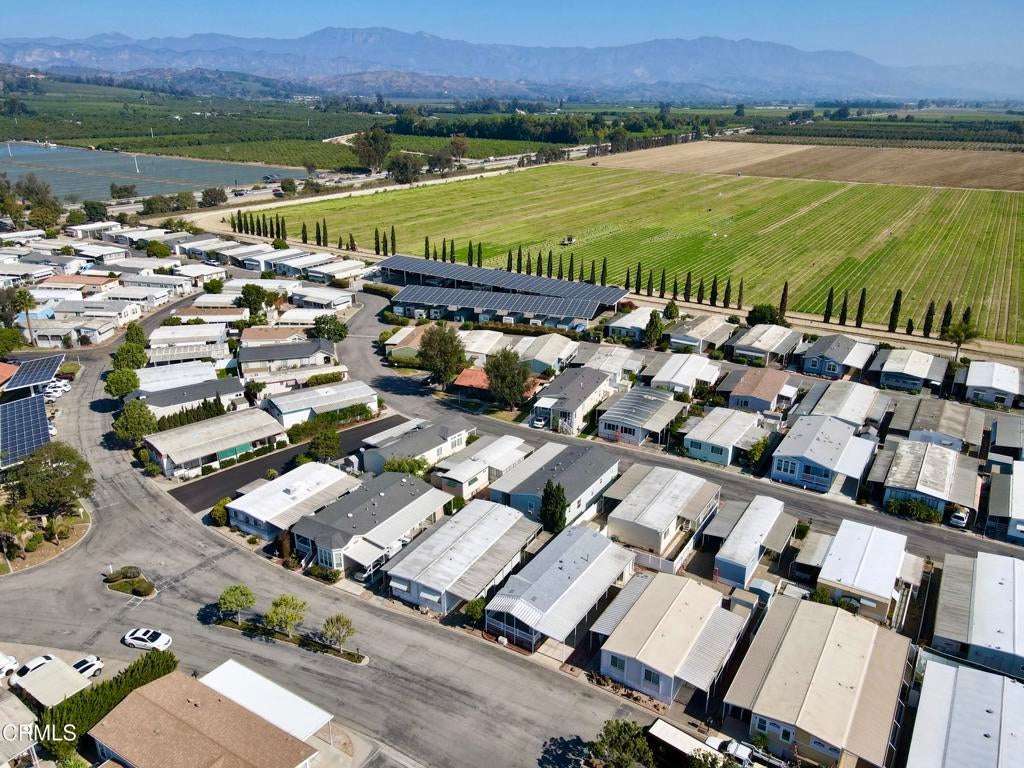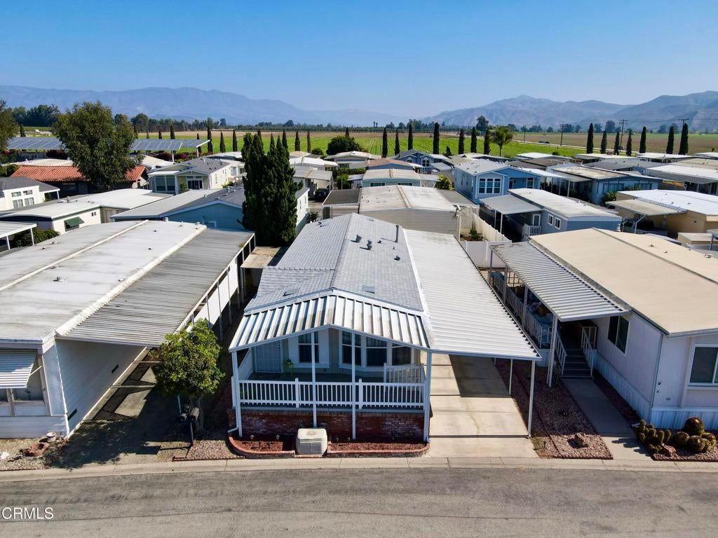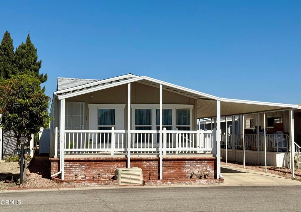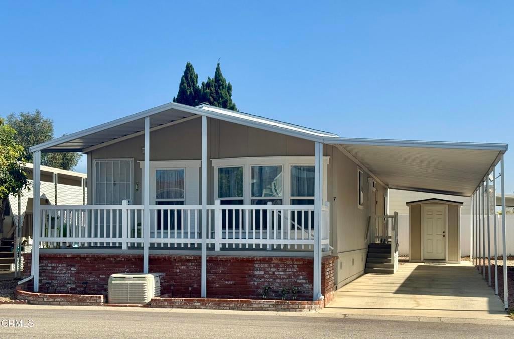 Welcome to 7 Wisteria Way, a well-maintained manufactured home featuring a new Certainteed Landmark Solaris Cool Roof (installed July 2025) and a fantastic location within a desirable age-restricted community. Natural light streams through well-placed windows, highlighting the airy living spaces and easy-care hard-surface flooring throughout (with plush carpet in the bedrooms). The primary suite includes a spacious closet and en suite bath with abundant storage and an easily-accessible shower. The hall bath has a shower and tub combination. Keep cool with ceiling fans in both bedrooms, the family room and the dining area. The light kitchen opens to the dining area with a cute counter for possible seating or serving too. Enjoy the inviting shady front porch with beautiful used brick detail--perfect for relaxing with a book, entertaining or connecting with neighbors in this vibrant, active community. A large storage shed with shelving offers added convenience, while the extended carport can accommodate longer vehicles or two cars parked tandem. Thoughtfully appointed, this is a wonderful place to call home! The community itself has a sparkling pool surrounded by a grassy lawn, palm trees, picnic tables, and courts for shuffle ball and corn hole. There is a covered hot tub as well as an event space. East Ventura combines the quiet atmosphere of agricultural fields mingled with residential neighborhoods including parks and schools. Trailheads at Harmon Canyon to area hiking are found off of Foothill Road. Multiple golf courses are nearby. For dining, shopping and entertainment, the Collection in Oxnard is 5.5 miles away, while Downtown Ventura's arts and cultural corridor is 10 miles away. For days at the beach, sea glass collecting or enjoying the sunset over the Pacific, the fastest route is to take the nearby 126 to the Seaward exit off the 101 - a 9 mile ride. Whether for a full-time residence, an easy 'lock and leave' for the frequent traveler or as a cooler climate weekend home, Ventura has much to offer!