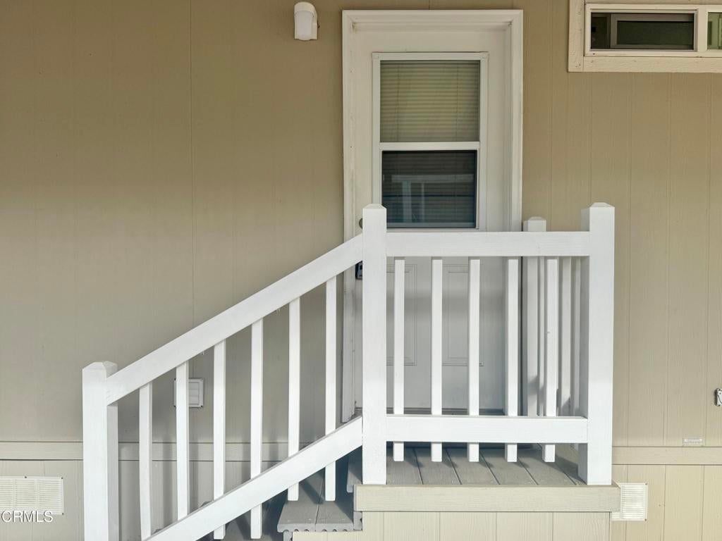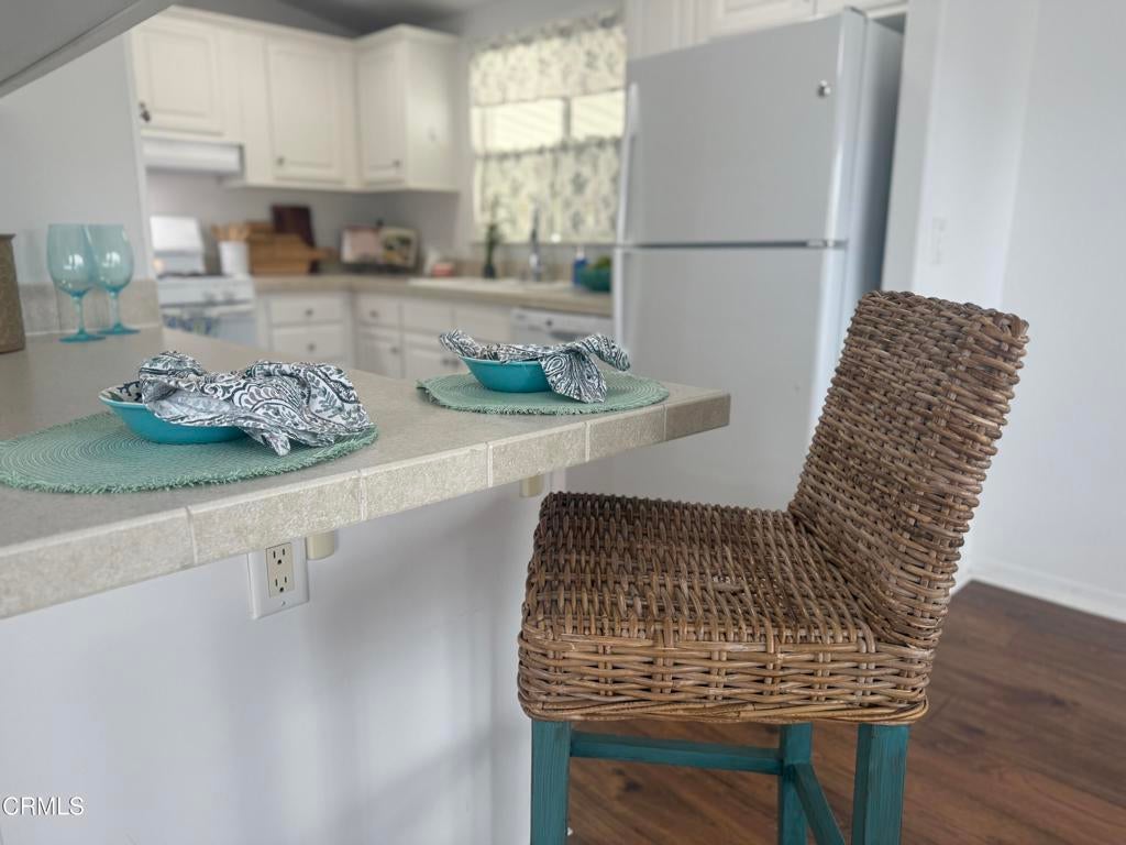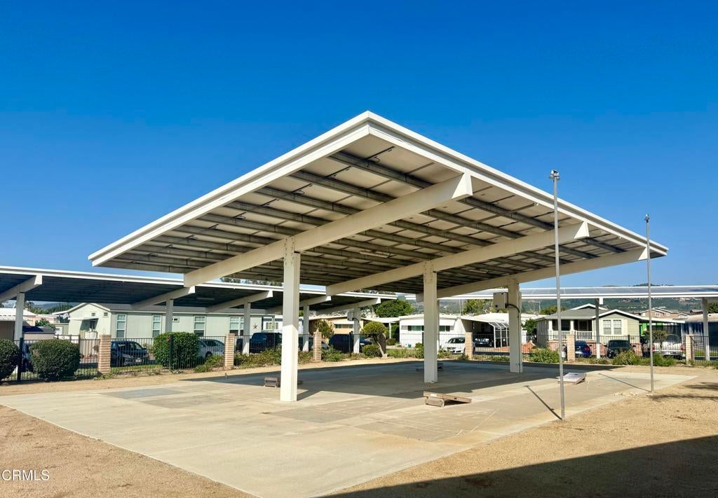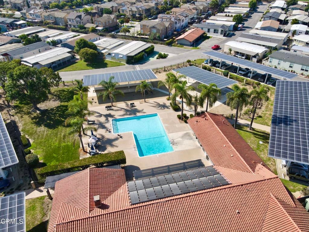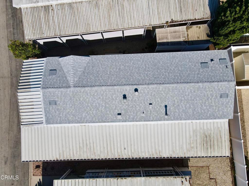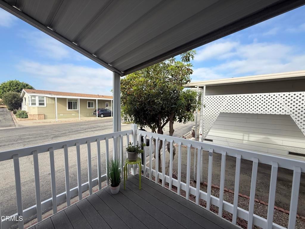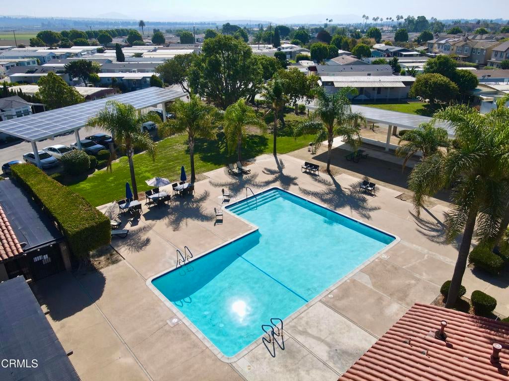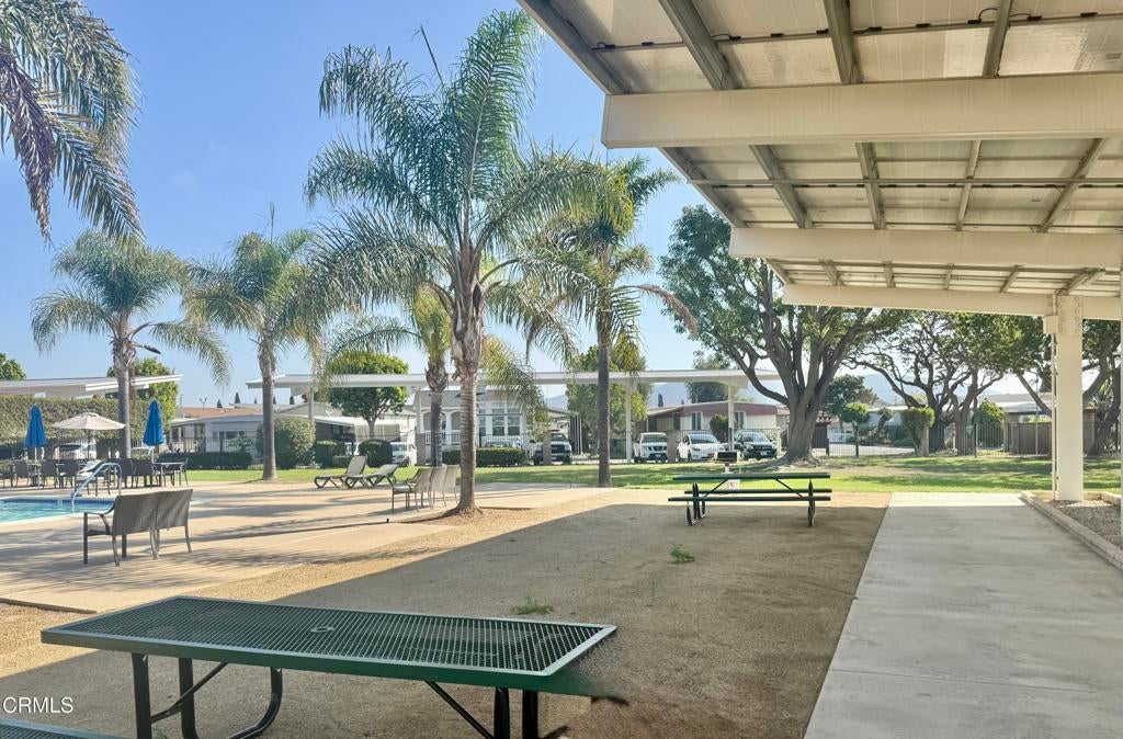 Welcome to 7 Wisteria Way, a well-maintained manufactured home featuring a new Certainteed Landmark Solaris Cool Roof (installed July 2025) and a fantastic location within a desirable age-restricted community. Natural light streams through well-placed windows, highlighting the airy living spaces and easy-care hard-surface flooring throughout (with plush carpet in the bedrooms). The primary suite includes a spacious closet and en suite bath with abundant storage and an easily-accessible shower. The hall bath has a shower and tub combination. Keep cool with ceiling fans in both bedrooms, the family room and the dining area. The light kitchen opens to the dining area with a cute counter for possible seating or serving too. Enjoy the inviting shady front porch with beautiful used brick detail--perfect for relaxing with a book, entertaining or connecting with neighbors in this vibrant, active community. A large storage shed with shelving offers added convenience, while the extended carport can accommodate longer vehicles or two cars parked tandem. Thoughtfully appointed, this is a wonderful place to call home! The community itself has a sparkling pool surrounded by a grassy lawn, palm trees, picnic tables, and courts for shuffle ball and corn hole. There is a covered hot tub as well as an event space. East Ventura combines the quiet atmosphere of agricultural fields mingled with residential neighborhoods including parks and schools. Trailheads at Harmon Canyon to area hiking are found off of Foothill Road. Multiple golf courses are nearby. For dining, shopping and entertainment, the Collection in Oxnard is 5.5 miles away, while Downtown Ventura's arts and cultural corridor is 10 miles away. For days at the beach, sea glass collecting or enjoying the sunset over the Pacific, the fastest route is to take the nearby 126 to the Seaward exit off the 101 - a 9 mile ride. Whether for a full-time residence, an easy 'lock and leave' for the frequent traveler or as a cooler climate weekend home, Ventura has much to offer!