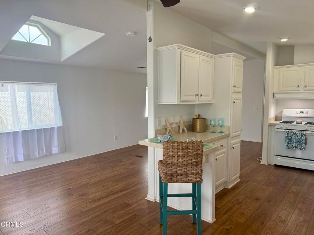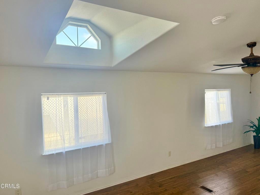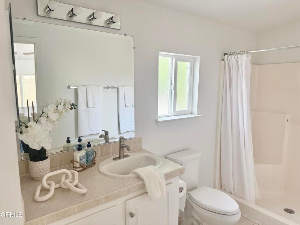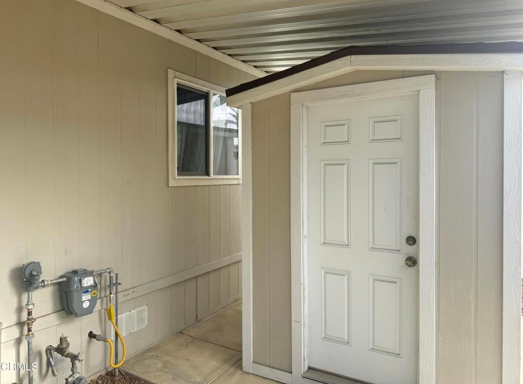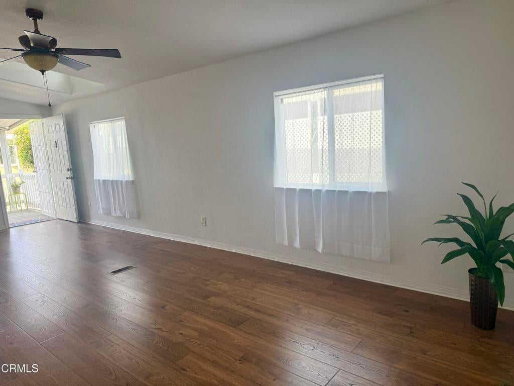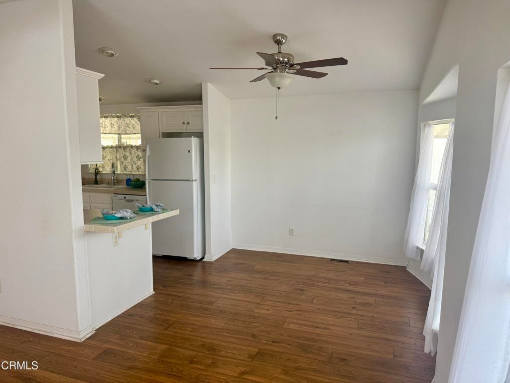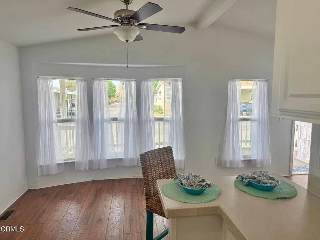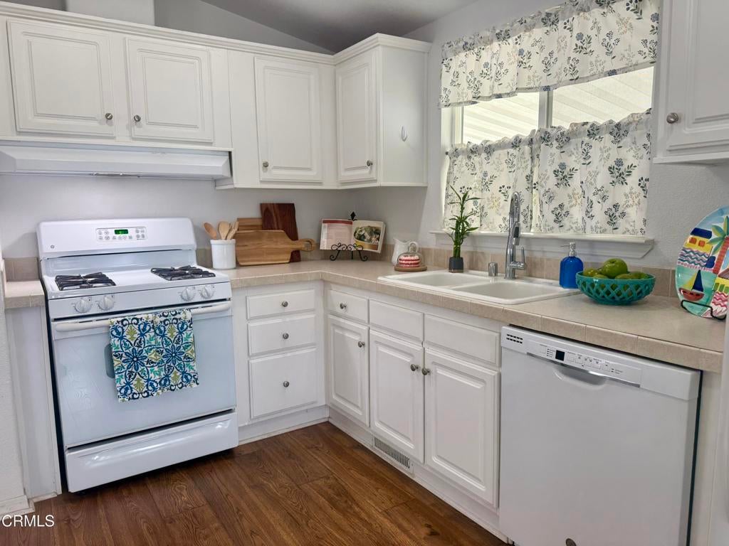 Welcome to 7 Wisteria Way, a well-maintained manufactured home featuring a new Certainteed Landmark Solaris Cool Roof (installed July 2025) and a fantastic location within a desirable age-restricted community. Natural light streams through well-placed windows, highlighting the airy living spaces and easy-care hard-surface flooring throughout (with plush carpet in the bedrooms). The primary suite includes a spacious closet and en suite bath with abundant storage and an easily-accessible shower. The hall bath has a shower and tub combination. Keep cool with ceiling fans in both bedrooms, the family room and the dining area. The light kitchen opens to the dining area with a cute counter for possible seating or serving too. Enjoy the inviting shady front porch with beautiful used brick detail--perfect for relaxing with a book, entertaining or connecting with neighbors in this vibrant, active community. A large storage shed with shelving offers added convenience, while the extended carport can accommodate longer vehicles or two cars parked tandem. Thoughtfully appointed, this is a wonderful place to call home! The community itself has a sparkling pool surrounded by a grassy lawn, palm trees, picnic tables, and courts for shuffle ball and corn hole. There is a covered hot tub as well as an event space. East Ventura combines the quiet atmosphere of agricultural fields mingled with residential neighborhoods including parks and schools. Trailheads at Harmon Canyon to area hiking are found off of Foothill Road. Multiple golf courses are nearby. For dining, shopping and entertainment, the Collection in Oxnard is 5.5 miles away, while Downtown Ventura's arts and cultural corridor is 10 miles away. For days at the beach, sea glass collecting or enjoying the sunset over the Pacific, the fastest route is to take the nearby 126 to the Seaward exit off the 101 - a 9 mile ride. Whether for a full-time residence, an easy 'lock and leave' for the frequent traveler or as a cooler climate weekend home, Ventura has much to offer!