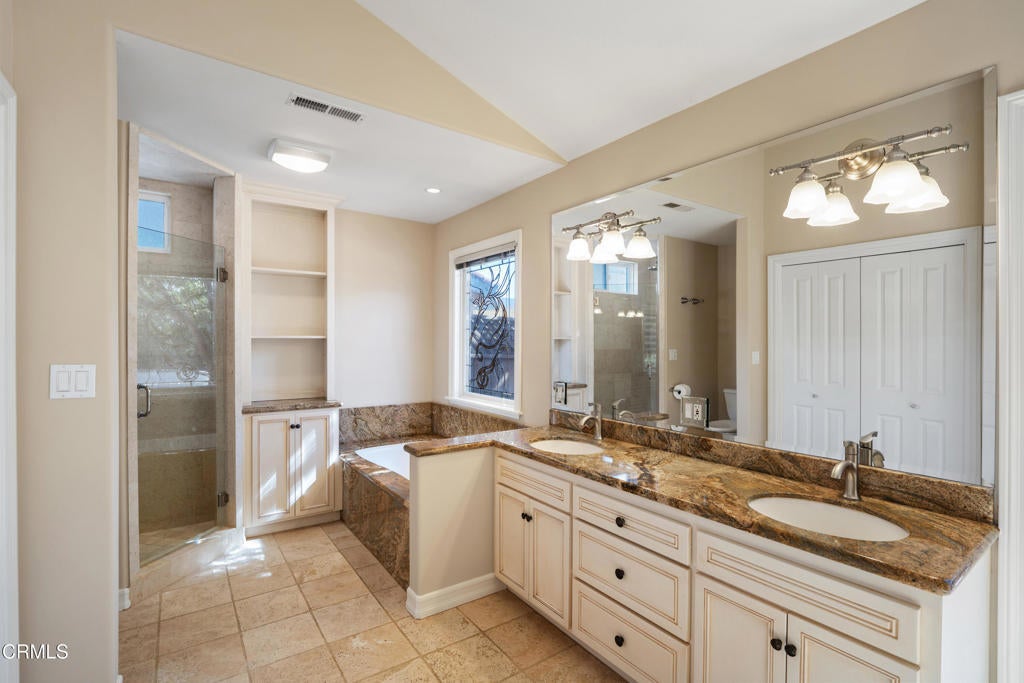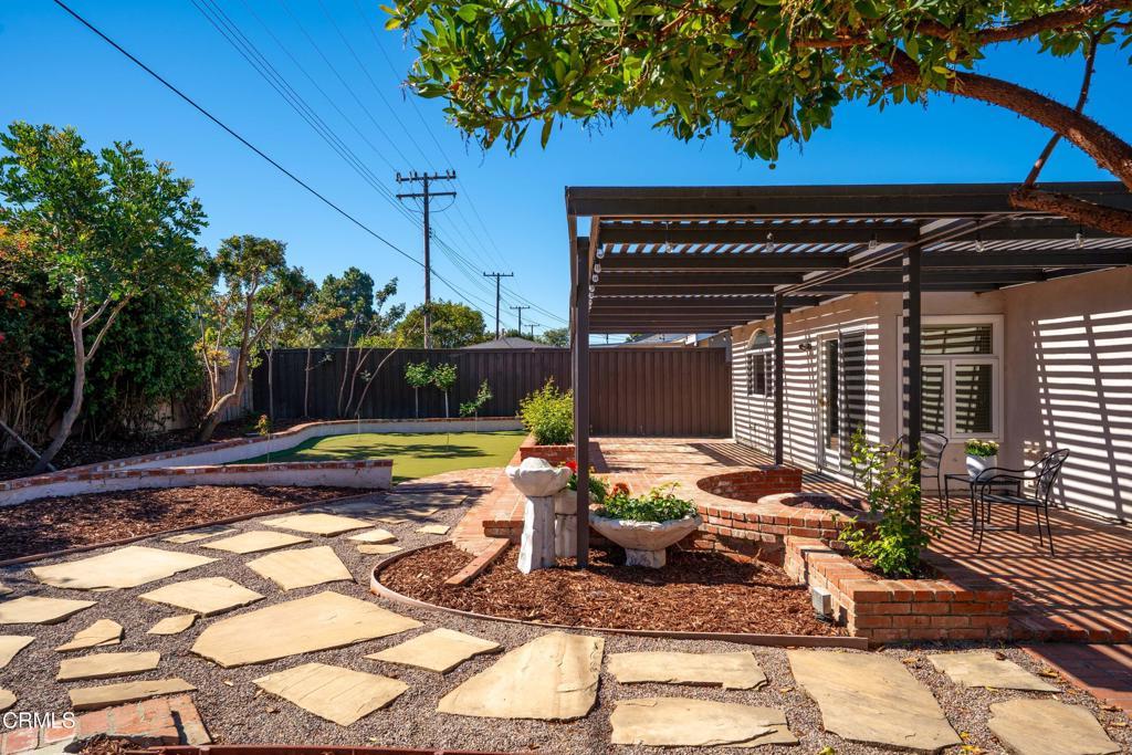 Lovely Single-Story Home with Custom Upgrades Throughout! Step into this beautifully upgraded home featuring an open and spacious floor plan with vaulted ceilings and elegant archways that create a bright, airy ambiance - making the home feel even larger than its square footage suggests. Wood like plank flooring, dual-pane windows, recessed lighting, and central A/C for year-round comfort. The cozy living room boasts a gas fireplace, perfect for relaxing evenings. Custom oversized picture window in the kitchen brings the outdoors in, offering beautiful natural light. Charming kitchen provides breakfast bar, newer gas range, built-in microwave, stainless steel dishwasher, pull-out pantry shelving, and refrigerator (included without warranty). The large dining area features a built-in buffet and opens directly to a private entertainer's backyard oasis. Designed for low-maintenance enjoyment, the backyard includes an expansive pergola-covered patio, built-in gas firepit, tranquil fountain, ample seating space for outdoor living, hook-ups for gas BBQ, and even a putting green! Retreat to the serene primary suite with a built-in dresser and TV nook, two closets, dual vanity, soaking tub, separate walk-in shower, and direct access to the backyard. One of the secondary bedrooms is currently used as a home office, complete with built-in desk and shelving in the closet. The stylishly updated hall bathroom features a walk-in shower with a sleek glass enclosure. This home is a must see to fully appreciate the value-added features rarely found at this price point. Additional highlights include extra driveway parking and no rear neighbors. Located on a tree lined street just a short stroll to nearby park. Desirable East Ventura neighborhood. Don't miss the opportunity to make this wonderful house your home!