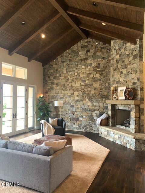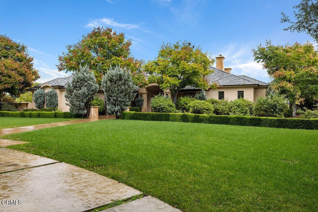 Designed by renowned architect Braden Sterling, this timeless French Provincial estate blends refined craftmanship with the serenity of wide-open Ojai Valley landscapes. Set on 2.1 private usable acres with unobstructed panoramic views of the iconic Topa Topa Mountains, this 4,244 sq ft residence offers five bedrooms, four bathrooms, and every amenity for luxurious indoor-outdoor living.French doors line the back of the home, opening to a resort-style backyard complete with a sparking swimming pool, adjoining spa and cozy fire pit---all framed by rose gardens, raised vegetable beds, and an orchard of mature fruit trees. The property also features two outbuildings, each with a retractable roof, ideal for creative pursuits or flexible workspaces. With room for horses and direct access to the Ojai River Preserve trails and Los Padres National Forest, this is true California living at its finest.Inside, the open, light-filled floorplan showcases high beamed ceilings, tile and hardwood flooring throughout much of the home, and a welcoming chef's kitchen that flows into the great room perfect for entertaining. The indulgent primary suite is a private retreat, featuring dual walk-in closets, serene views, and a spa-like bathroom. Two wings of the home are dedicated to guest or family bedrooms, ensuring privacy and comfort. Three fireplaces add warmth and character, while fire sprinklers throughout provide peace of mind. Additional highlights include a private well, slate roof, and a large storage room off the garage.Quiet, private, and perfectly positioned to capture sunrise and sunset views, this estate is a rare opportunity to own a piece of Ojai serenity.