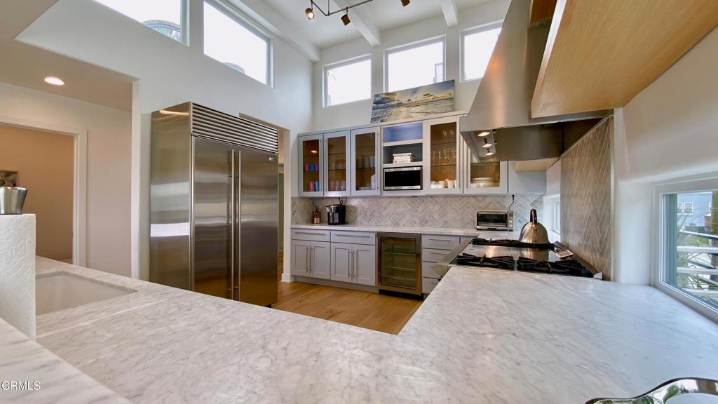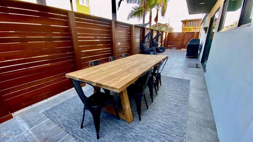 Discover the epitome of seaside luxury with this exquisite Silver Strand beach house, just steps from the sand. Three bedrooms, including a king-sized and two queen-sized beds, this tri-level oasis spans nearly 2,100 square feet. Immerse yourself in the coastal lifestyle with an impressive rooftop lounge perfect for watching the sunset over the ocean. Every detail within this dwelling is carefully curated, featuring designer furniture that complements the house's aesthetic perfectly. The open floor plan is a masterpiece of design, radiating a beachy-chic ambiance through a neutral color palette. Situated just steps from the flawless Silver Strand beach and adjacent to a sand volleyball court, this home offers breathtaking views of the ocean at sunrise and sunset. Indulge in a variety of coastal activities, such as surfing, fishing, kayaking, swimming, boogie boarding, jet skiing, and leisurely beach walks. Explore the charming town, complete with coastal bike paths, nearby restaurants, hotels, and attractions at the Channel Islands Harbor. Completely renovated in 2018 and a thoughtful refurnishing in 2020. Built in 1981, this 2,085 square foot home spans multiple levels. The lower level comprises two bedrooms, one bath, a den with a pull-out queen sofa bed, and an expansive side yard with an outdoor shower. Ascend to the upper level to find a spacious living room with a queen-sized pullout sofa, a chef's dream kitchen with Wolf appliances, a Sub-Zero refrigerator, custom shelving, beautiful shaker cabinets, and Carrera marble counters. The warm and inviting primary bedroom, also on the second level, features woven light wood blinds, a ceiling fan, and a luxurious private en-suite bath with an impressive tiled shower, dual sinks, and custom built-ins. The primary bedroom opens onto an extravagant rooftop deck with stunning ocean views, multiple seating and dining areas, and a firepit, making it the perfect spot to unwind and relish in the coastal beauty.