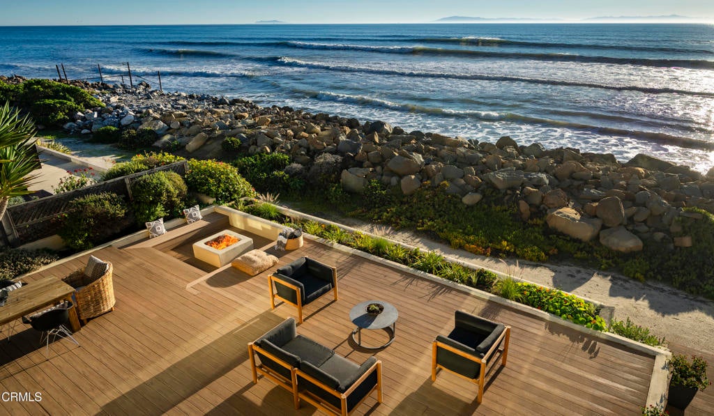 One of California's most iconic stretches of coastline, this oceanfront residence offers a front-row to the waves of Hobson Beach Park and the relaxed, timeless rhythm of the Rincon. Located within a gated seaside enclave and positioned perfectly between Santa Barbara and Ventura, the home blends privacy, convenience, and the incomparable experience of waking up with the Pacific ocean at your doorstep. Warm wood floors and expansive windows set the tone for casual luxury throughout the main level, where the living, dining, and kitchen spaces flow naturally toward a generous ocean-side deck. Here, outdoor living becomes effortless, morning coffee with the surf, evenings gathered around the fire, and panoramic views that shift with every tide. Upstairs, the primary suite feels like a private retreat, complete with a fireplace, walk-in closet, and a travertine bathroom inspired by boutique coastal resorts. An ocean-facing balcony extends the suite outdoors, offering a perch to watch surfers, spot dolphins, or savor the sunset. A second upstairs bedroom also enjoys ocean views, while a spacious flex room provides endless possibilities: a home office, media room, gym, studio, or additional guest quarters. The gated community enhances the sense of retreat, yet the location remains remarkably accessible--just 15-20 minutes to Santa Barbara or Ventura, and moments to local beaches, parks, and scenic coastal drives. Rarely do oceanfront homes in this exclusive setting come to market. This is more than a residence, it's an opportunity to claim a piece of the California coast and enjoy a lifestyle shaped by surf, sunshine, and the enduring beauty of the Pacific.