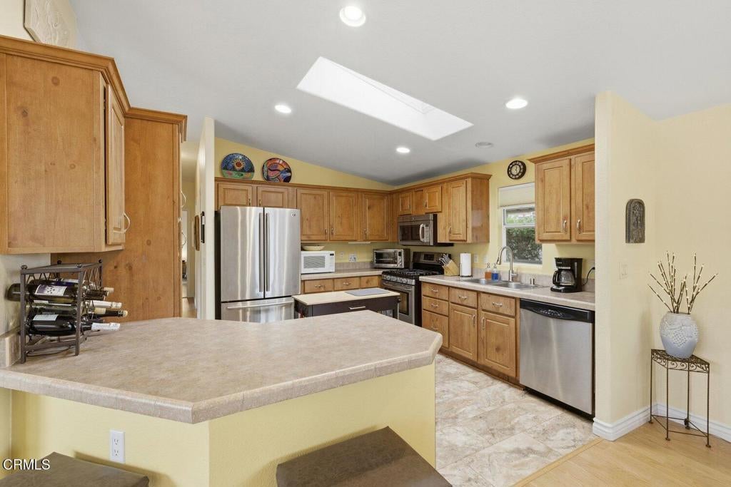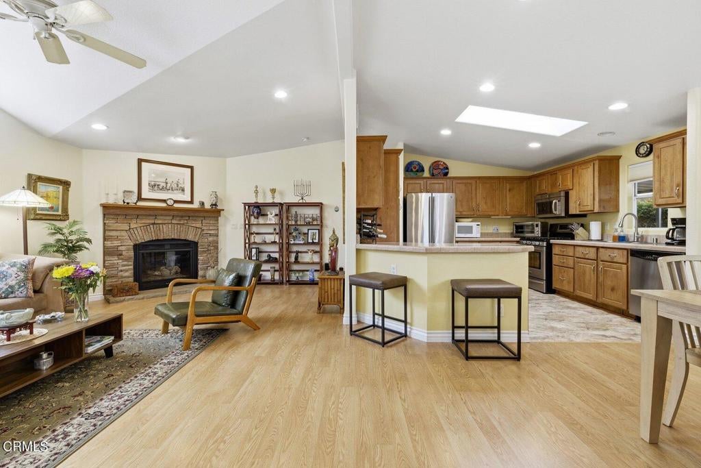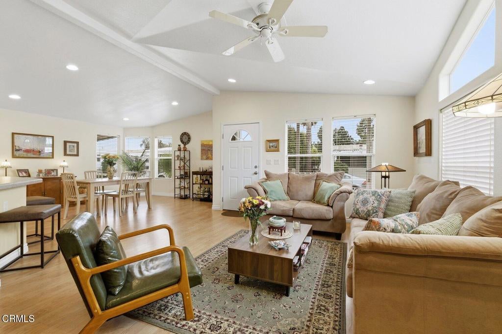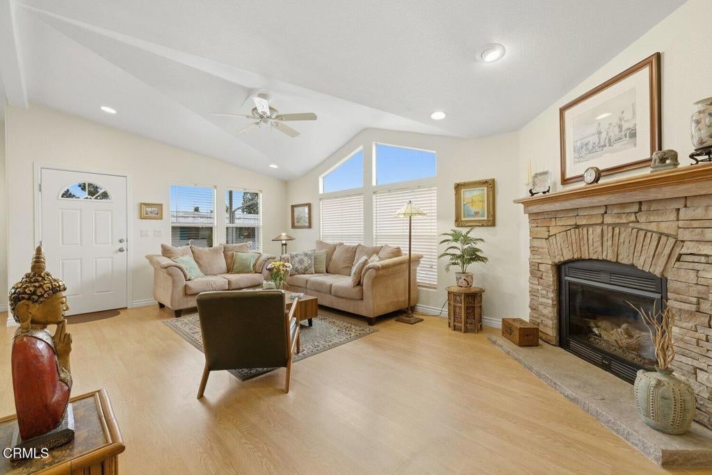 Located at 1150 Ventura Blvd., Space 10, this move-in ready, well-maintained 2 -bedroom, 2-bath manufacture home in the gated Camarillo Mobile Estates Community was built in 2005. The home offers approximately 1,449 sq. ft. of living space on a 3,600 sq. ft. lot and features a welcoming front porch. The spacious kitchen is equipped with modern stainless steel appliances and opens to an open-concept living area with beautiful wood-laminate flooring and a cozy fireplace. Laundry is conveniently located inside the home. The fully fenced side and rear yard provides a private outdoor. Space rent is $2,060 per month. The park features amenities like a pool, spa, and clubhouse.