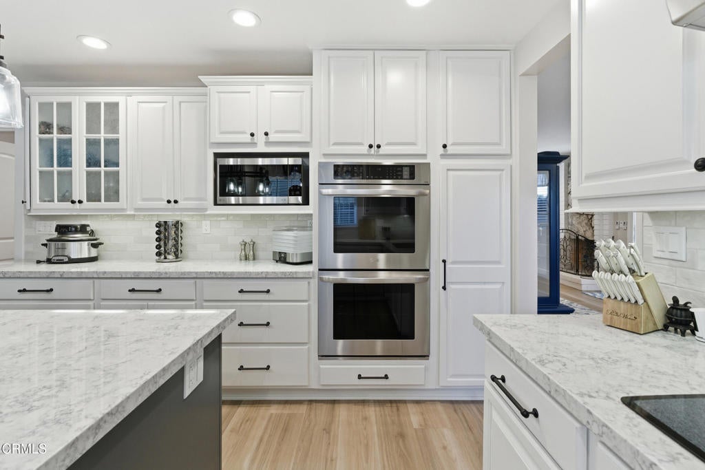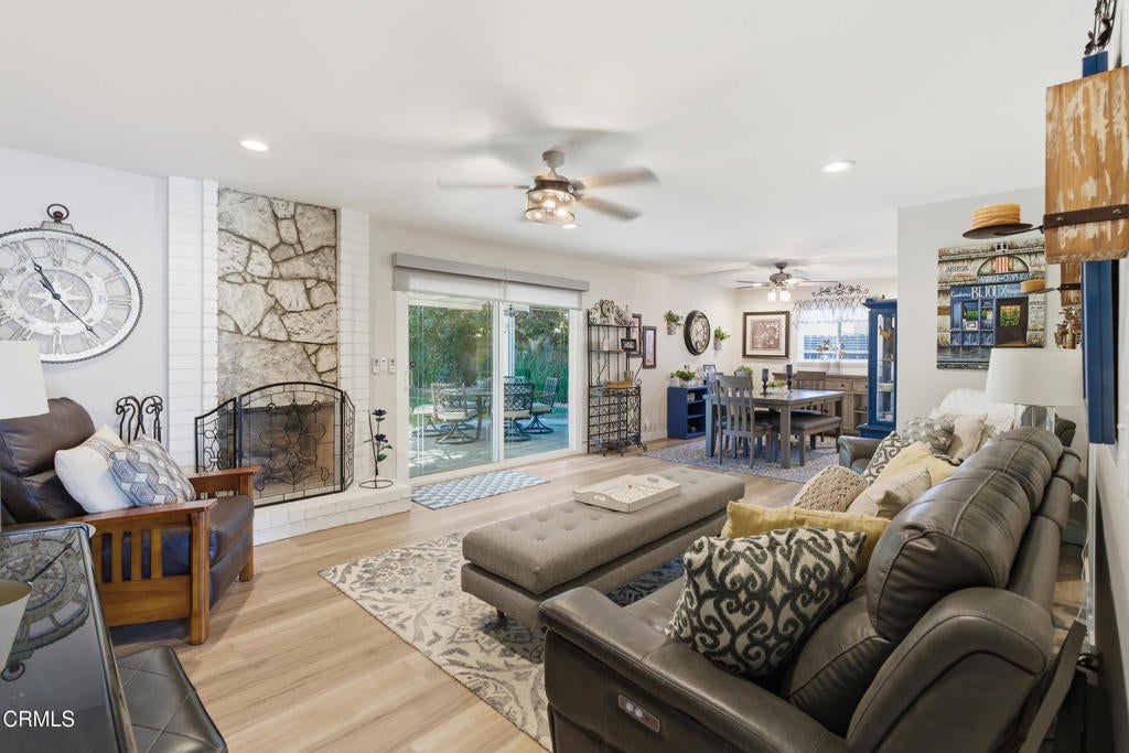 This beautifully upgraded, single-story home in the desirable Woodhaven community offers both comfort and style. With four spacious bedrooms and fully remodeled bathrooms featuring modern double-sink vanities, the home is thoughtfully designed for everyday living.The kitchen has been completely transformed with brand-new LG appliances, elegant quartzite countertops, and contemporary finishes--perfect for cooking and entertaining. New vinyl wood plank flooring flows seamlessly throughout the home, creating a cohesive and updated feel.A charming laundry room adds both function and style, featuring new cabinetry, quartzite counters, and a tile backsplash. The expansive family room boasts vaulted ceilings, while the formal living and dining areas showcase large dual-pane sliding glass doors that open to a peaceful, mature backyard.Outdoors, you'll find a private retreat with new fencing and a covered patio equipped with dual ceiling fans--ideal for relaxing or hosting gatherings. Additional upgrades include dual-pane windows, smooth ceilings, new air ducts for improved efficiency, owned solar panels, a new A/C system, and a newer roof.The finished two-car garage offers plenty of space for storage or projects, and the home is surrounded by beautifully maintained landscaping. This move-in-ready gem is a wonderful opportunity to enjoy modern living in a sought-after neighborhood.