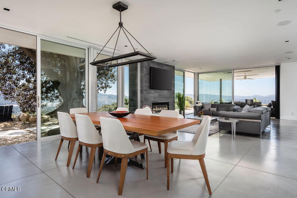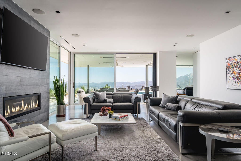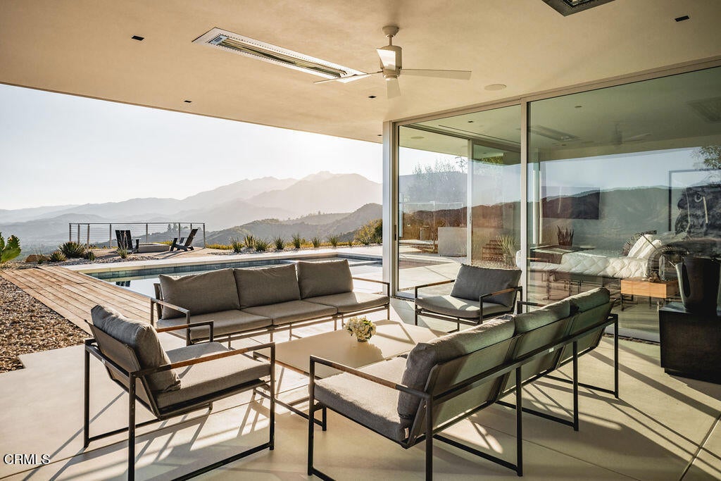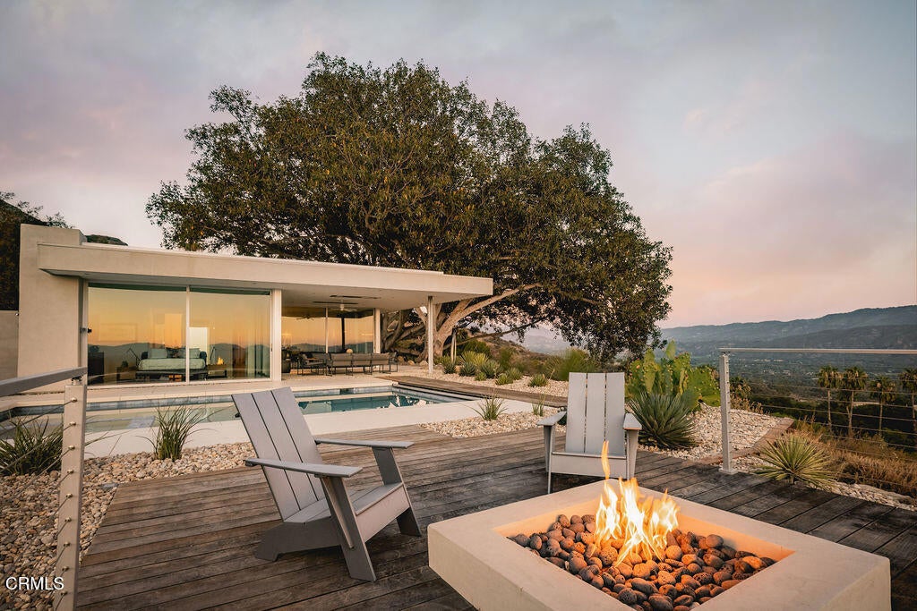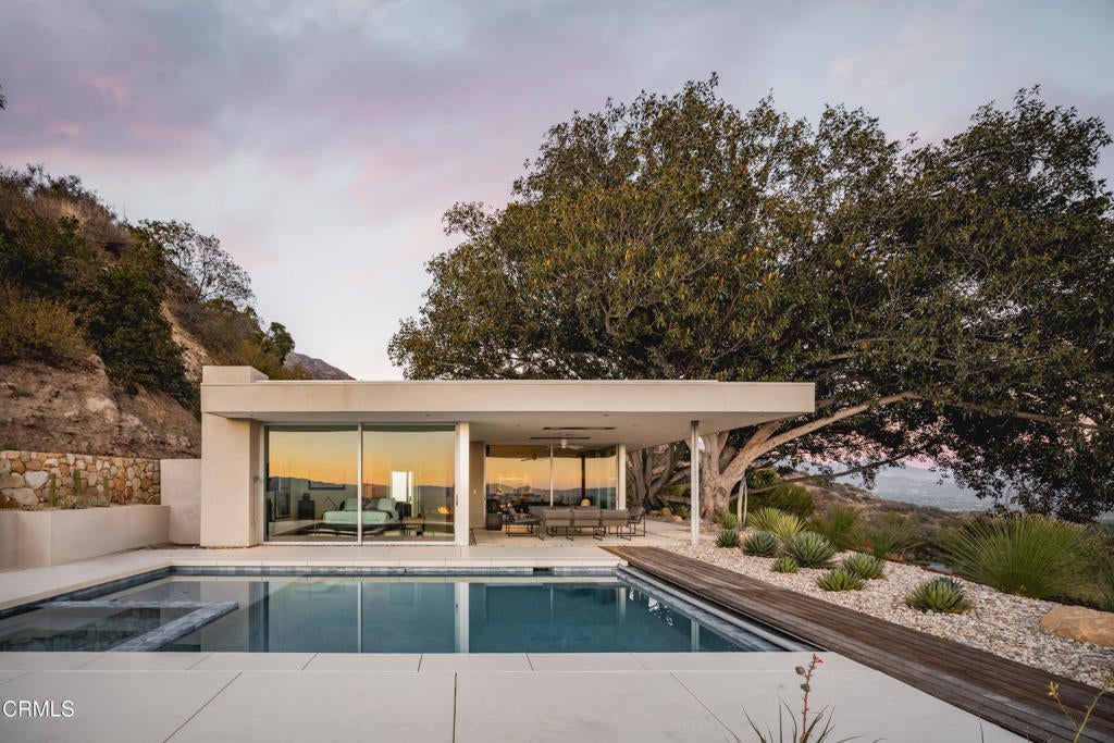 The Glass House! Perched along Ojai's iconic Foothill Road, this architectural retreat is a sanctuary of light, glass, and Zen-like serenity, an exquisite union of design and nature. Built in 2017, the single-level home spans 3,154 sf with walls of glass that dissolve the boundaries between indoors and out, framing an expansive 270-degree view of mountains, valley, and sky. Minimalist yet inviting, the interiors balance polished concrete floors with sculptural quartz surfaces, complemented by the landscape's organic beauty, inspiring both stillness and creativity. Re-envisioned in 2022, the property was elevated with a 1,117-sf Pavilion, a modern addition featuring showcase-style parking with a private yoga and fitness studio, sauna, an inspired space where wellness and architecture converge. The main home transformation also added a media lounge and a fourth bedroom, enhancing versatility while preserving refined elegance. Two additional dwellings enrich the sense of retreat: a creative atelier, ideal for quiet work or writing, and an intimate leisure cabana, welcoming meditation, wellness, and relaxation. Together, these structures form an inspiring compound designed for reflection, connection, and balance. Set upon 1.87 acres shaded by magnificent Moreton Bay fig trees, the grounds unfold like a living canvas: a sparkling pool with spa, sun-dappled decks, a Tuscan-inspired courtyard for al fresco dining, and fire-lit terraces where Ojai's legendary Pink Moment illuminates the horizon. From nearly every vantage point, the views are transcendent: fog drifting over ridges, sunsets spilling gold across the valley, and starlit nights that feel infinite. More than a home, this is a glass-walled sanctuary in the treetops, an architectural jewel and meditative Zen haven, offering one of Ojai's most extraordinary perspectives. One Of A Kind.