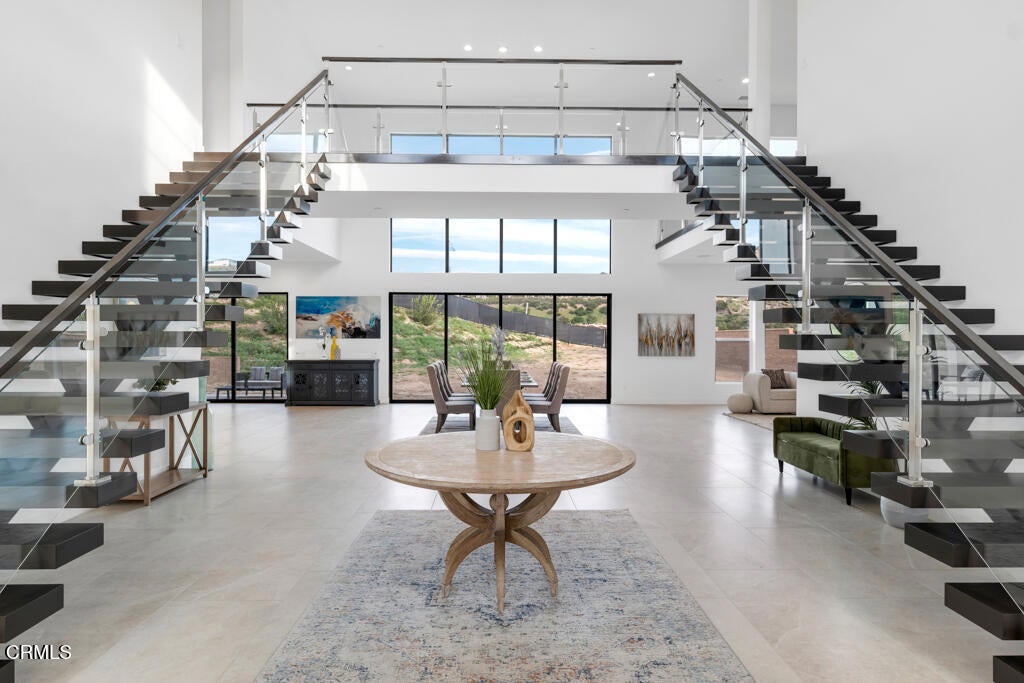 MOVE IN READY and over 500K in UPGRADES!Located in The Ridge at Bella Vista, this stunning home captures the essence of modern California living and makes an unforgettable first impression. From the moment you step through the covered entry and double doors, the home exudes luxury and is filled with natural light, soaring ceilings, and architectural drama that immediately set the tone.Understandably, the Idylwild is the most sought after floorplan with striking dual floating staircases and glass handrails that anchor the dramatic two-story foyer, while expansive, high-end glass wall systems flood the living spaces with warm light and open seamlessly to the outdoors, creating true indoor-outdoor living. The gourmet kitchen is a showpiece, seamlessly blending stunning design with exceptional functionality. Anchored by a large center island with gorgeous upgraded Cosentino quartz countertops and breakfast bar, it features upper cabinetry, a butler's pantry, a 48-inch Wolf professional range, and a Sub-Zero built-in refrigerator--an absolute chef's dream. Flowing effortlessly from the kitchen, the expansive dining space and great room balance sophistication and comfort with a sleek designer fireplace and an upgraded home-theater system with surround sound.The primary suite is a true retreat, thoughtfully upgraded with the coveted owner's retreat option, a spacious walk-in closet, and a spa-inspired bath with dual vanities, a soaking tub, and an oversized deluxe shower. Secondary bedrooms are equally well appointed, each with en-suite bathrooms featuring upgraded finishes for style, comfort, and privacy.Additional highlights include a versatile flex space off the foyer, a desirable first-floor bedroom suite with private bath, a drop zone, centrally located laundry, generous storage, and an additional upstairs family room. Throughout the home, thoughtful upgrades and smart-home enhancements add both comfort and convenience, while added features such as a built-in security system, premium interior insulation, a carefully selected lighting package, and solar further elevate the property. All of this is set on a spacious, private lot with sunrise views and distance from neighbors within one of Porter Ranch's most coveted neighborhoods.Conveniently located near award-winning schools, a newly developed 50-acre community park, and The Vineyards shopping destination, which offers an upscale, boutique-style mix of restaurants, cafes, and specialty grocery stores