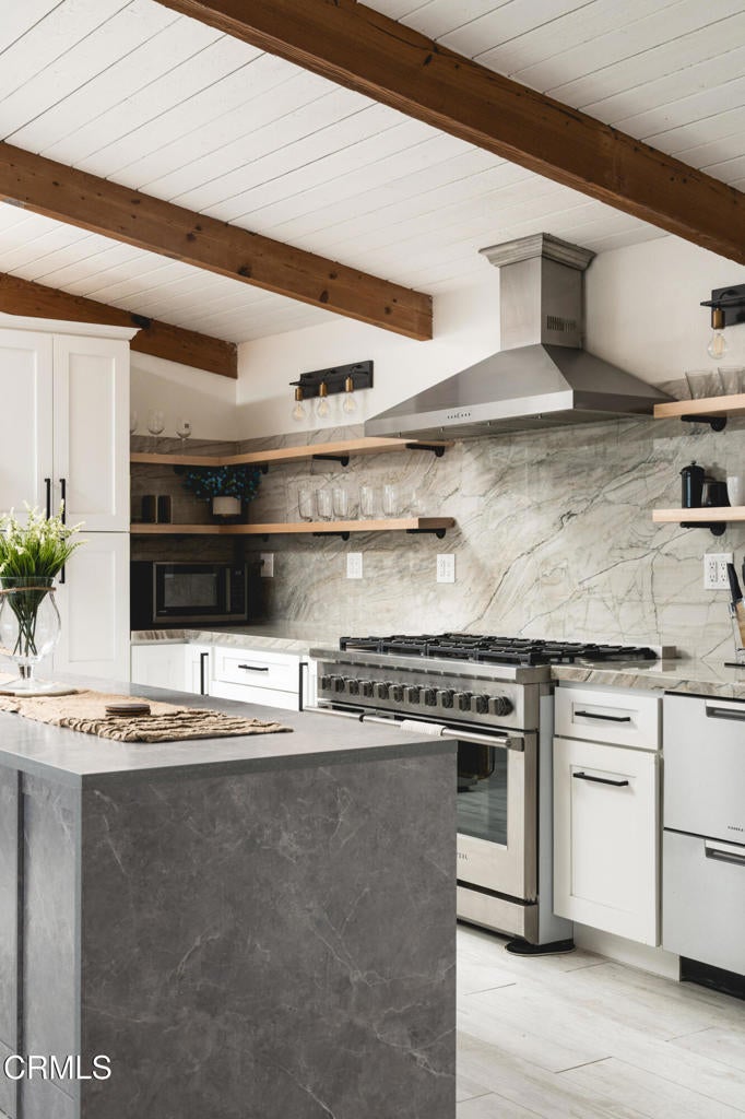 Beamed Ceilings, Balcony, Separate/Formal Dining Room, Eat-in Kitchen, High Ceilings, Living Room Deck Attached, Open Floorplan, Bedroom on Main Level, Main Level Primary, Primary Suite, Stone Counters
