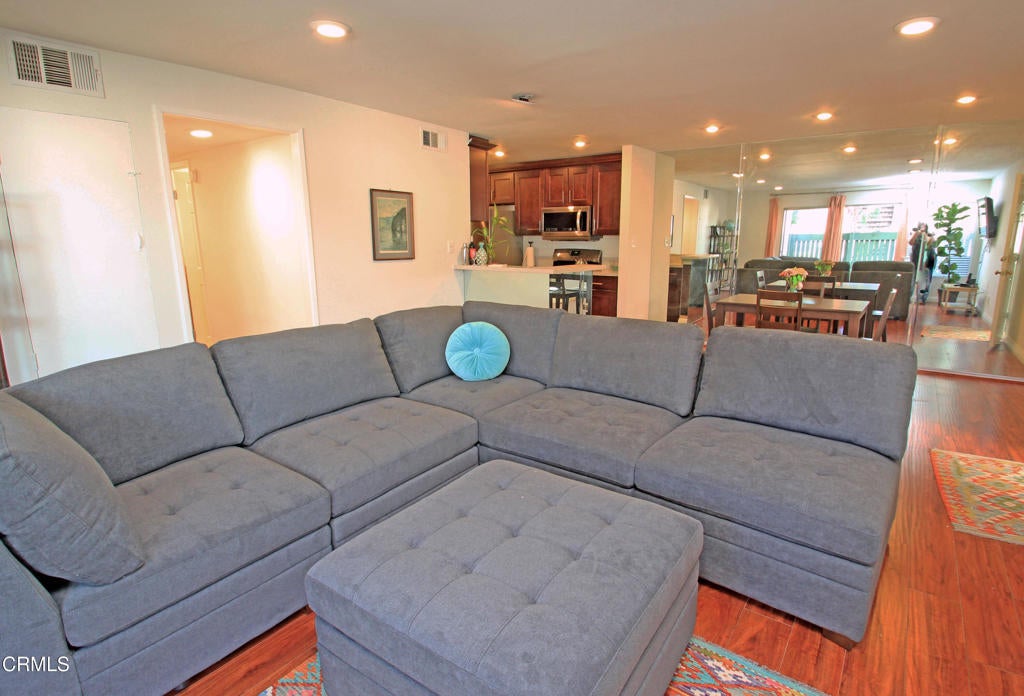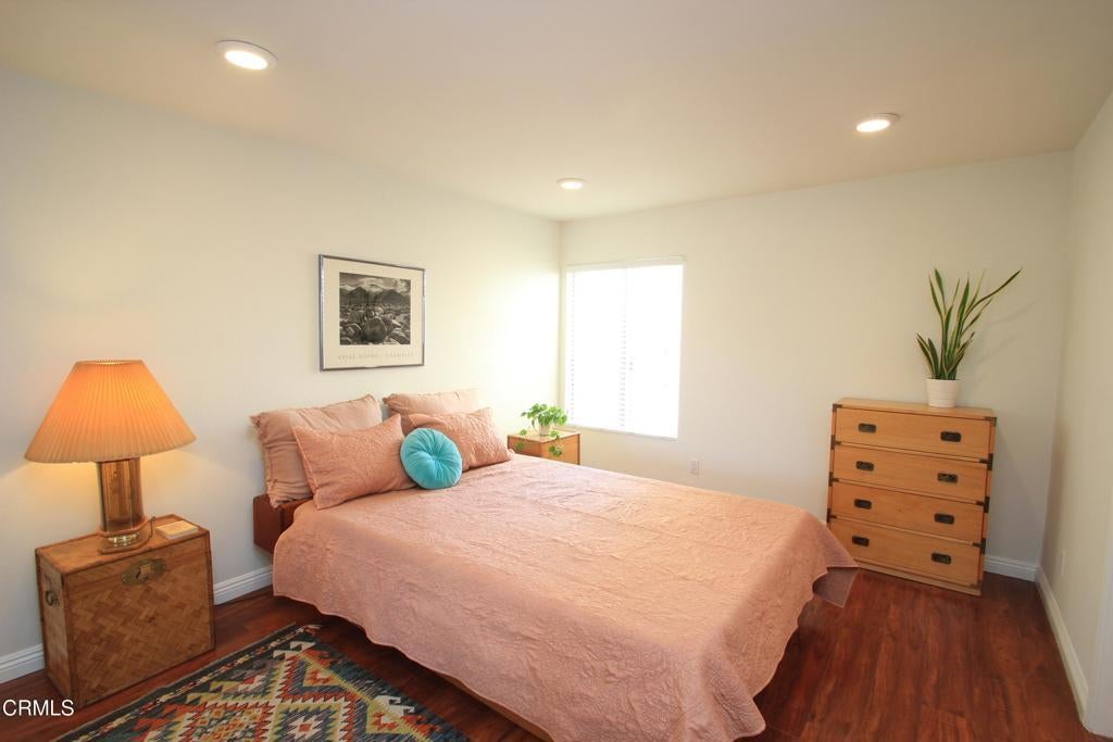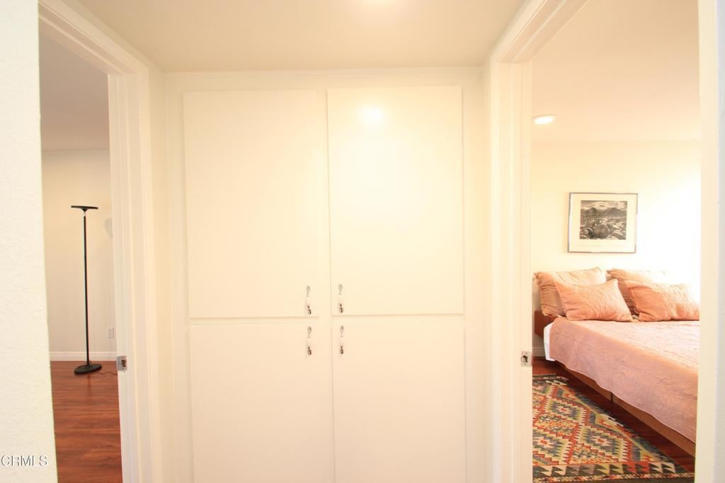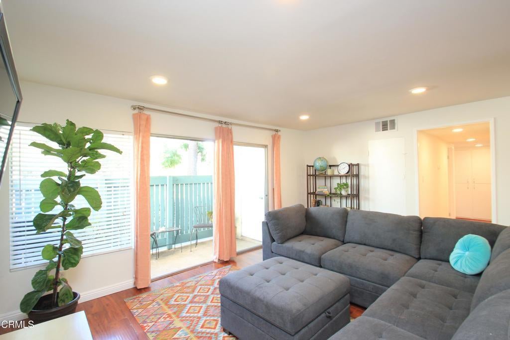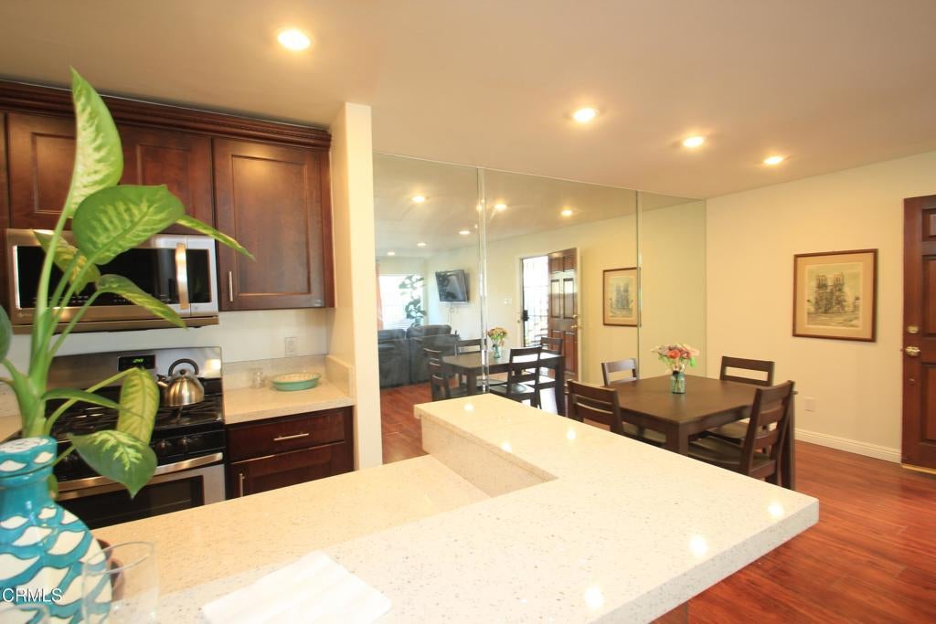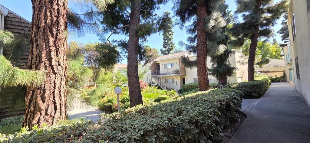 Welcome to this elegant and sophisticated single-story, ground-floor condominium featuring a thoughtfully designed floor plan and stylish updates throughout. Freshly painted interiors and beautiful wood-like flooring create a bright, inviting atmosphere from the moment you enter.The spacious living room offers plenty of room for relaxing or entertaining and opens to a cozy, private patio--perfect for enjoying morning coffee or evening breezes. The dining area is enhanced by dramatic floor-to-ceiling mirrors that reflect natural light and create an open, airy feel.The kitchen features quartz countertops, lovely cabinetry, and ample workspace for everyday cooking or hosting guests. Both the primary and secondary bathrooms have been fully updated with custom tile and stone finishes, adding a touch of luxury to the home.Bedrooms are generously sized and include mirrored closet doors and excellent storage space. A convenient hall linen closet adds additional organization.Located in a centrally situated gated community with a peaceful, park-like setting surrounded by mature, tall trees. Residents enjoy amenities including a swimming pool and convenient on-site laundry facilities. Unit features two assigned parking spaces one of which is covered.A wonderful opportunity to own a beautifully maintained home in a serene and well-located complex.