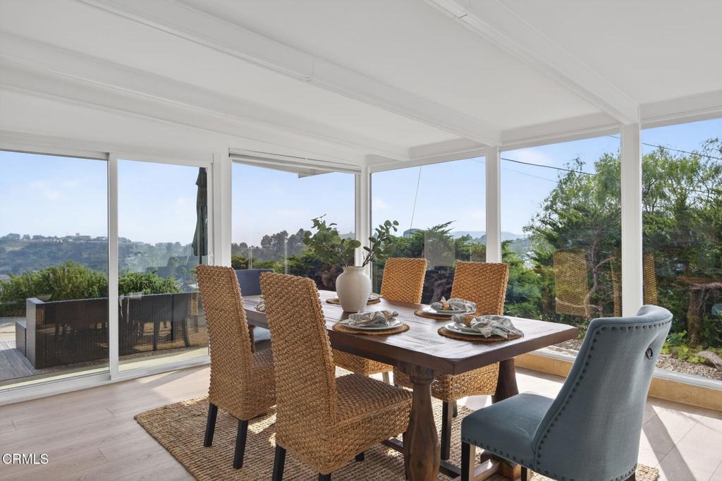 Set on the coveted hillsides of Ondulando in Ventura, this exceptional 4-bedroom, 3-bath residence offers approximately 2,070 sq ft of refined living space plus an enclosed California sunroom, all positioned to capture arguably the most breathtaking panoramic views in the entire neighborhood. From the backyard and sunroom, take in sweeping vistas of the Pacific Ocean, Channel Islands, Ventura city lights, and surrounding hillsides--a truly remarkable backdrop for both everyday living and unforgettable entertaining.Inside, the home has been thoughtfully reimagined with modern upgrades and elegant finishes throughout. Expansive new sliding glass doors and large skylights flood the interior with natural light, highlighting the new premium luxury vinyl plank flooring that flows seamlessly throughout the home.The designer kitchen features custom white cabinetry with soft-close doors and drawers, complemented by a full suite of KitchenAid Elite appliances installed in 2024, including a refrigerator, oven, gas cooktop, microwave, and dishwasher. A stylish coffee bar and wet bar add both convenience and sophistication, while French doors open to the 270 sq ft California sunroom--a stunning space perfectly positioned to enjoy the home's extraordinary ocean and island views year-round.Bathrooms have been tastefully updated with frameless glass rain-head showers and modern cabinetry, creating spa-like retreats within the home.Beyond the interiors, the property is enhanced by significant system upgrades, including a 2024 Bosch split-system heat pump HVAC, controllable via wall thermostat or smartphone app, a 2024 AquaSure Harmony whole-house water softener, and a Navien NPE-210A2 tankless water heater installed in 2023. New gutters were installed in 2025, ensuring long-term functionality and peace of mind.Step outside to an entertainer's dream backyard, where a large concrete patio and a 13' x 13' Purple Leaf luxury gazebo with zip netting and curtains create the perfect setting to host gatherings while enjoying Ventura's iconic coastal sunsets. The low-maintenance front yard features artificial turf and drip-irrigated landscaping, while the side yard includes a 2024 Craftsman storage shed. Additional conveniences include a utility sink in the garage.Combining modern upgrades, thoughtful design, and one of the most spectacular vantage points in Ondulando, this home represents a rare opportunity to experience coastal Ventura living at its finest.
