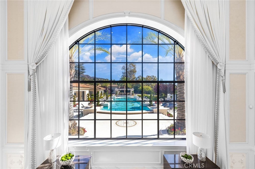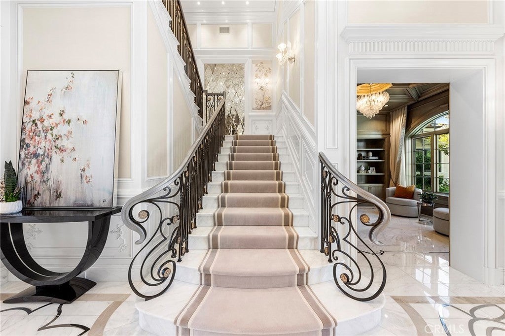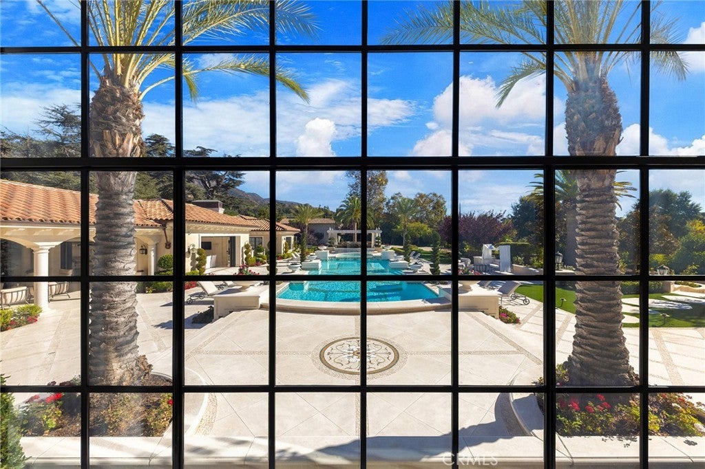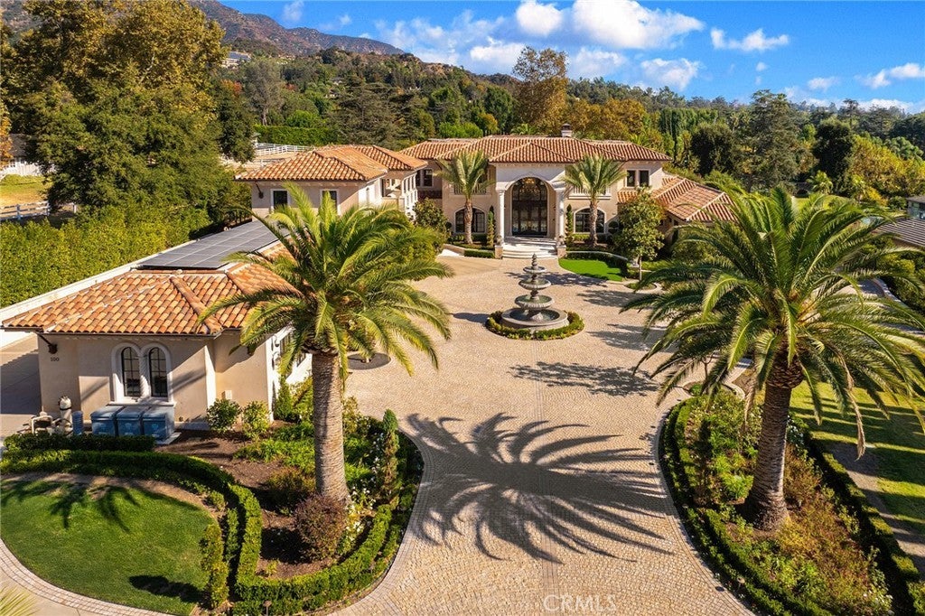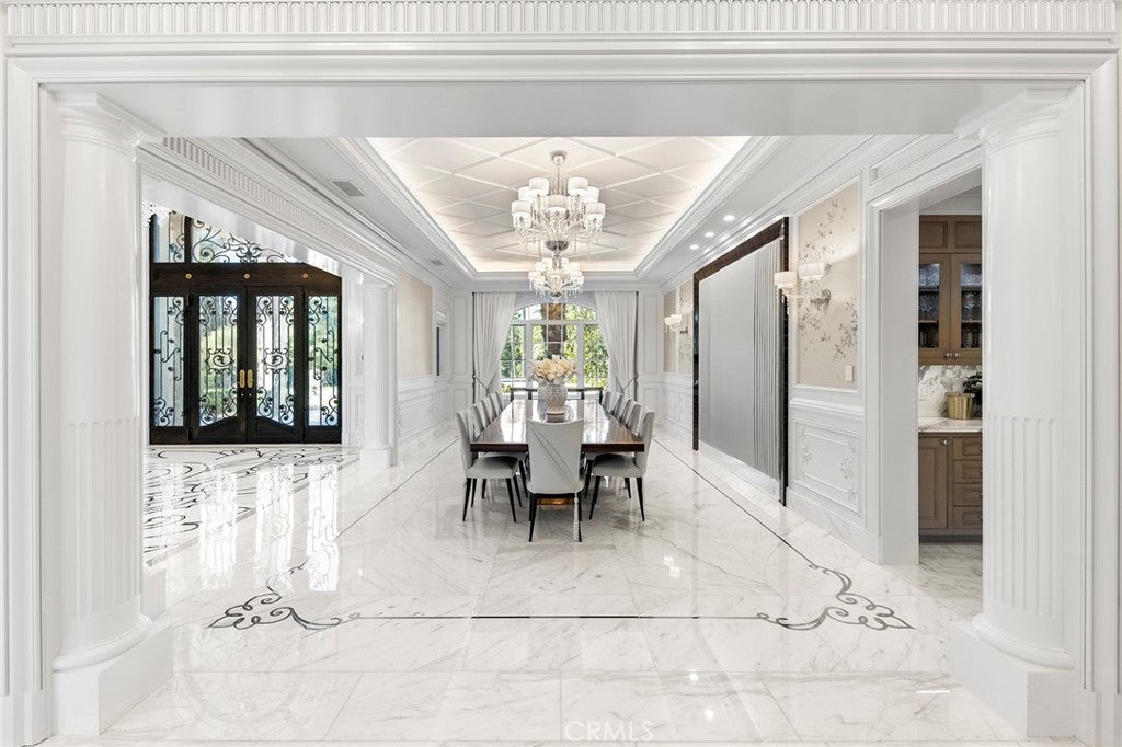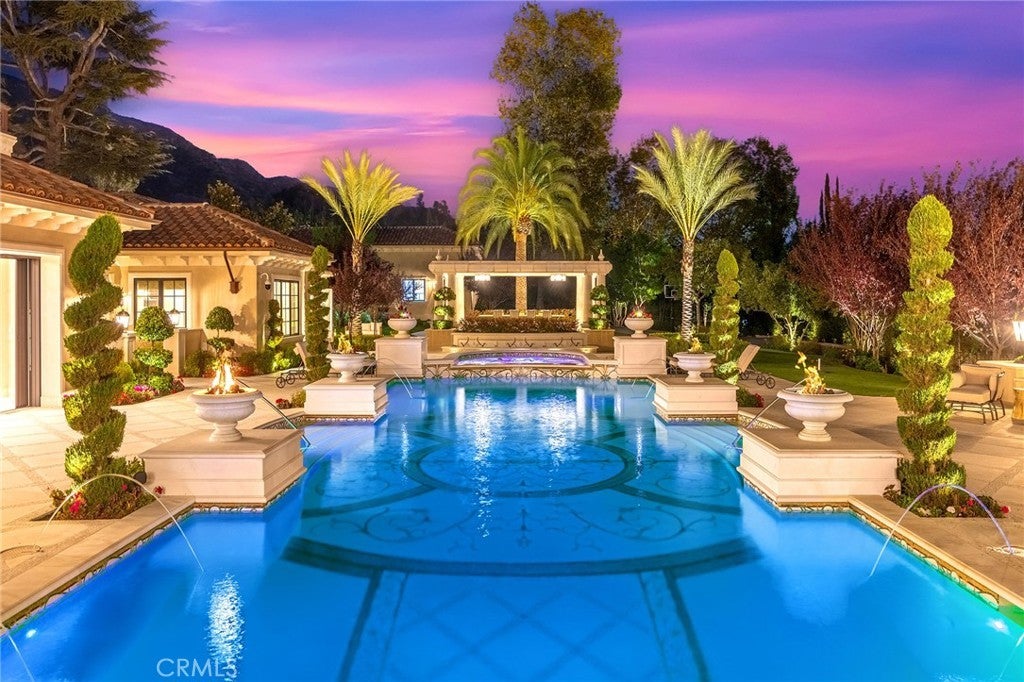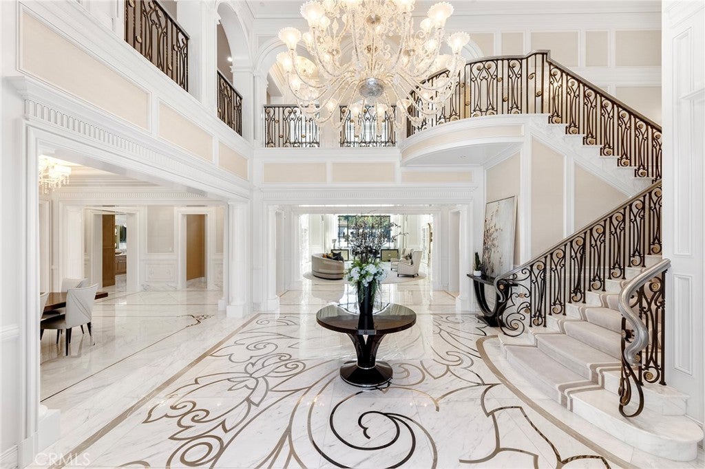 Welcome to an extraordinary estate within the prestigious Bradbury Estates, where unparalleled luxury meets timeless sophistication behind secure, guarded gates. This magnificent Tuscan-inspired residence, encompassing over 14,600 square feet, stands as a masterpiece of architectural excellence. Drawing inspiration from the legendary Bellagio, the residence showcases an harmonious blend of classical elegance and contemporary refinement. The grand entrance immediately captivates with its two-story domed ceiling, crowned by a spectacular custom Murano glass chandelier suspended above imported Caldia marble flooring from Carrara, Italy. Hand-embroidered silk wallcoverings and Lalique crystal sculptures create an atmosphere of refined opulence. The home's flowing layout features eight luxuriously appointed bedroom suites, each uniquely adorned with custom chandeliers and artisanal finishes. Nine impeccably designed bathrooms showcase premium marble and sophisticated fixtures. The formal living spaces boast soaring ceilings, marble fireplaces, and expansive windows that frame views of the mosaic swimming pool and meticulously landscaped grounds. A state-of-the-art smart home system, valued at $1.5 million, seamlessly controls every aspect of this remarkable property. Additional amenities include an indoor lap pool, a climate-controlled outdoor living area with automated sliding doors, and a separate guest house complete with two bedroom suites and kitchenette. The executive wing features a sophisticated office with a conference room, while fitness enthusiasts will appreciate the fully equipped gym. Architectural details throughout include coffered ceilings, intricate crown moldings, and bespoke cabinetry crafted by master artisans. Palm-lined streets and self-sufficient energy infrastructure complete this extraordinary estate, offering an unparalleled living experience where luxury knows no bounds.