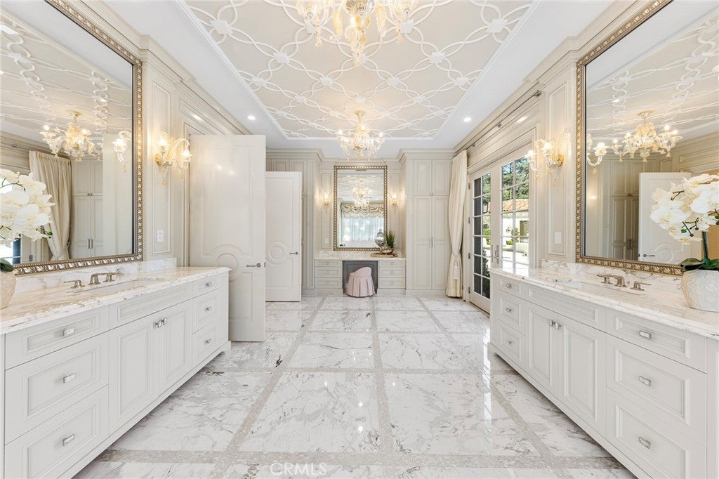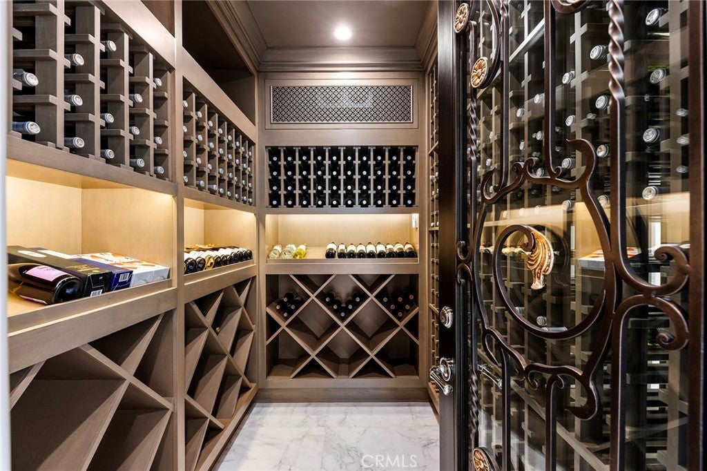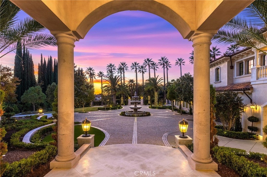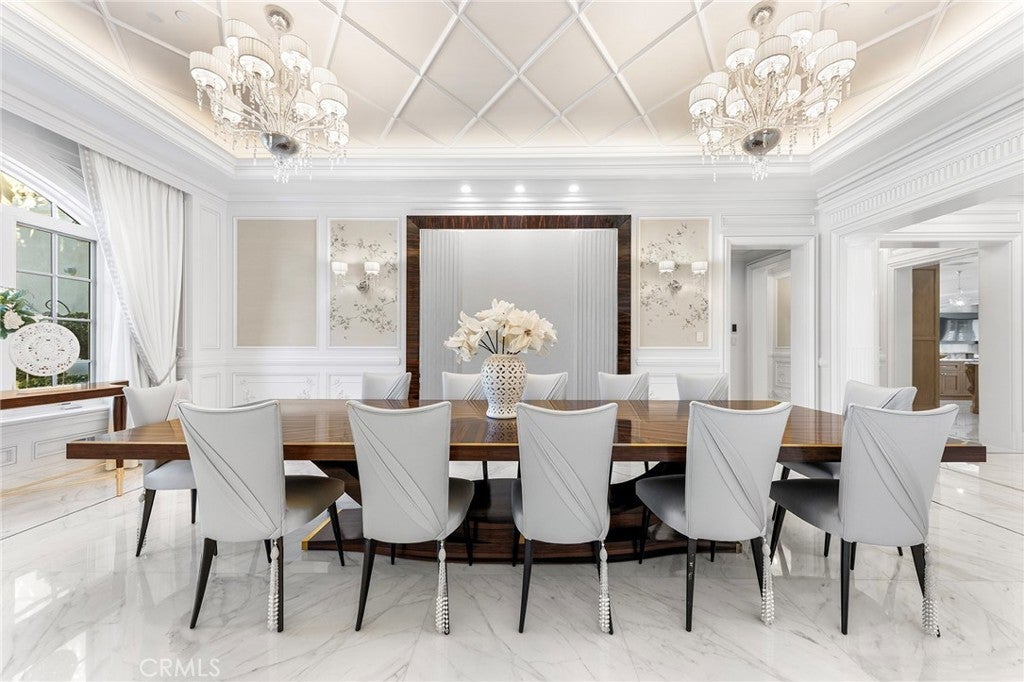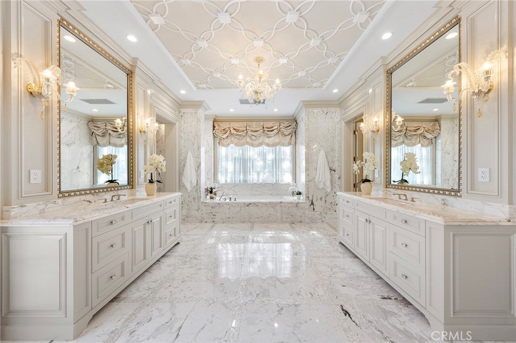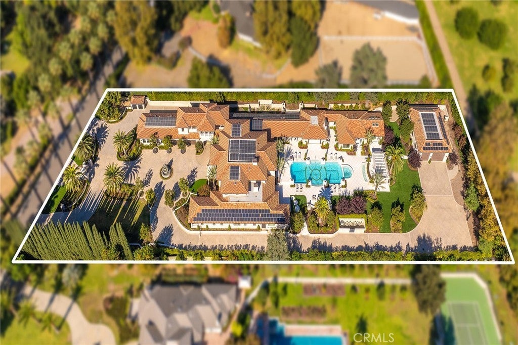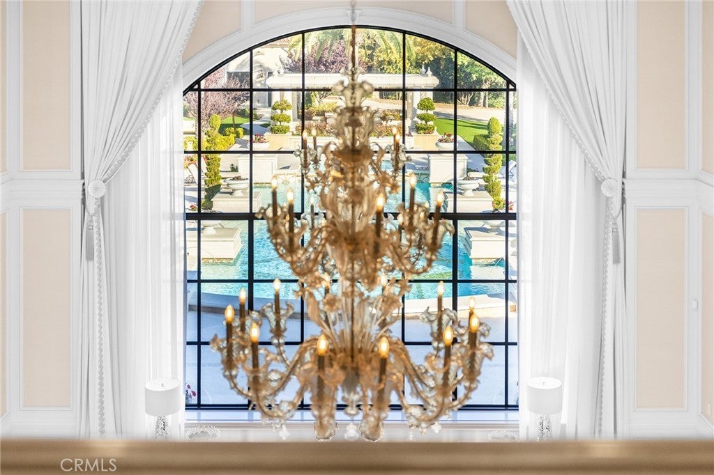 Welcome to an extraordinary estate within the prestigious Bradbury Estates, where unparalleled luxury meets timeless sophistication behind secure, guarded gates. This magnificent Tuscan-inspired residence, encompassing over 14,600 square feet, stands as a masterpiece of architectural excellence. Drawing inspiration from the legendary Bellagio, the residence showcases an harmonious blend of classical elegance and contemporary refinement. The grand entrance immediately captivates with its two-story domed ceiling, crowned by a spectacular custom Murano glass chandelier suspended above imported Caldia marble flooring from Carrara, Italy. Hand-embroidered silk wallcoverings and Lalique crystal sculptures create an atmosphere of refined opulence. The home's flowing layout features eight luxuriously appointed bedroom suites, each uniquely adorned with custom chandeliers and artisanal finishes. Nine impeccably designed bathrooms showcase premium marble and sophisticated fixtures. The formal living spaces boast soaring ceilings, marble fireplaces, and expansive windows that frame views of the mosaic swimming pool and meticulously landscaped grounds. A state-of-the-art smart home system, valued at $1.5 million, seamlessly controls every aspect of this remarkable property. Additional amenities include an indoor lap pool, a climate-controlled outdoor living area with automated sliding doors, and a separate guest house complete with two bedroom suites and kitchenette. The executive wing features a sophisticated office with a conference room, while fitness enthusiasts will appreciate the fully equipped gym. Architectural details throughout include coffered ceilings, intricate crown moldings, and bespoke cabinetry crafted by master artisans. Palm-lined streets and self-sufficient energy infrastructure complete this extraordinary estate, offering an unparalleled living experience where luxury knows no bounds.