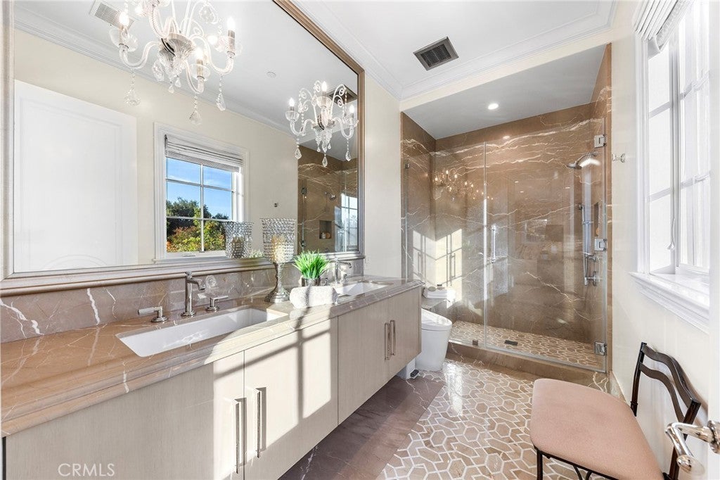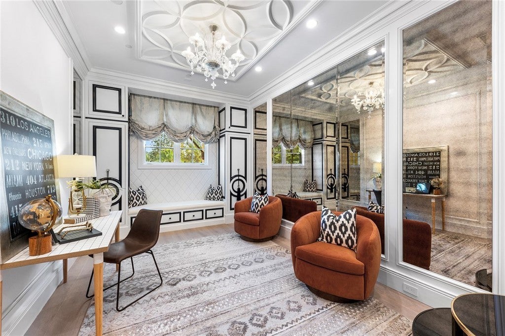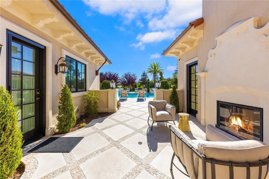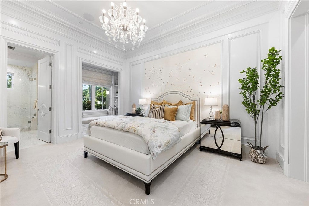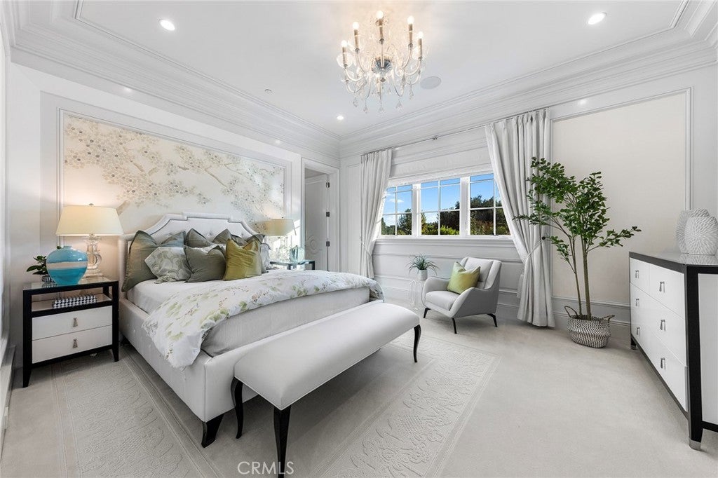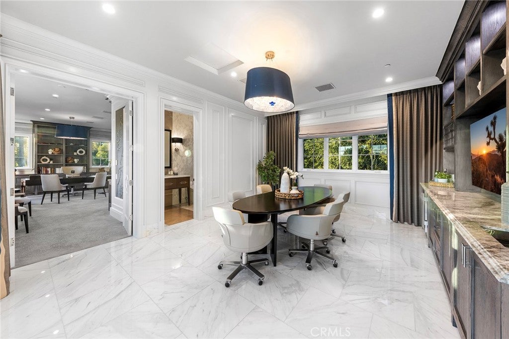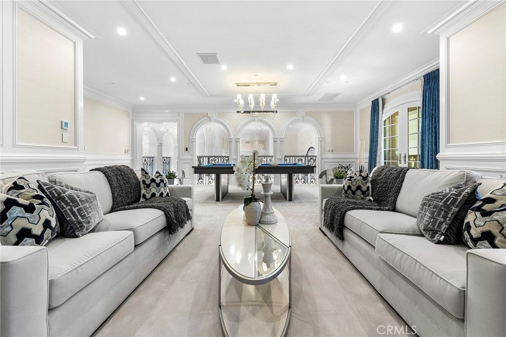 Welcome to an extraordinary estate within the prestigious Bradbury Estates, where unparalleled luxury meets timeless sophistication behind secure, guarded gates. This magnificent Tuscan-inspired residence, encompassing over 14,600 square feet, stands as a masterpiece of architectural excellence. Drawing inspiration from the legendary Bellagio, the residence showcases an harmonious blend of classical elegance and contemporary refinement. The grand entrance immediately captivates with its two-story domed ceiling, crowned by a spectacular custom Murano glass chandelier suspended above imported Caldia marble flooring from Carrara, Italy. Hand-embroidered silk wallcoverings and Lalique crystal sculptures create an atmosphere of refined opulence. The home's flowing layout features eight luxuriously appointed bedroom suites, each uniquely adorned with custom chandeliers and artisanal finishes. Nine impeccably designed bathrooms showcase premium marble and sophisticated fixtures. The formal living spaces boast soaring ceilings, marble fireplaces, and expansive windows that frame views of the mosaic swimming pool and meticulously landscaped grounds. A state-of-the-art smart home system, valued at $1.5 million, seamlessly controls every aspect of this remarkable property. Additional amenities include an indoor lap pool, a climate-controlled outdoor living area with automated sliding doors, and a separate guest house complete with two bedroom suites and kitchenette. The executive wing features a sophisticated office with a conference room, while fitness enthusiasts will appreciate the fully equipped gym. Architectural details throughout include coffered ceilings, intricate crown moldings, and bespoke cabinetry crafted by master artisans. Palm-lined streets and self-sufficient energy infrastructure complete this extraordinary estate, offering an unparalleled living experience where luxury knows no bounds.