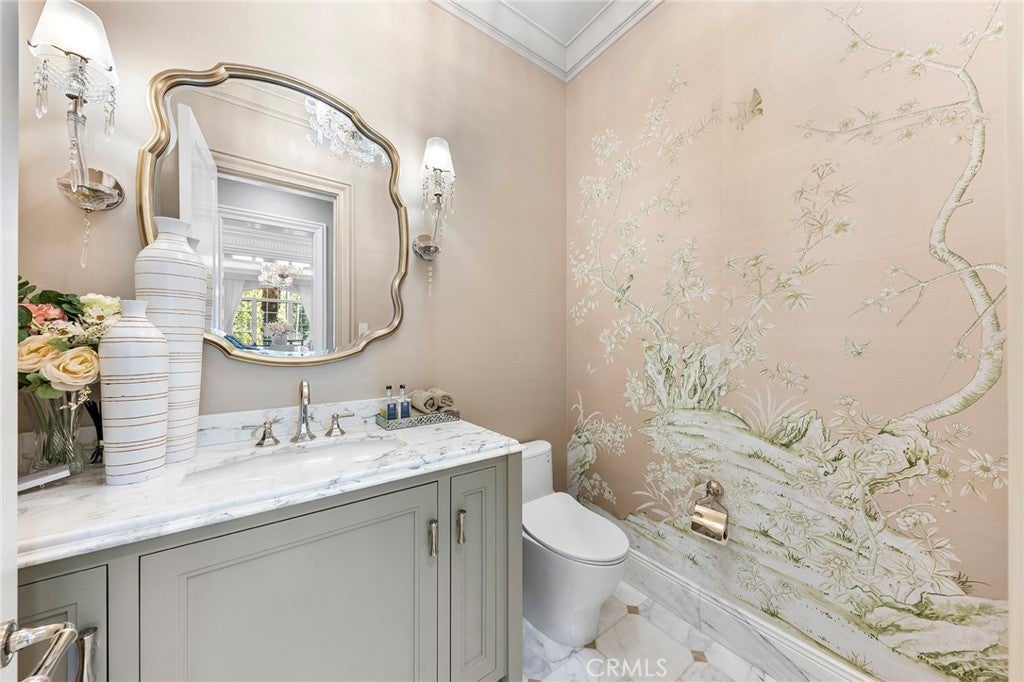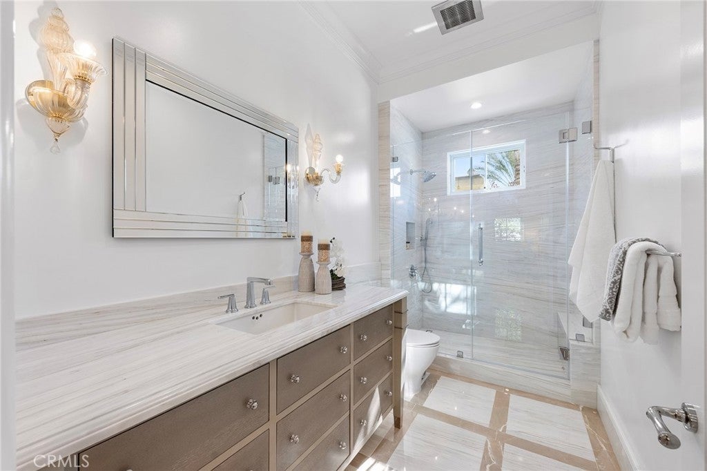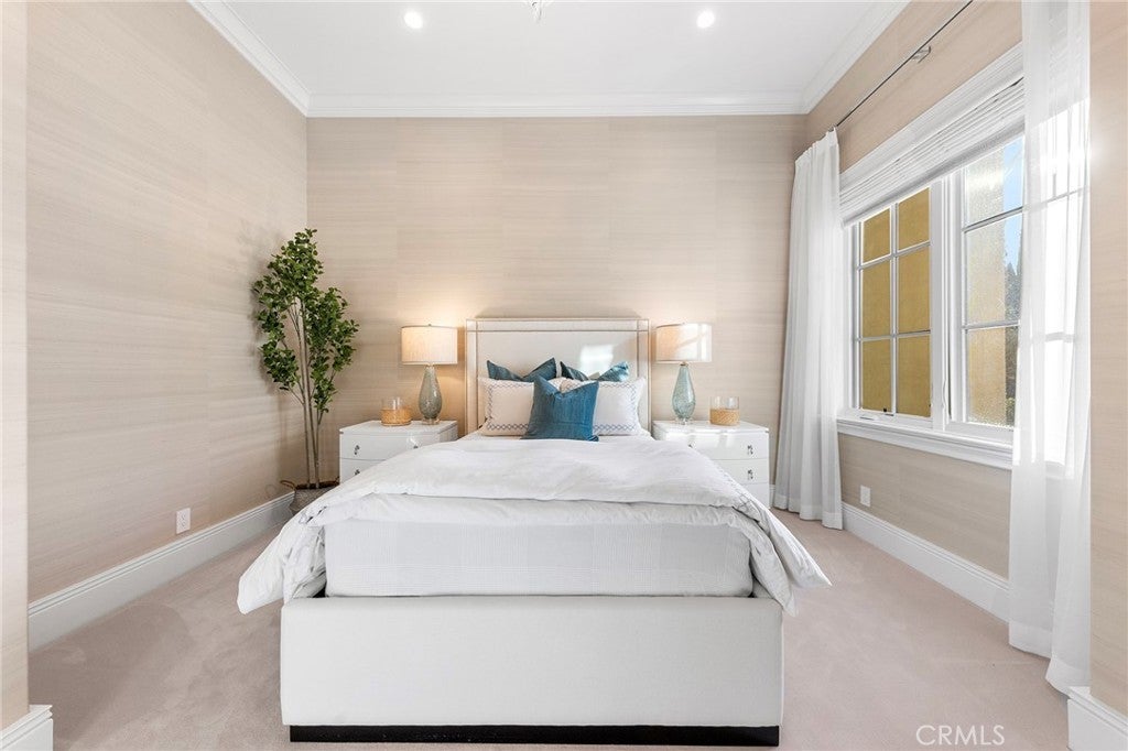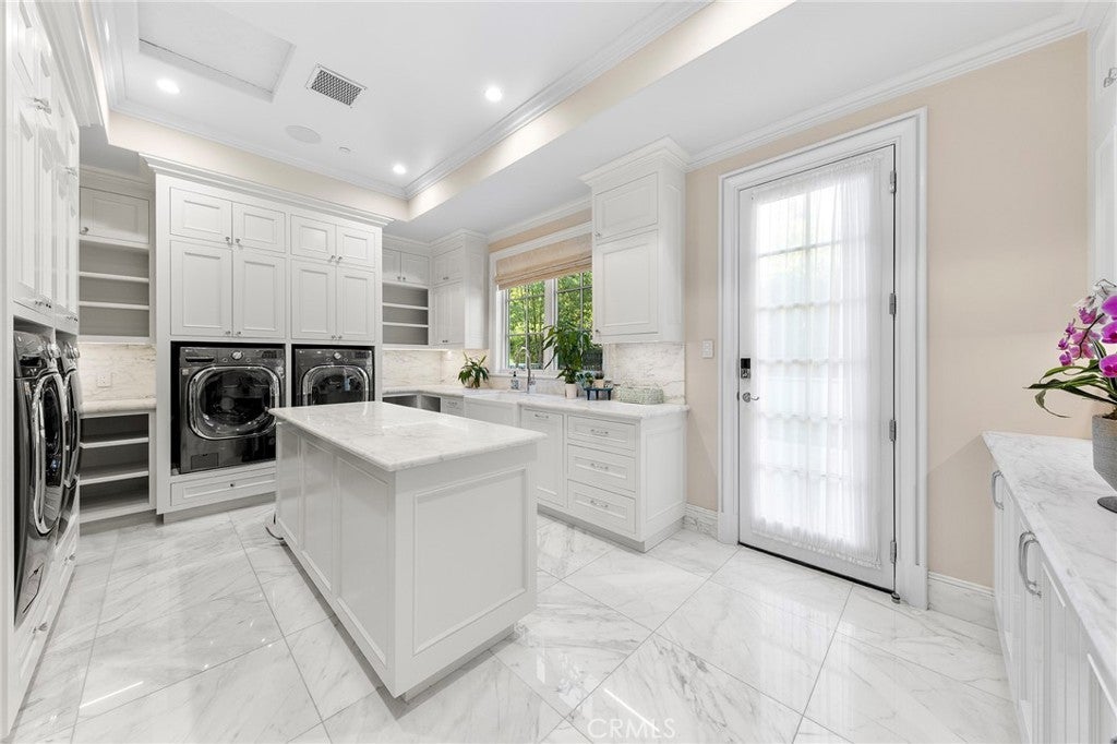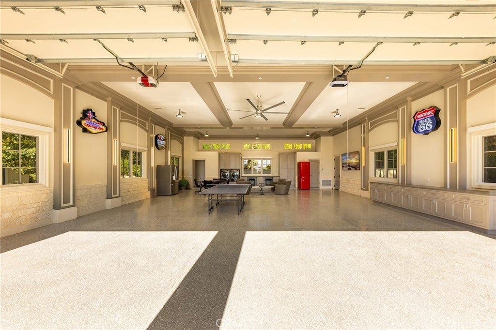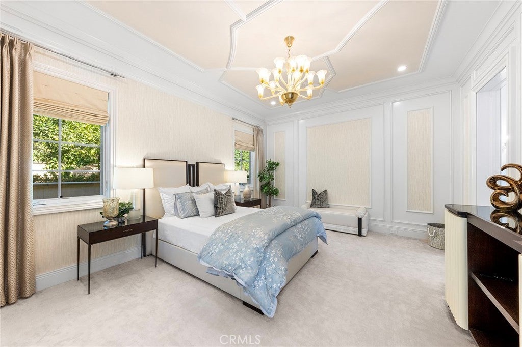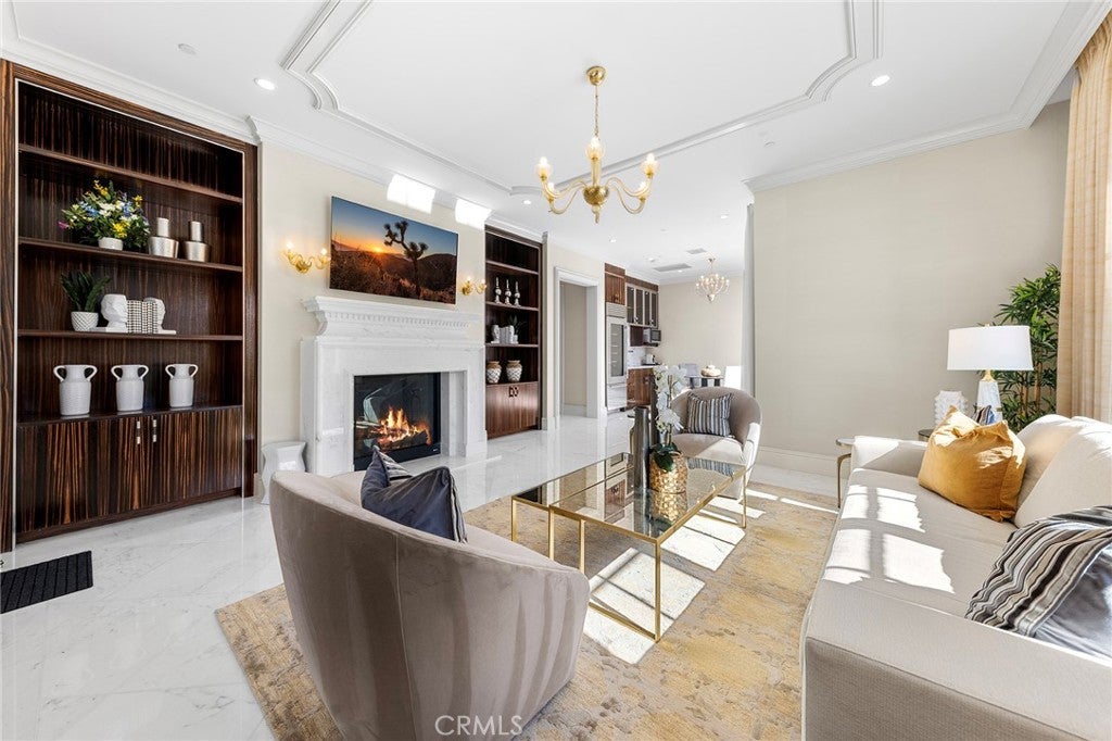 Welcome to an extraordinary estate within the prestigious Bradbury Estates, where unparalleled luxury meets timeless sophistication behind secure, guarded gates. This magnificent Tuscan-inspired residence, encompassing over 14,600 square feet, stands as a masterpiece of architectural excellence. Drawing inspiration from the legendary Bellagio, the residence showcases an harmonious blend of classical elegance and contemporary refinement. The grand entrance immediately captivates with its two-story domed ceiling, crowned by a spectacular custom Murano glass chandelier suspended above imported Caldia marble flooring from Carrara, Italy. Hand-embroidered silk wallcoverings and Lalique crystal sculptures create an atmosphere of refined opulence. The home's flowing layout features eight luxuriously appointed bedroom suites, each uniquely adorned with custom chandeliers and artisanal finishes. Nine impeccably designed bathrooms showcase premium marble and sophisticated fixtures. The formal living spaces boast soaring ceilings, marble fireplaces, and expansive windows that frame views of the mosaic swimming pool and meticulously landscaped grounds. A state-of-the-art smart home system, valued at $1.5 million, seamlessly controls every aspect of this remarkable property. Additional amenities include an indoor lap pool, a climate-controlled outdoor living area with automated sliding doors, and a separate guest house complete with two bedroom suites and kitchenette. The executive wing features a sophisticated office with a conference room, while fitness enthusiasts will appreciate the fully equipped gym. Architectural details throughout include coffered ceilings, intricate crown moldings, and bespoke cabinetry crafted by master artisans. Palm-lined streets and self-sufficient energy infrastructure complete this extraordinary estate, offering an unparalleled living experience where luxury knows no bounds.