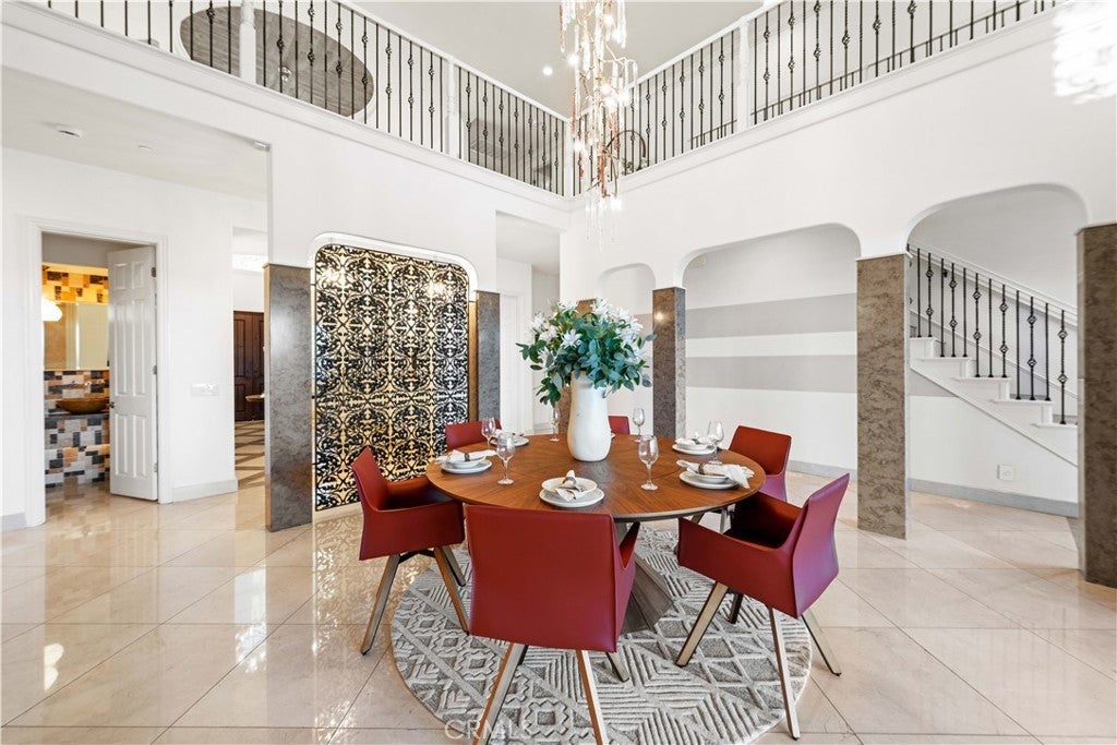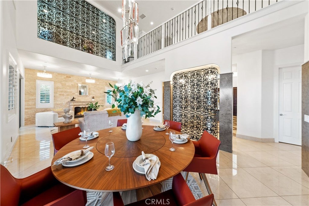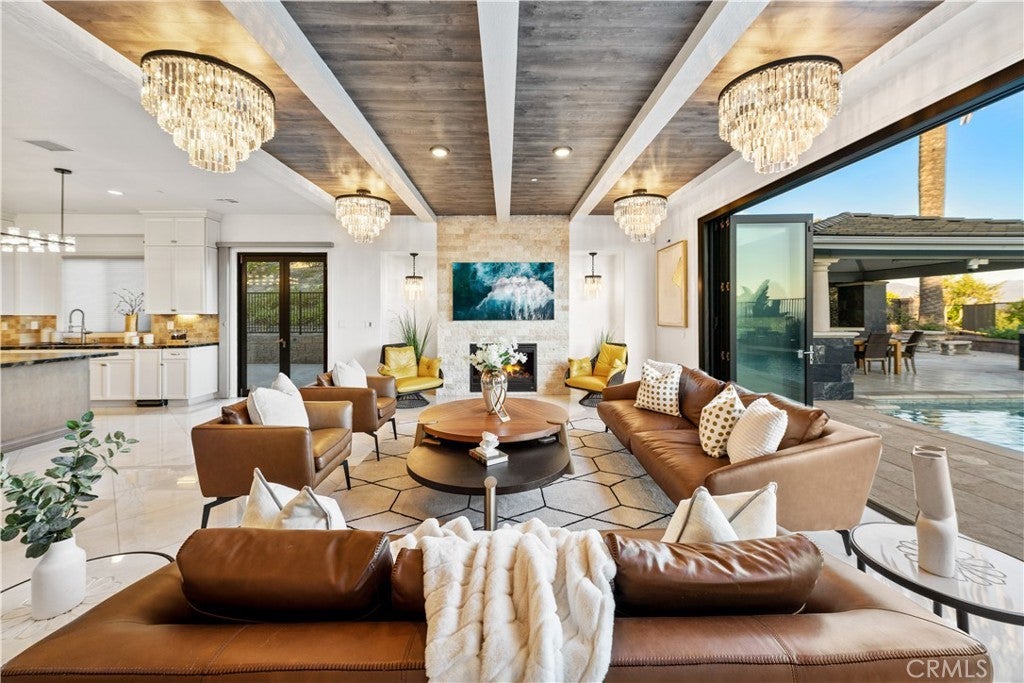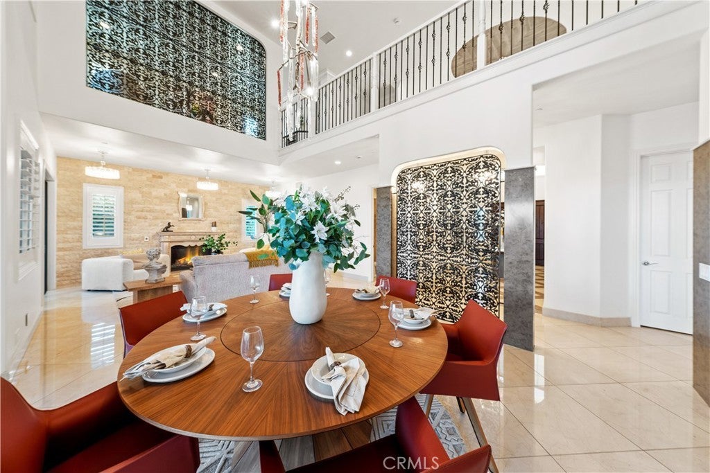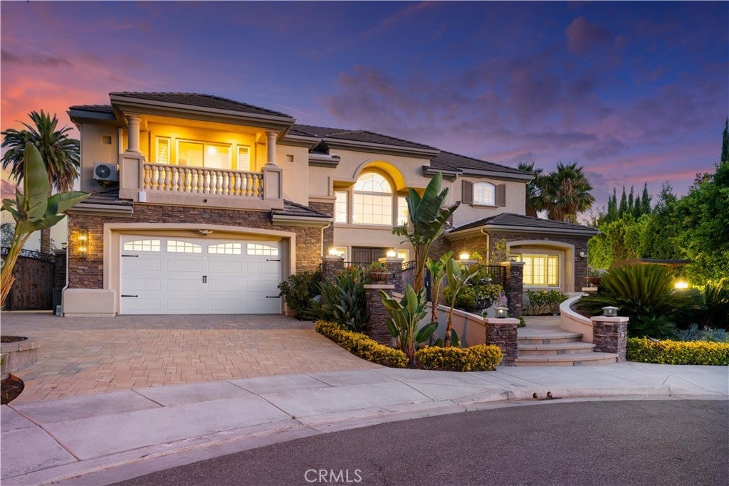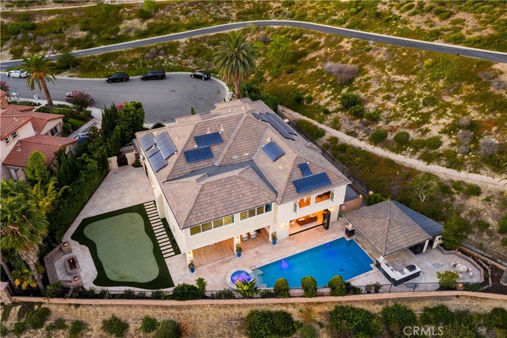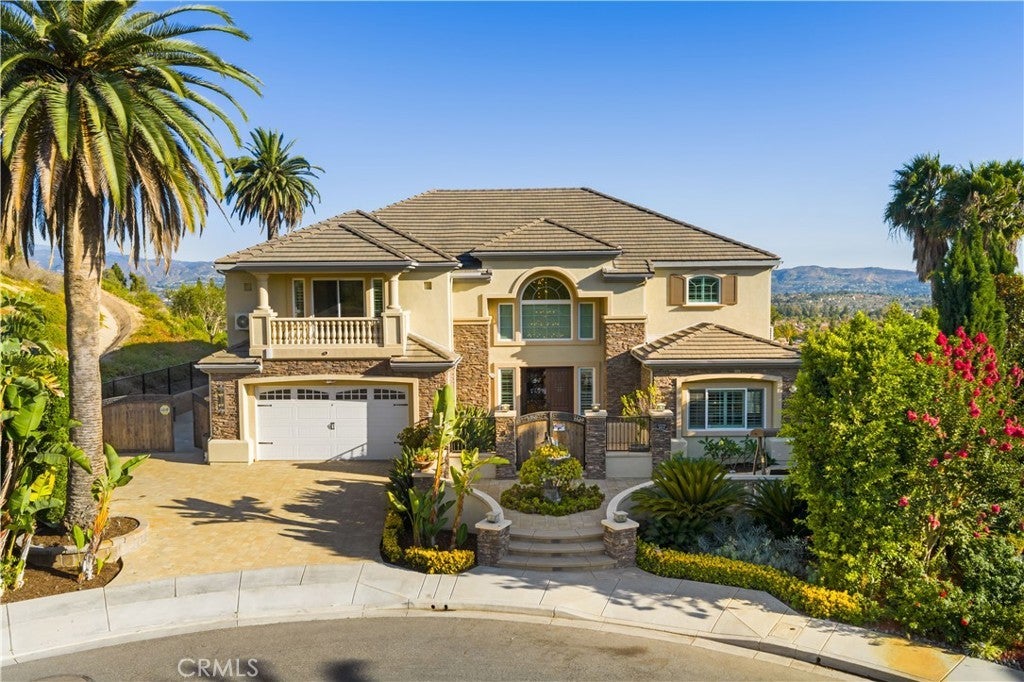Exquisite Toll Brothers estate in the prestigious Amalfi Hills community of Yorba Linda. This expanded luxury residence offers 6 bedrooms and 6.5 baths on over 30,000 square feet of lot. Originally 5,826 square feet, the home has been thoughtfully enhanced with permitted additions, including a private upstairs gym, office, additional ensuite bedroom and California room, bringing the total to nearly 6,600 square feet of refined living space. The grand entry welcomes with soaring ceilings, sparkling crystal chandeliers, all-tile and marble flooring, marble molding, striking marble pillars, a travertine accent wall, and marble fireplace. Indoor/outdoor living is highlighted by lanai sliding doors and a custom dual-panel retractable screen system with blackout and mesh options. Crystal lighting throughout enhances the timeless elegance. The Show kitchen features premium granite countertops, all Miele built-in appliances including coffee maker, microwave, 6-burner range with oven, designer hood, dishwasher, and an 8-ft floor-to-ceiling wine and beverage cooler. A separate chef’s prep kitchen with Samsung appliances provides additional convenience for entertaining. Two en-suite bedrooms are located downstairs. Upstairs, one wing is dedicated entirely to the primary retreat with panoramic views, private gym, office, movie lounge, and a spa-inspired bathroom featuring a custom round soaking tub. The opposite wing offers three ensuite guest rooms, creating a thoughtful and private layout for all. Resort-style outdoor living includes a pool with water wall and connected heated spa, outdoor fireplace, built-in BBQ, putting green, custom fire pit lounge, and ample seating areas and RV/boat parking. Upgrades include fully paid solar, two new AC condensers, two tankless water heaters, whole-home water softener, and EV charger. Feng shui elements are thoughtfully integrated throughout the property. Located in North Yorba Linda Hills with award-winning schools, this estate is a rare combination of architectural beauty, modern efficiency, and turnkey modern living. Come see and appreciate your new home...see the video walk-through!!!