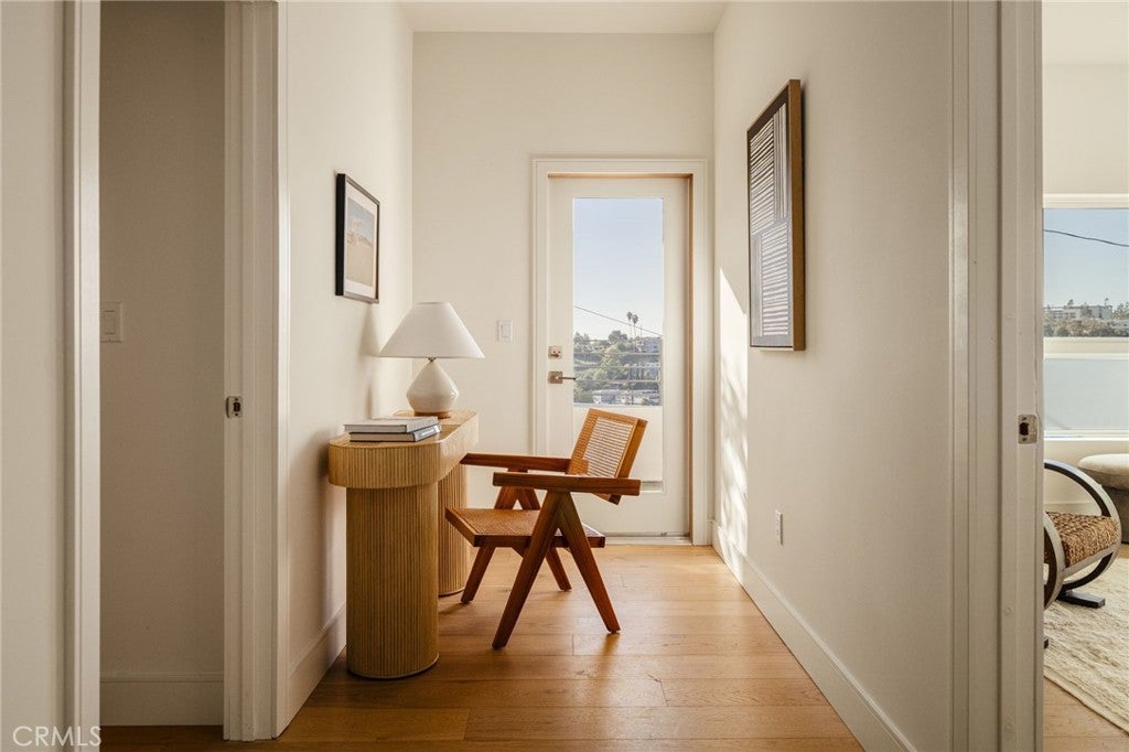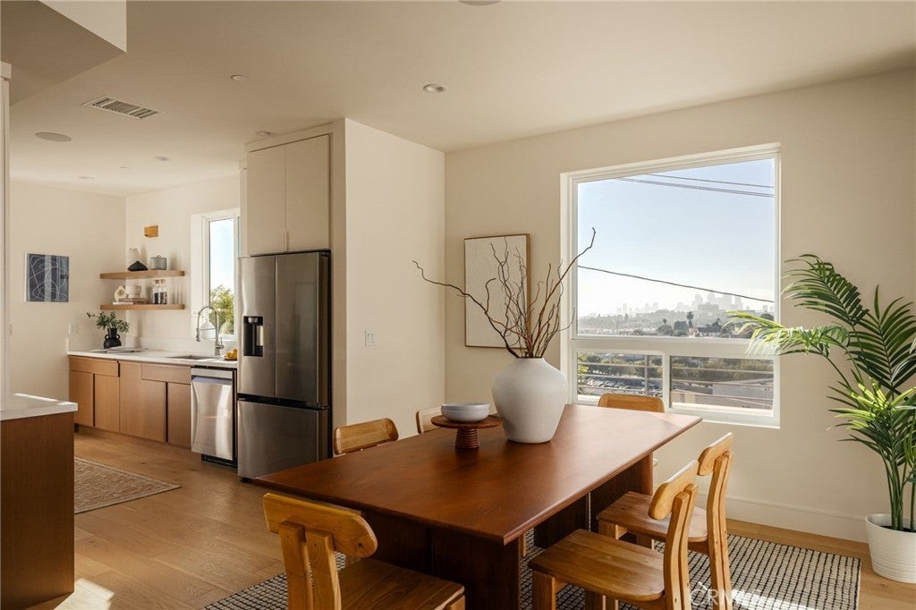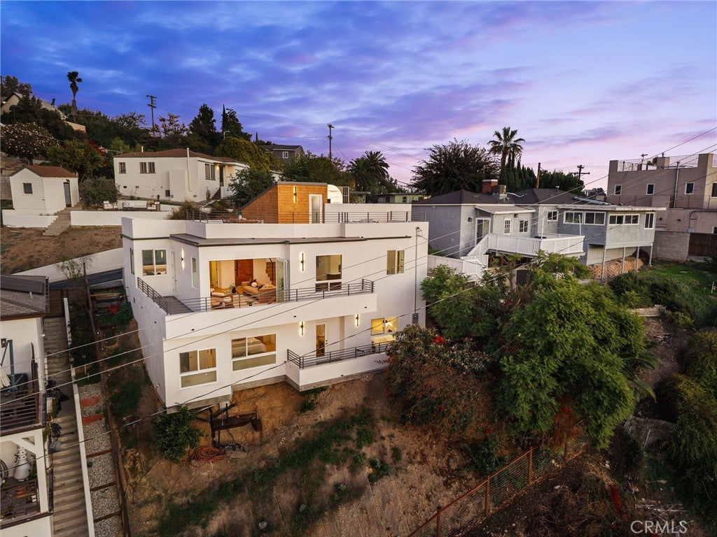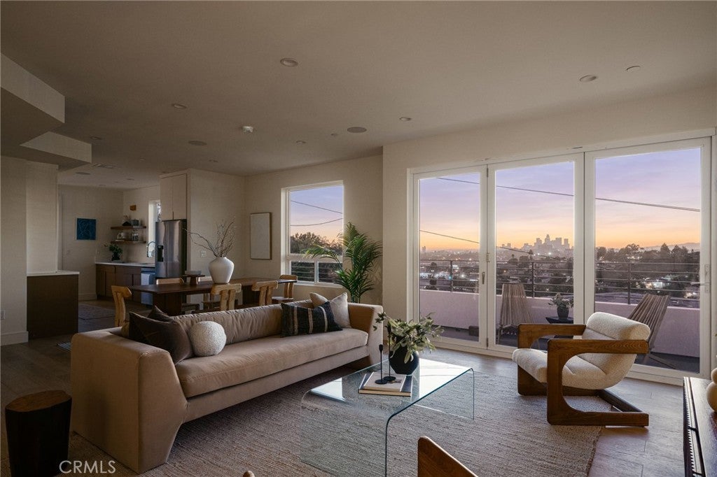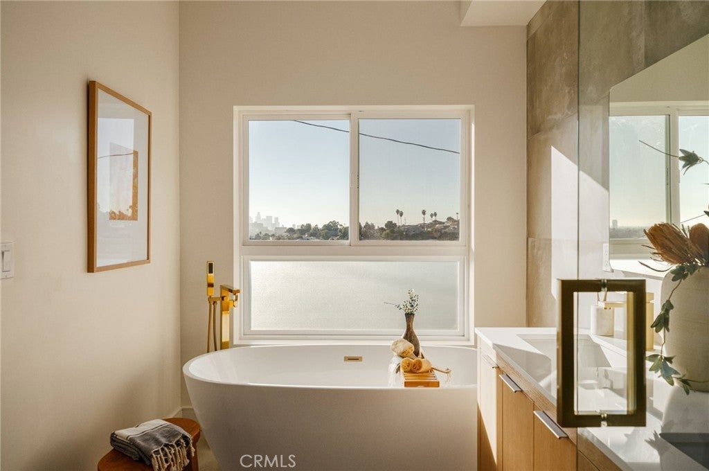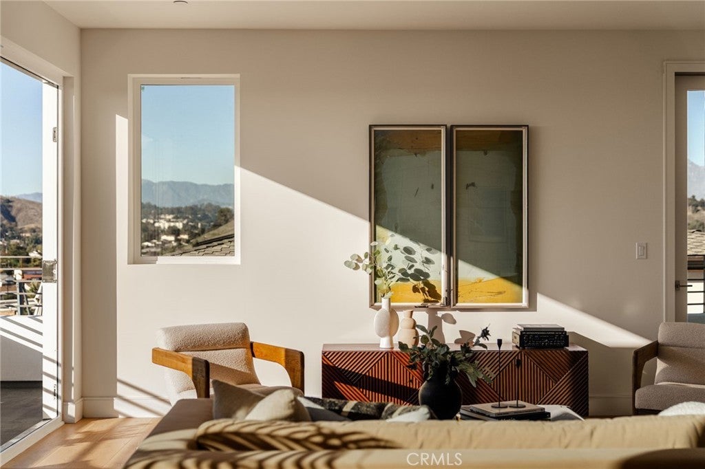 Newly constructed in University Hills, 1919 Seigneur Ave embodies a vision of an angel nestled within the City of Angels. The home feels as if it unfolds its wings onto the hillside, welcoming you with panoramic views of the Downtown LA skyline and San Gabriel Mountains. Inside, stunning city and mountain views become the backdrop from almost every room, grounding daily life in the city's ever-changing skyline. The main level features an airy open floor plan anchored by warm engineered wood floors and trifold doors in the living room that dissolve the boundary between indoors and outdoors, opening to a wraparound balcony that floats above the hillside. Carefully framed openings throughout the home capture curated moments of nature, light, and views. Adjacent to the dining room, the custom kitchen showcases handcrafted maple and white oak cabinetry, a bespoke stove hood, and a full appliance package blending modern function with natural textures. A bedroom and full bath on the main level offer flexibility for guests or workspace. Upstairs, a rooftop deck crowns the residence-a private perch for sunrise coffee or phenomenal sunset views over the city perfect for entertaining. Downstairs, find two primary suites, each walk-in closets and views offering a direct connection to the surrounding landscape. The spa-inspired ensuite bath features a soaking tub overlooking the skyline, a standing shower, dual sink vanity with a backlit mirror. A corridor leads to an outdoor balcony and steps down to the backyard terrain. An attached two-car garage offers direct interior access. Amenities include all brand new systems from the foundation to the roof to new sewer systems, plumbing, new HVAC, dual pane windows, built-in speakers on the main level, new solar panels, rain gutters, etc. Ideally located near Ascot Hills Park, Cal State LA, and minutes from local favorites like Evil Cooks, Lil' East Coffee, Los Dorados LA, Holy Grounds and more. Short drive to DTLA, USC Medical, NELA and offers easy access to freeways and public transit.