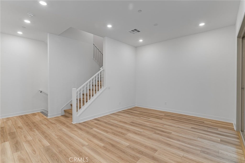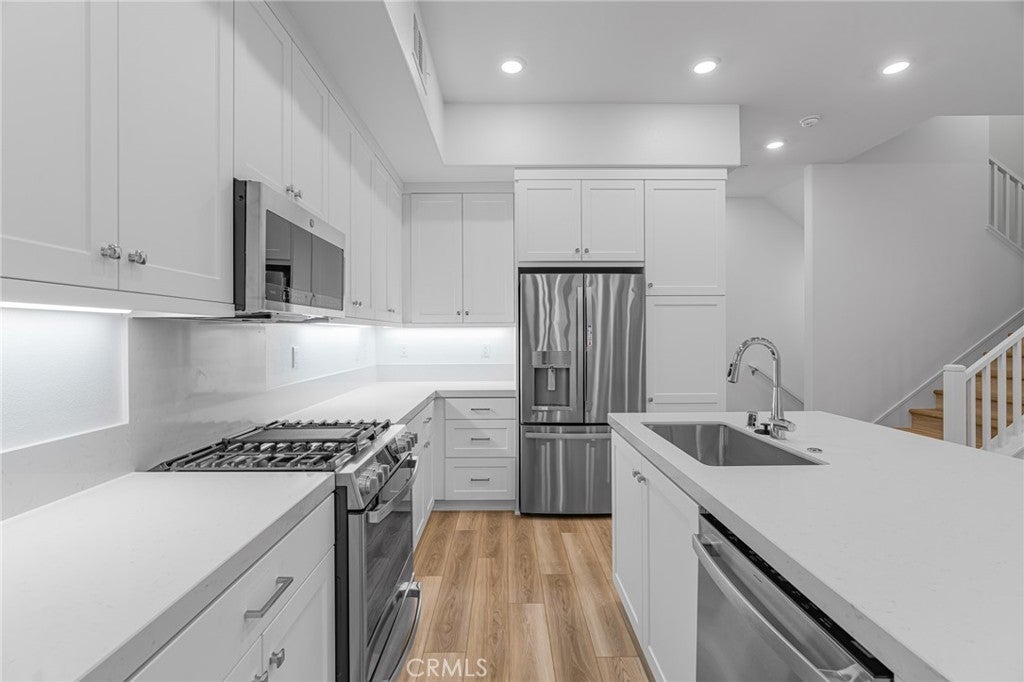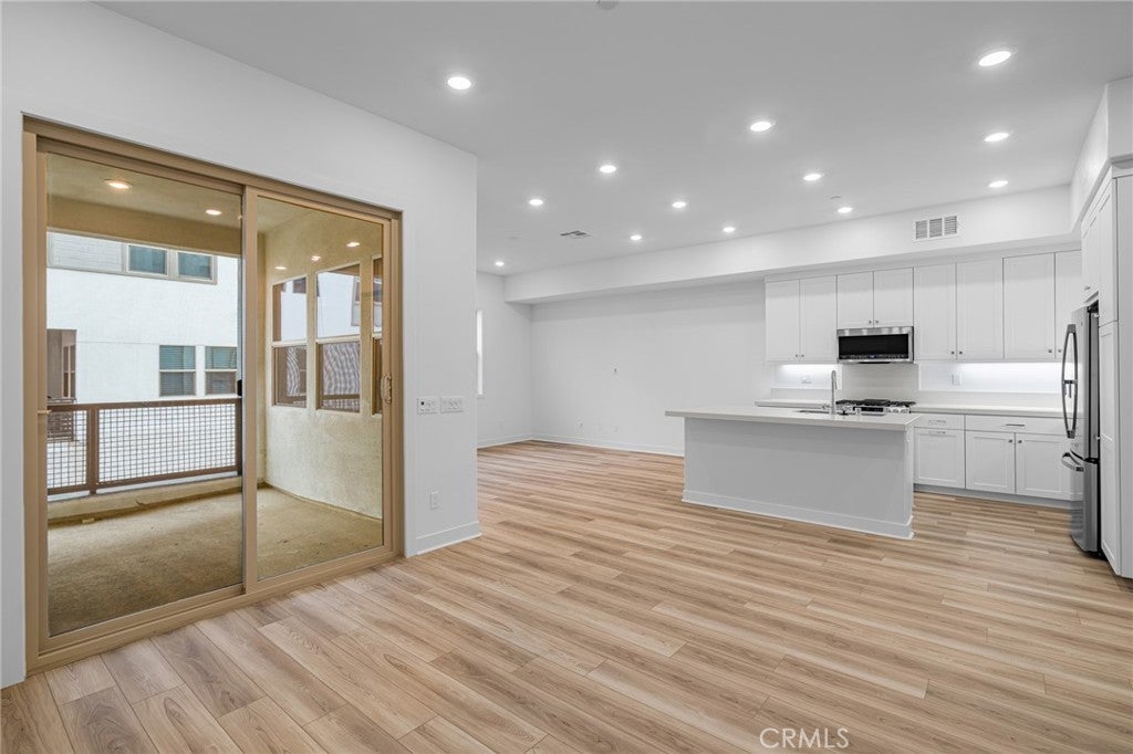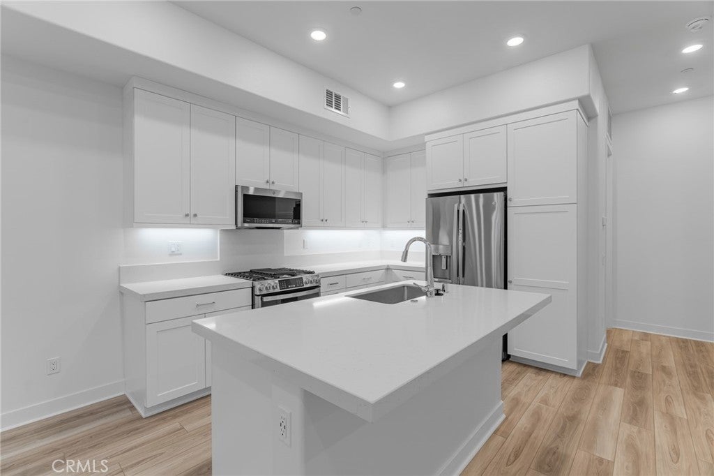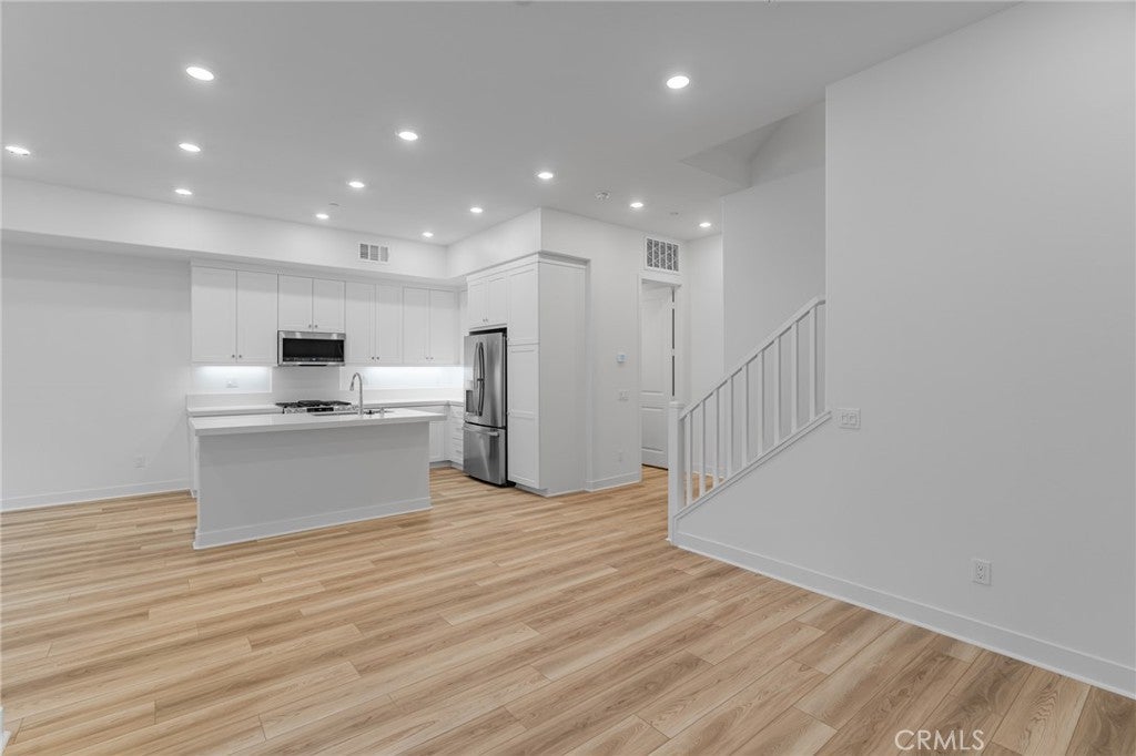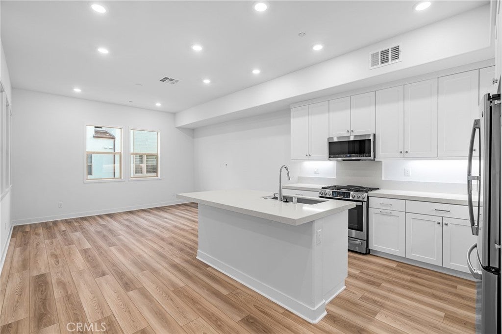 Welcome to this modern tri-level townhome featuring bright open living and a private rooftop deck. The main level offers a spacious great room with recessed lighting, luxury vinyl flooring, and an upgraded kitchen with white shaker cabinets, quartz countertops, stainless steel appliances, and a large island. Enjoy a covered balcony plus a generous rooftop terrace perfect for relaxation or entertaining. Additional features include an attached 2-car garage, in-unit laundry, and contemporary finishes throughout. Located in a newer Montebello community close to shopping, dining, freeways, and minutes from DTLA, this move-in ready home offers comfort, style, and convenience.