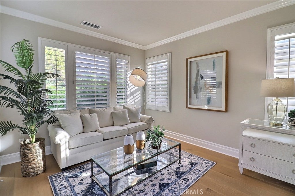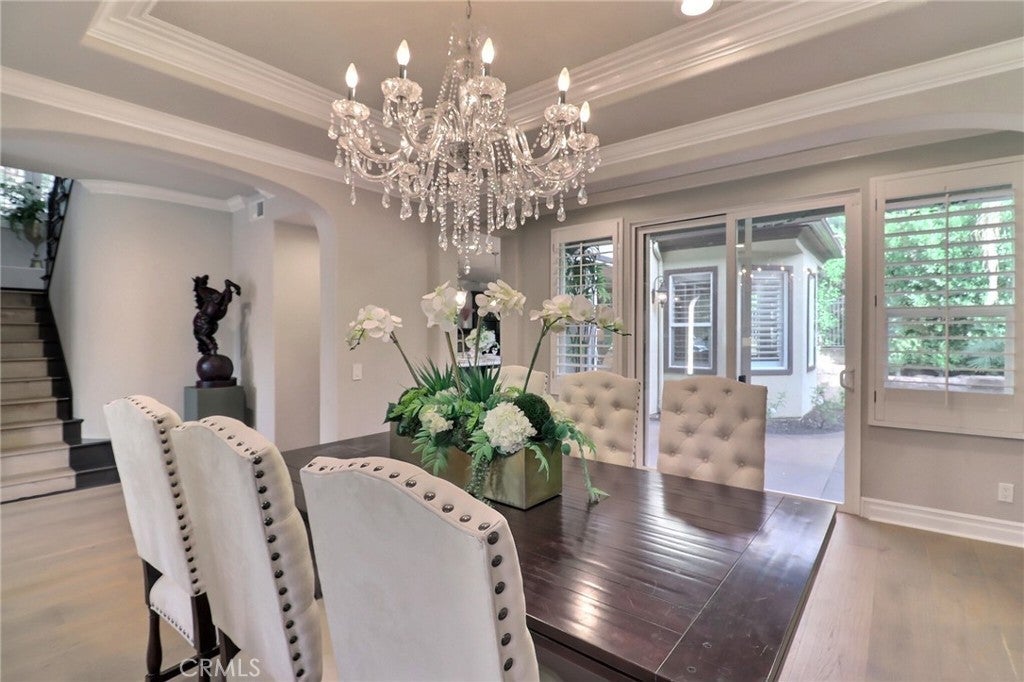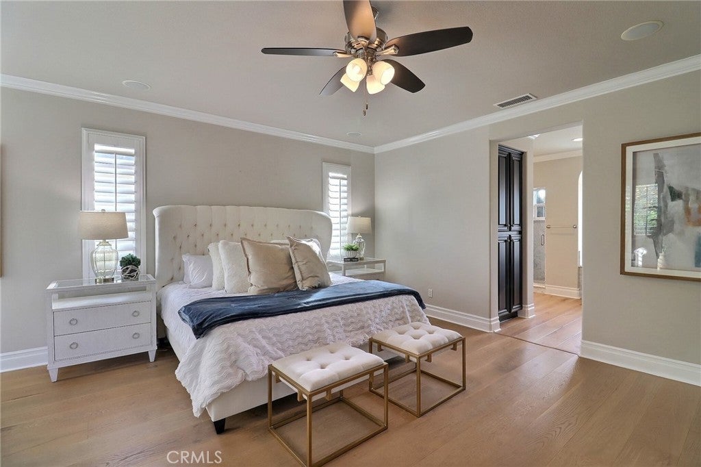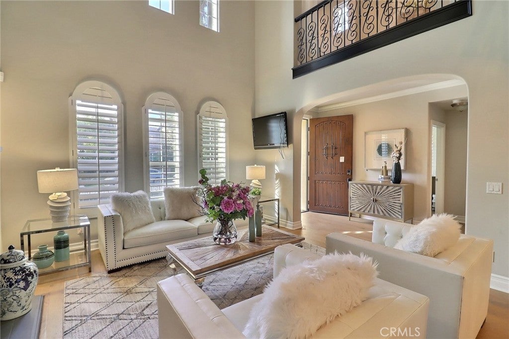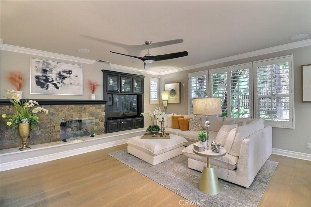 Situated behind the gated community of Stoneridge, this well-appointed residence offers elevated positioning, an open-concept floor plan, and extensive upgrades throughout. A formal entry leads to a bright interior featuring vaulted ceilings, abundant natural light, and brand-new engineered wood flooring throughout the home. The kitchen includes stainless steel appliances, a center island, stone countertops, custom cabinetry, and a spacious walk-in pantry, opening to an oversized family room with breakfast nook and built-in entertainment center. A main-level bedroom with a full bathroom offers flexibility for guests or extended family. Upstairs features a primary suite with a sitting area and balcony overlooking the pool and outdoor entertaining area. The primary bathroom includes dual vanities, stone countertops, custom cabinetry, and his-and-her walk-in closets. Two additional bedrooms, a versatile loft, and an upstairs laundry room with cabinetry and sink complete the second level. Additional features include custom shutters, barn doors, hard-surface flooring, wrought-iron staircase, and crown molding. The private backyard includes a pool and spa, built-in BBQ, and mature landscaping. Attached three-car garage with epoxy flooring. Property includes access to Lake Mission Viejo.