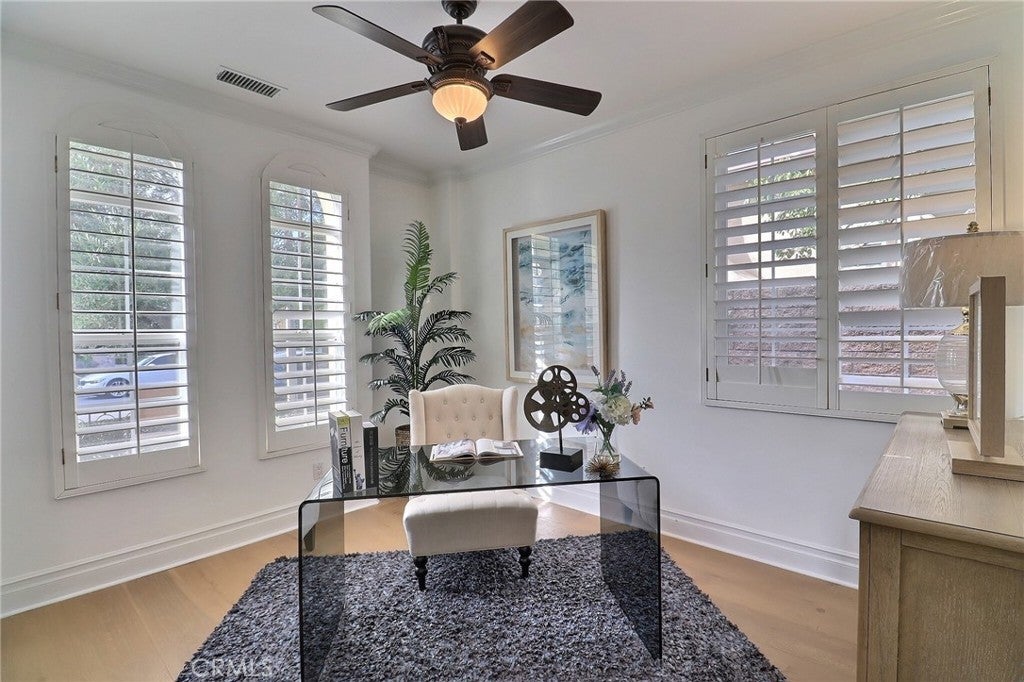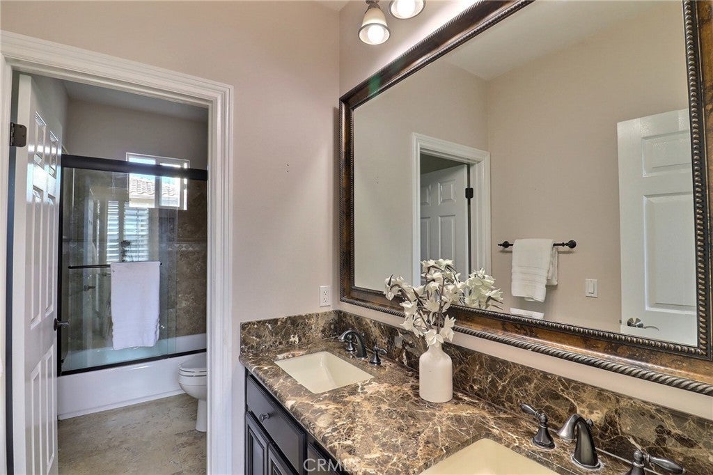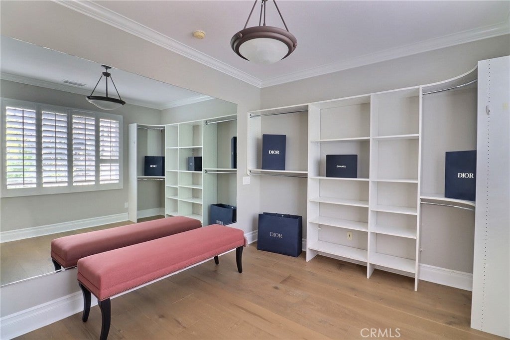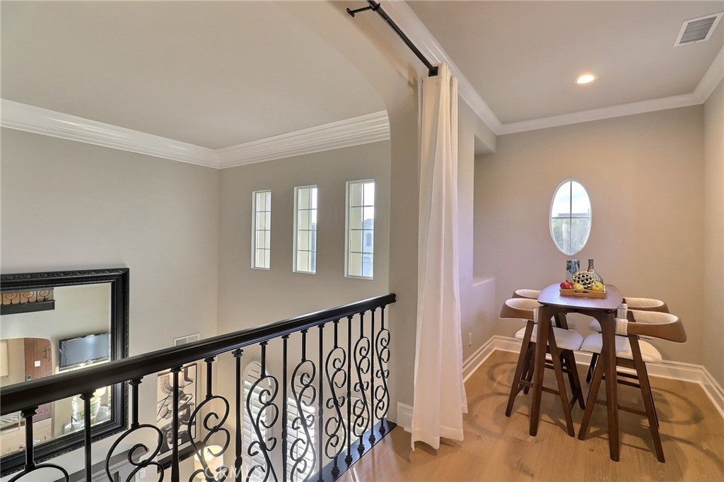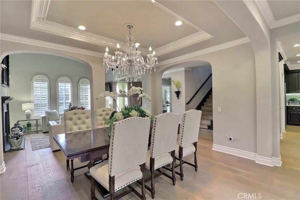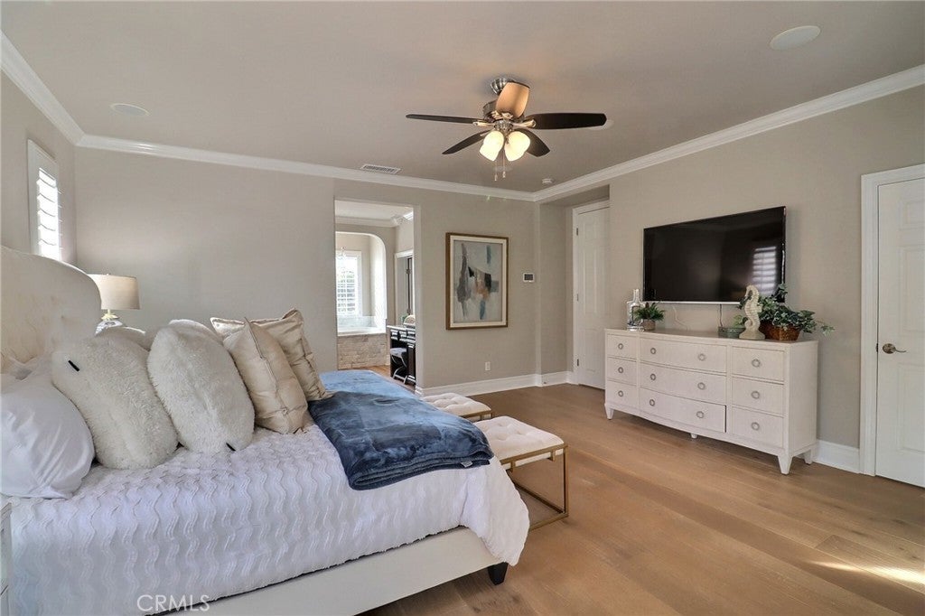 Situated behind the gated community of Stoneridge, this well-appointed residence offers elevated positioning, an open-concept floor plan, and extensive upgrades throughout. A formal entry leads to a bright interior featuring vaulted ceilings, abundant natural light, and brand-new engineered wood flooring throughout the home. The kitchen includes stainless steel appliances, a center island, stone countertops, custom cabinetry, and a spacious walk-in pantry, opening to an oversized family room with breakfast nook and built-in entertainment center. A main-level bedroom with a full bathroom offers flexibility for guests or extended family. Upstairs features a primary suite with a sitting area and balcony overlooking the pool and outdoor entertaining area. The primary bathroom includes dual vanities, stone countertops, custom cabinetry, and his-and-her walk-in closets. Two additional bedrooms, a versatile loft, and an upstairs laundry room with cabinetry and sink complete the second level. Additional features include custom shutters, barn doors, hard-surface flooring, wrought-iron staircase, and crown molding. The private backyard includes a pool and spa, built-in BBQ, and mature landscaping. Attached three-car garage with epoxy flooring. Property includes access to Lake Mission Viejo.