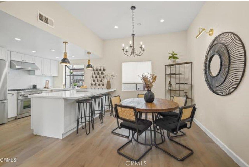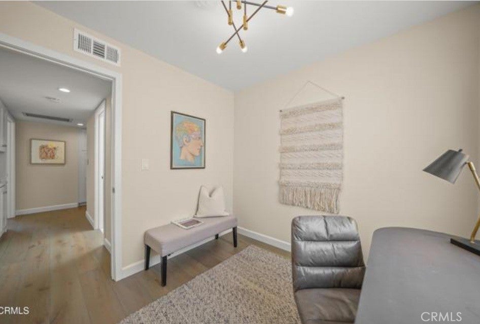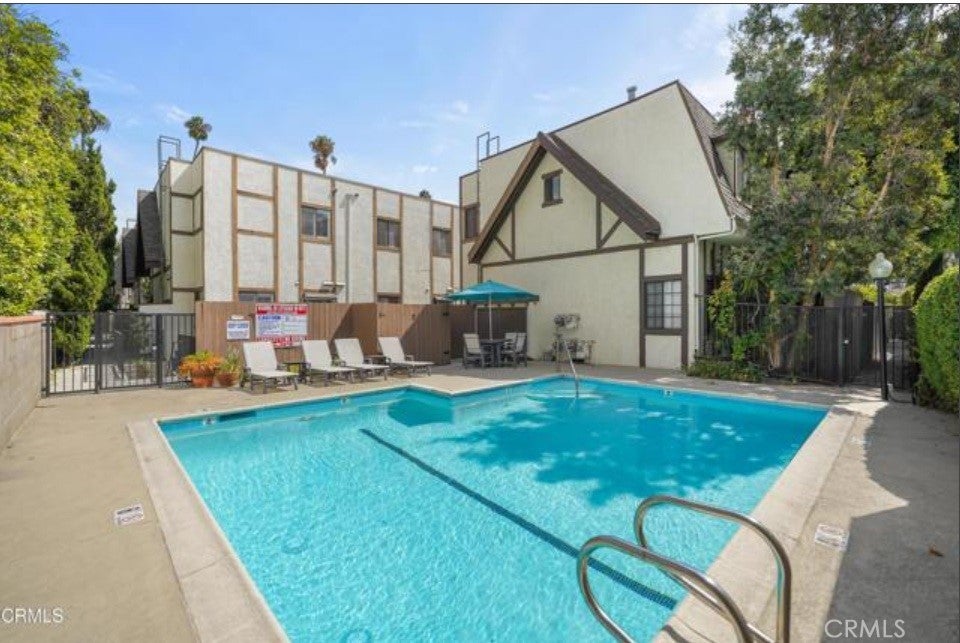 This wonderful townhouse features 2 bedrooms, 2.5 bathrooms plus an office/den and is within close proximity to an abundance of shopping, theaters, restaurants and grocery stores (such as Erewhon, Target and Trader Joe's). Enter through the private patio into the spacious living room, with ten-foot ceilings, recessed lighting and beautiful wood flooring. There is a spacious dining area off the newly renovated kitchen. The kitchen has stainless steel appliances, stone countertops with a breakfast bar and lots of storage. There is also a convenient laundry closet, complete with a new stackable washer and dryer. A powder room completes the main level of the home. On the second level, the primary suite has charming tree top views and a three-quarter bathroom with a skylight. There is a second bedroom off the hallway, plus an office/den and an additional full bath also with a skylight. Multiple built-in cabinets are also located in the upstairs hallway. Downstairs is a large, private attached two-car garage and there is a lovely pool in the complex. *Please note that the property is staged in the photos but the townhouse is being leased unfurnished.