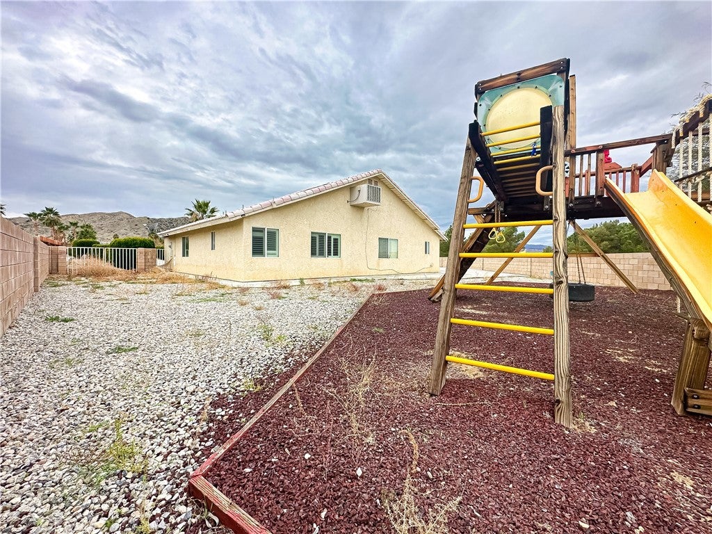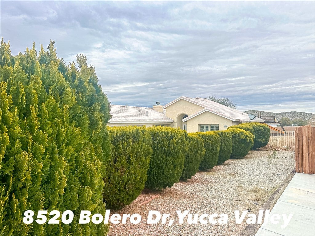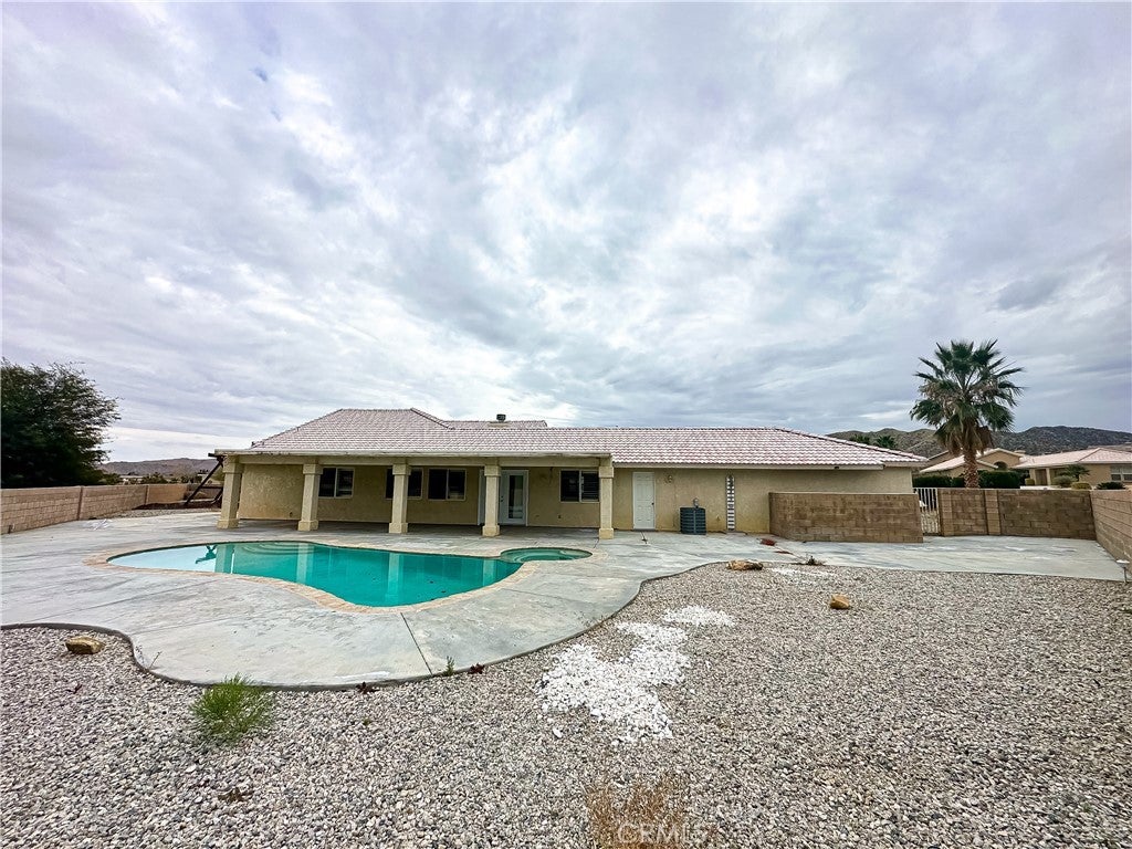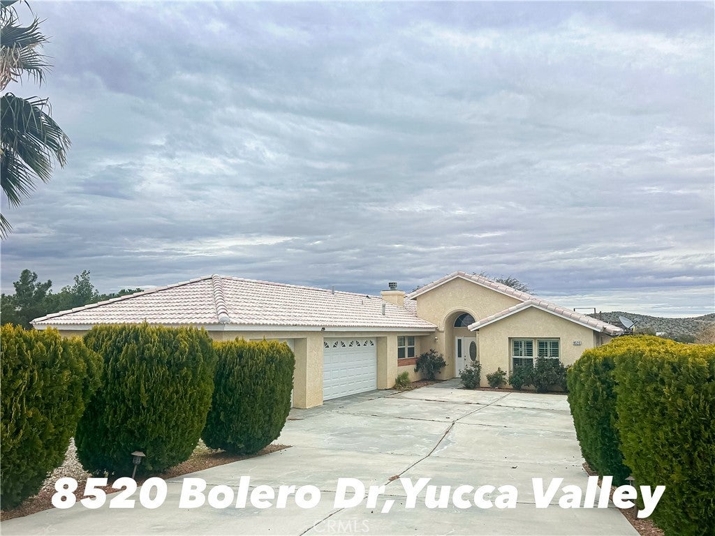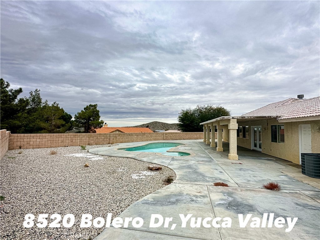 Discover your sprawling desert retreat at 8520 Bolero Dr. in Yucca Valley! Nestled on a generous 1.5 acre lot, this 5-bedroom,3-baths home(2027 Sq ft) balances space and opportunity. While carpets await your personal update, the home impresses with elegant 4-inch plantation shutters throughout and a kitchen offering direct access to an oversized 3-car garage and dual driveway. Relax in the master suite's spa-like bathroom featuring a Jacuzzi tub, dual vanity and separated tiled shower, while two bedrooms share a Jack & Jill bathroom with steam room--all baths showcase granite countertops. Step outside to private oasis: fully enclosed by block walls, the grounds include a sparkling pool, soothing spa, and lifetime-warranted Gorilla swing set. Enjoy unparalleled connivence with private Joshua Springs Christian School within walking distance, plus quick access to Home Depot, Walmart, Marshalls, dining, and Etc., Minutes from Joshua Tree National Park and hotspots like Pappy & Harriet's. Whether you are looking for a full time residence, a get away in the desert, or a turkey Airbnb, this property merges serenity with practicality--ready for your vision!
