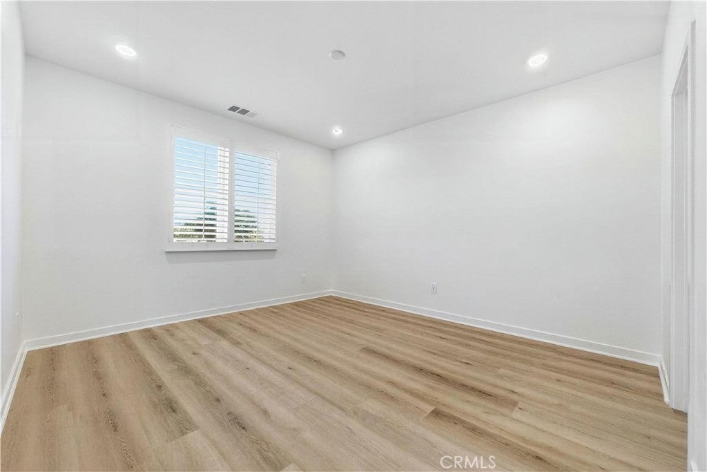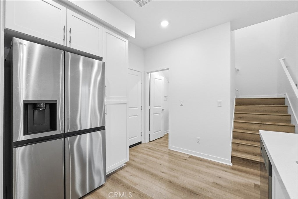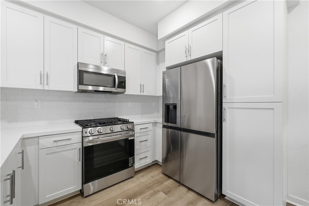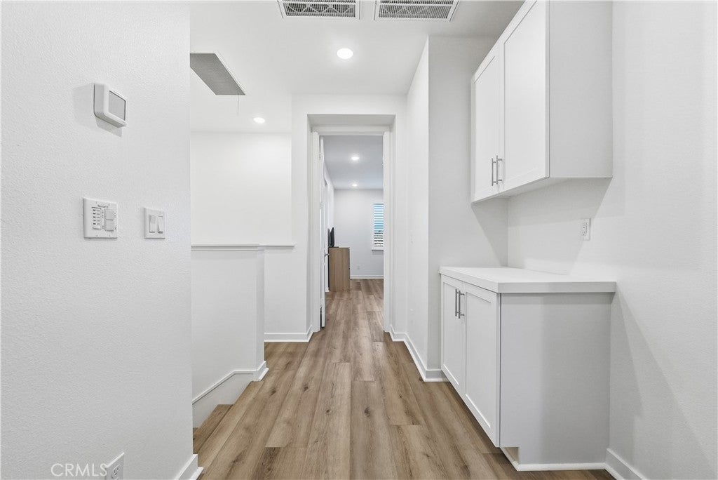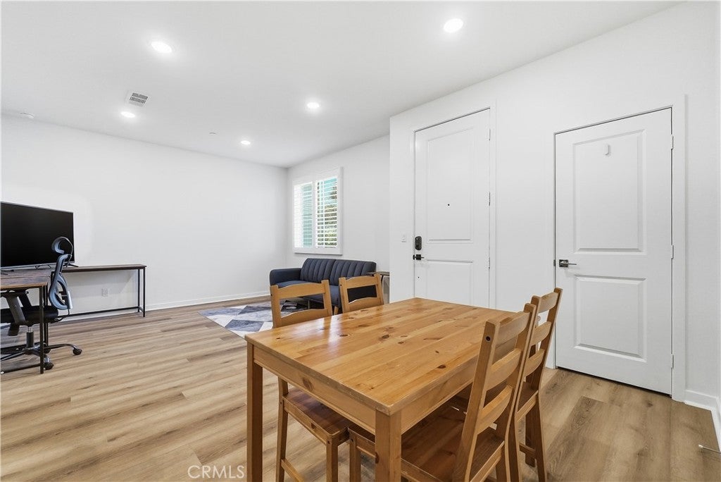 This 2025-built, two-story townhome at The Grove at Merced stands out for its clean layout, efficient use of space, and low-maintenance design. A fully landscaped front patio provides a genuinely usable outdoor area, well-suited for quiet mornings or relaxed evenings. The main level is designed with clarity and flow in mind. The living, dining, and kitchen areas connect naturally, creating an open feel without wasted space. The kitchen features quartz countertops, shaker-style cabinetry, a generous peninsula for seating, and a full suite of appliances, including a refrigerator, range, microwave, and dishwasher. LVP flooring throughout the main floor adds durability while maintaining a modern, streamlined look. A discreet powder room is conveniently positioned for guests without interrupting the living space. Upstairs, all three bedrooms are separated from the main living areas, offering added privacy and a quieter environment. The primary suite is well proportioned, comfortably accommodating full-size furniture, and includes a walk-in closet and an en-suite bath with dual sinks and a walk-in shower. Two additional bedrooms share a full bathroom, while the upstairs laundry area is thoughtfully placed to support everyday routines. The attached 2-car garage provides both parking and storage and is EV-charging ready. Additional features include dual-pane windows, a tankless water heater, and smart-home pre-wiring for a programmable thermostat and video doorbell. Solar panels offer long-term energy efficiency. With an open floor plan, modern finishes, and minimal maintenance requirements, this home is well-suited for buyers seeking a newer construction lifestyle in a convenient West Covina location. Community amenities, including BBQ areas and picnic spaces, further enhance everyday livability.