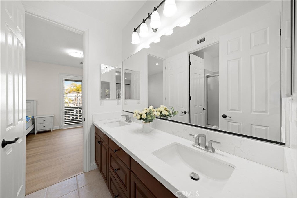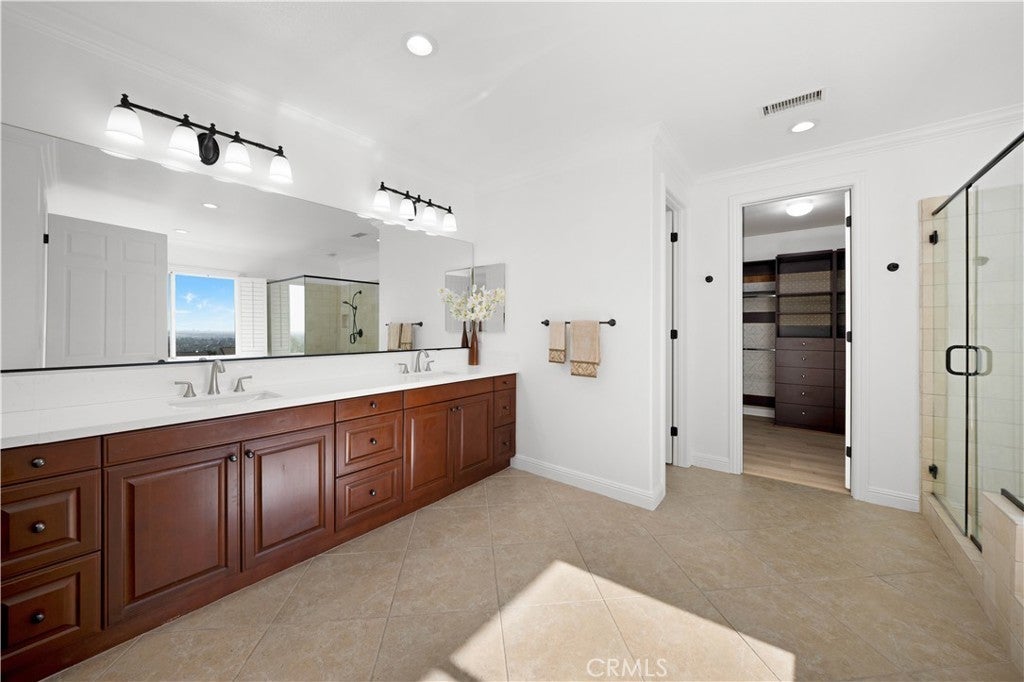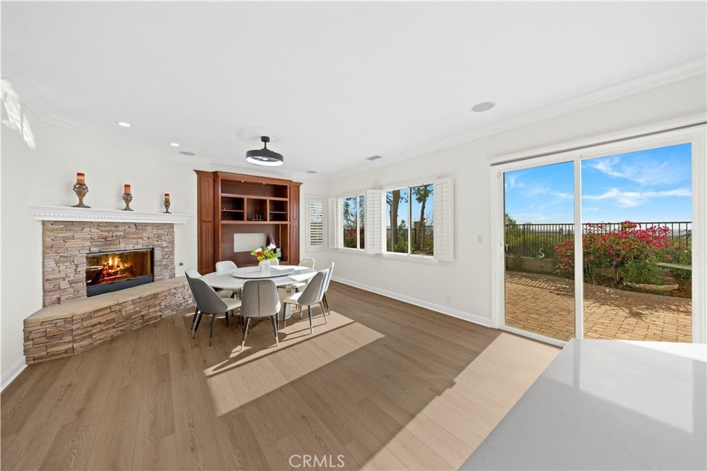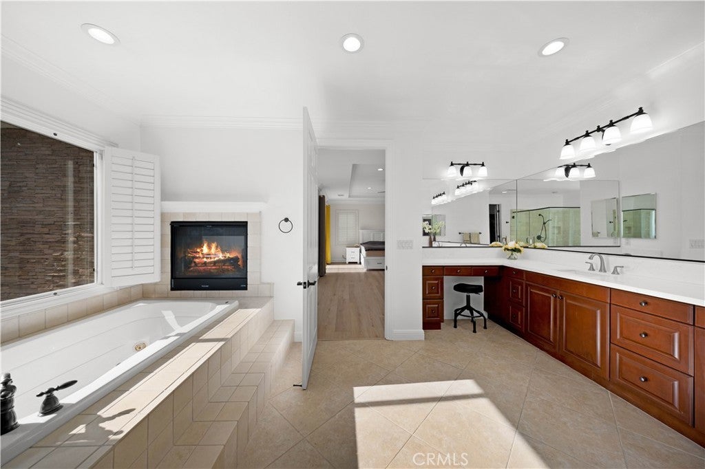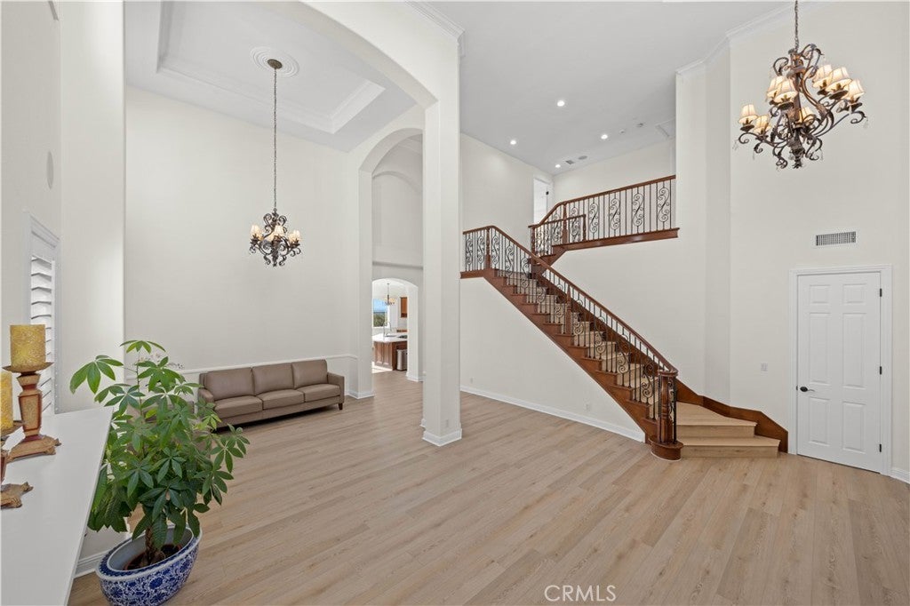 Exceptional Toll Brothers estate situated in the highly sought-after Vista Del Verde golf community of Yorba Linda, showcasing panoramic views of Orange county, Catalina Island, and magical Disneyland fireworks. This thoughtfully designed residence boasts 5 bedrooms and 3.5 bathrooms, highlighted by a soaring two-story high entrance with abundant natural light through the large windows and leading to the elegant living and dining room completed with an impressive fireplace. Two well appointed rooms are conveniently located on the main floor served by a full bathroom and a guest bath, with one room ideally for a home office. The chef's kitchen seamlessly opens to the family room featuring a stone fireplace, built-in media center, and a surround sound system perfect for everyday living and entertaining. The luxurious primary suite includes a warm dual fireplace and a cozy retreat area with expansive views, elevating the feeling of comfort and relaxation. The oversized master bathroom features a dual sink vanity with generous countertop space, a large sized walk-in closet, and a relaxing jacuzzi tub. Step out onto the private balcony off the master suite to enjoy the sweeping view and a serene setting for morning coffee or unwind at sunset. A tandem three-car garage provides a 50A power outlet for EV, built-in storage, and durable epoxy flooring. Recent improvements include remodeled bathrooms, a new AC system, fresh interior paint, hardwood flooring, and a brand new water softener. Additional features include plantation shutters and crown molding throughout the home creating a designer ambiance. Walking distance to Yorba Linda High School. Leased solar system to be assumed by the new owner. No HOA, No Mello-Roos. Don't miss out on this rare opportunity to own a beautifully upgraded home with spectacular views! Schedule your private showing today.