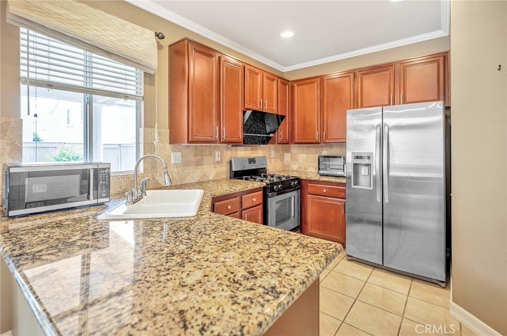 Masterpiece home located in the beautiful gated community of Independence at Terra Vista. This stunning home is loaded with upgrades! A welcoming entrance features beautiful landscaping and lush greenery. The home offers a high-ceiling living and dining room with custom window coverings and abundant natural light. The separate family room is perfect for entertaining, featuring a custom fireplace console, built-in cabinetry, and a premium stereo surround sound system with an integrated TV setup. The kitchen includes granite countertops, a cozy breakfast nook, and ample cabinet space. Granite countertops are also featured in all bathrooms. The home offers three spacious bedrooms and three bathrooms. The backyard is absolutely gorgeous and very private, surrounded by mature trees that create a peaceful, relaxing environment. Enjoy outdoor living with a built-in barbecue, an outdoor stereo system, and a beautifully covered patio? Additional features include a two-car garage with built-in cabinets and direct access to the house. Recent improvements include termite tenting with clearance, a newly installed range hood, and new LED ceiling lights. Conveniently located very close to schools, parks, shopping centers, and the Victoria Gardens Mall, with easy access to all major freeways.