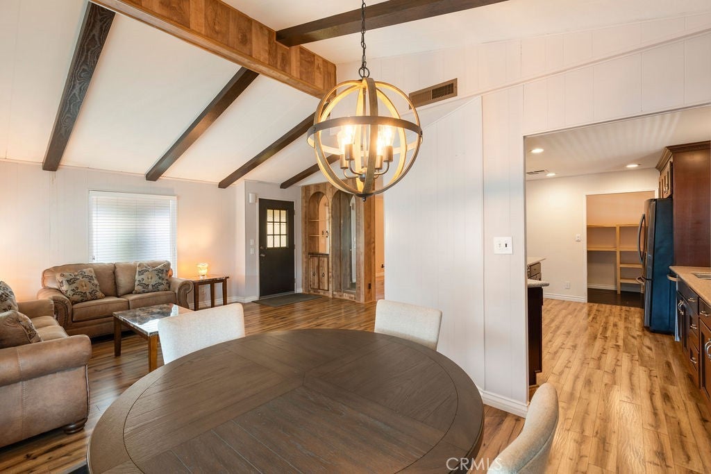 Welcome to the highly sought-after Lake Park Brea 55+ community! This beautifully maintained home reflects true pride of ownership from the moment you enter. The spacious living room features open beamed ceilings, new wood laminate flooring, updated baseboards, and an abundance of natural light. It flows seamlessly into the dining area, complete with a built-in hutch offering ample storage, and a wheelchair lift for the entryway and ADA upgrades inside! Around the corner, you’ll find a stunningly remodeled kitchen boasting new soft close cabinetry, recessed lighting, granite countertops with tile backsplash, stainless steel appliances, and stylish pendant lighting over a cozy eat-in bar. Adjacent to the kitchen is a convenient laundry room with a sink and additional storage. The kitchen also opens to a generously sized family room with a new dual pane sliding glass door leading to a large covered patio, perfect for relaxing in privacy on cool evenings. The primary suite includes a walk-in closet with mirrored doors and plenty of storage, along with an en-suite bathroom featuring a separate shower, and dual sinks. A well sized second bedroom and full bathroom provide comfortable accommodations for guests. Additional upgrades include new blinds throughout, fresh interior paint, and newer major systems, including the roof, HVAC, and kitchen updates completed within the past few years. Residents enjoy resort-style amenities such as a pool, spa, clubhouse, fishing lake, tennis court, fitness center, and beautifully maintained greenbelts. Don’t miss the opportunity to see this exceptional home in person!